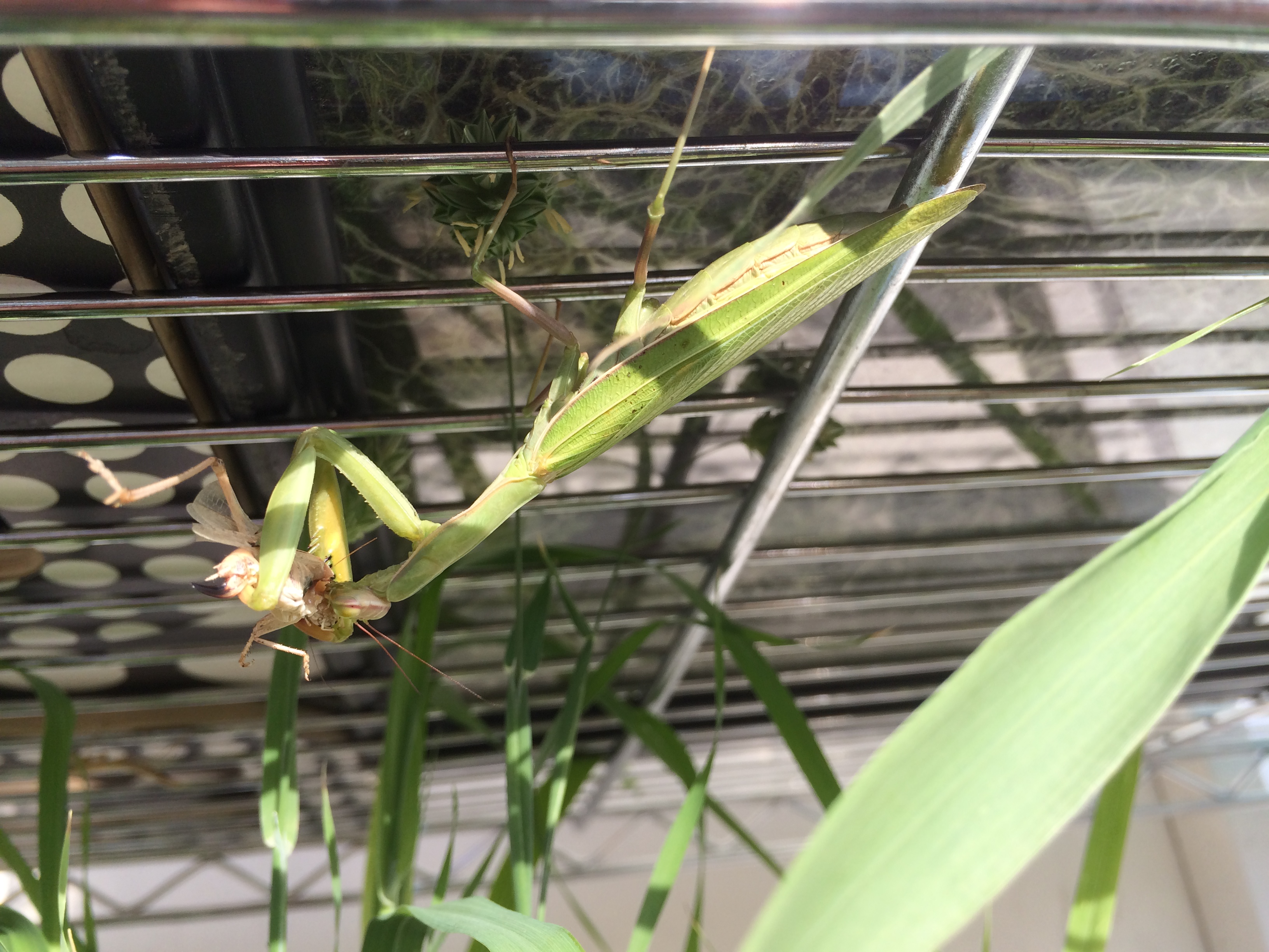 This one also enjoys an upside down meal. One problem researchers have raising mantids in the lab is that they always hang upside down from the lid of the cage, and it’s hard to get food up to them.
