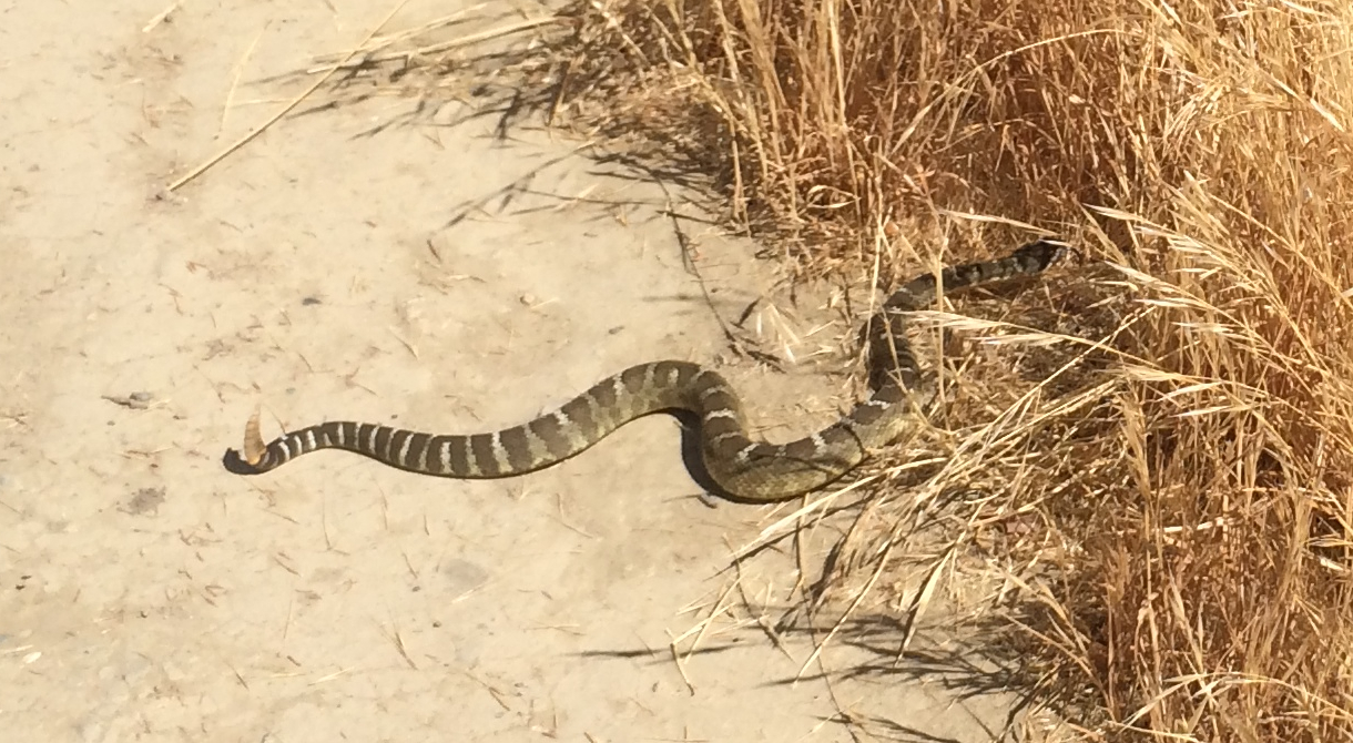 Within five minutes we met two rattlesnakes! The first was pretty small, about three feet long, curled in the grass right at the edge of the trail, buzzing noisily. It wanted to cross the trail. We watched it zip across and disappear into the grass.