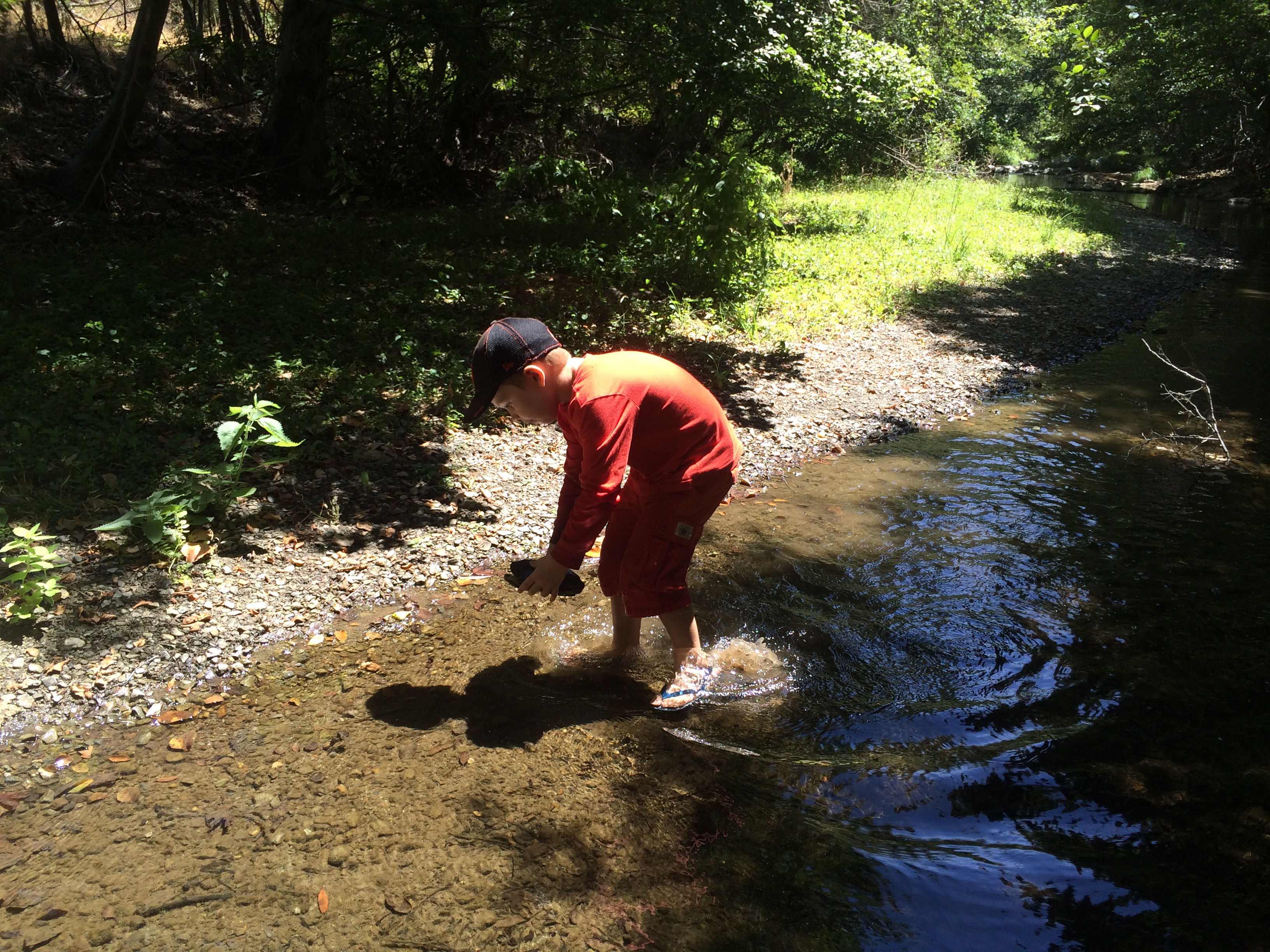 After a careful detour around the second rattlesnake, we crept down to the creek where everything was cool in the dappled crepuscule beneath the trees. While his grandparents rested on the bank, Kieran waded into the stream, catching many water striders (Genus Gerris) and also a fierce predatory true bug called a “toe biter.” We also captured a small crayfish, and put it into a bowl of water to watch it swim around and around.
