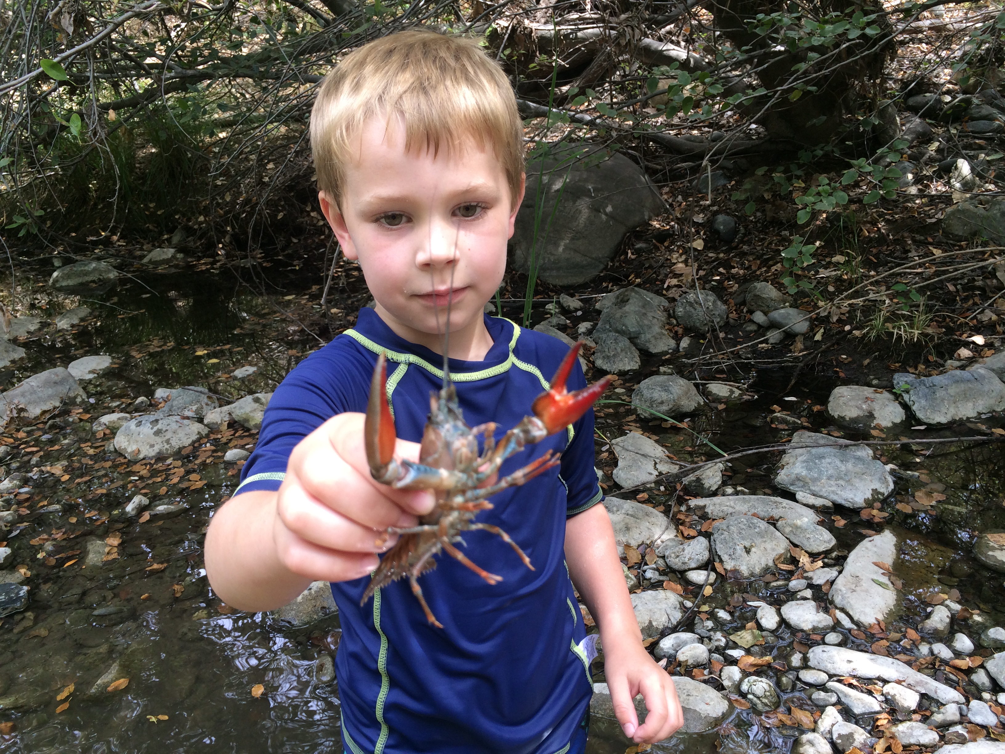 Sunday we returned to the same spot with one of Kieran’s friends and his father. This time we saw zero rattlesnakes, but we did catch a very large and very grumpy crayfish in the creek! I picked it up at first, carefully grasping its carapace behind the head, while those huge red claws sought to pinch me. I brought it to Kieran and asked if he wanted to hold it. He was not sure. But he’s been bitten by plenty of bugs and lizards over the years, as well as sprayed in the eye (more than once) by the chemical stink bombs of beetles, so I think he’s gotten used to it. After a moment’s hesitation, he agreed and took the fierce critter into his hands.