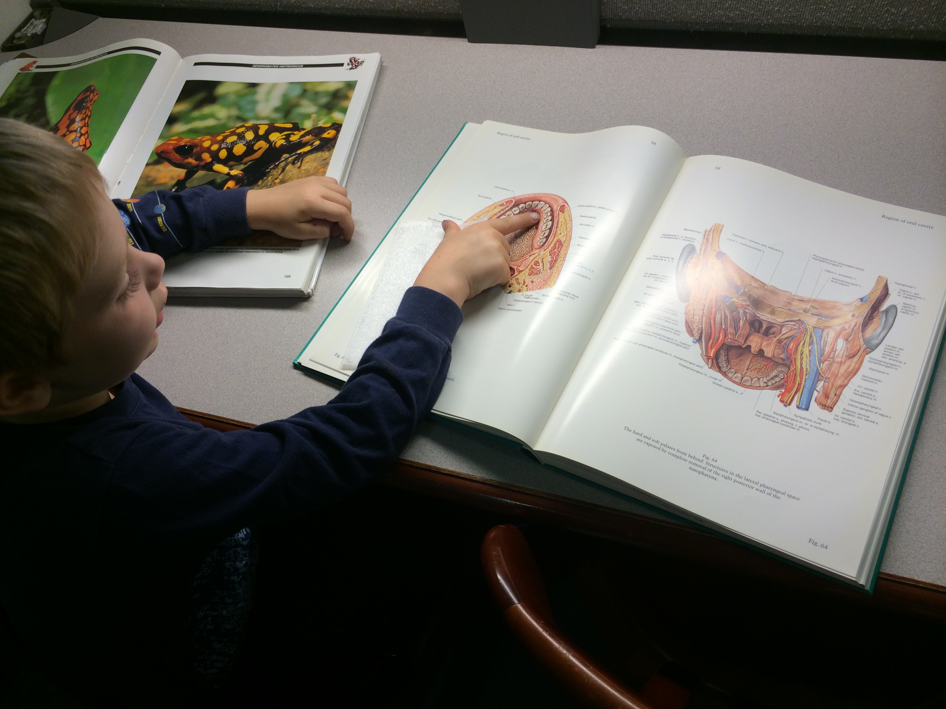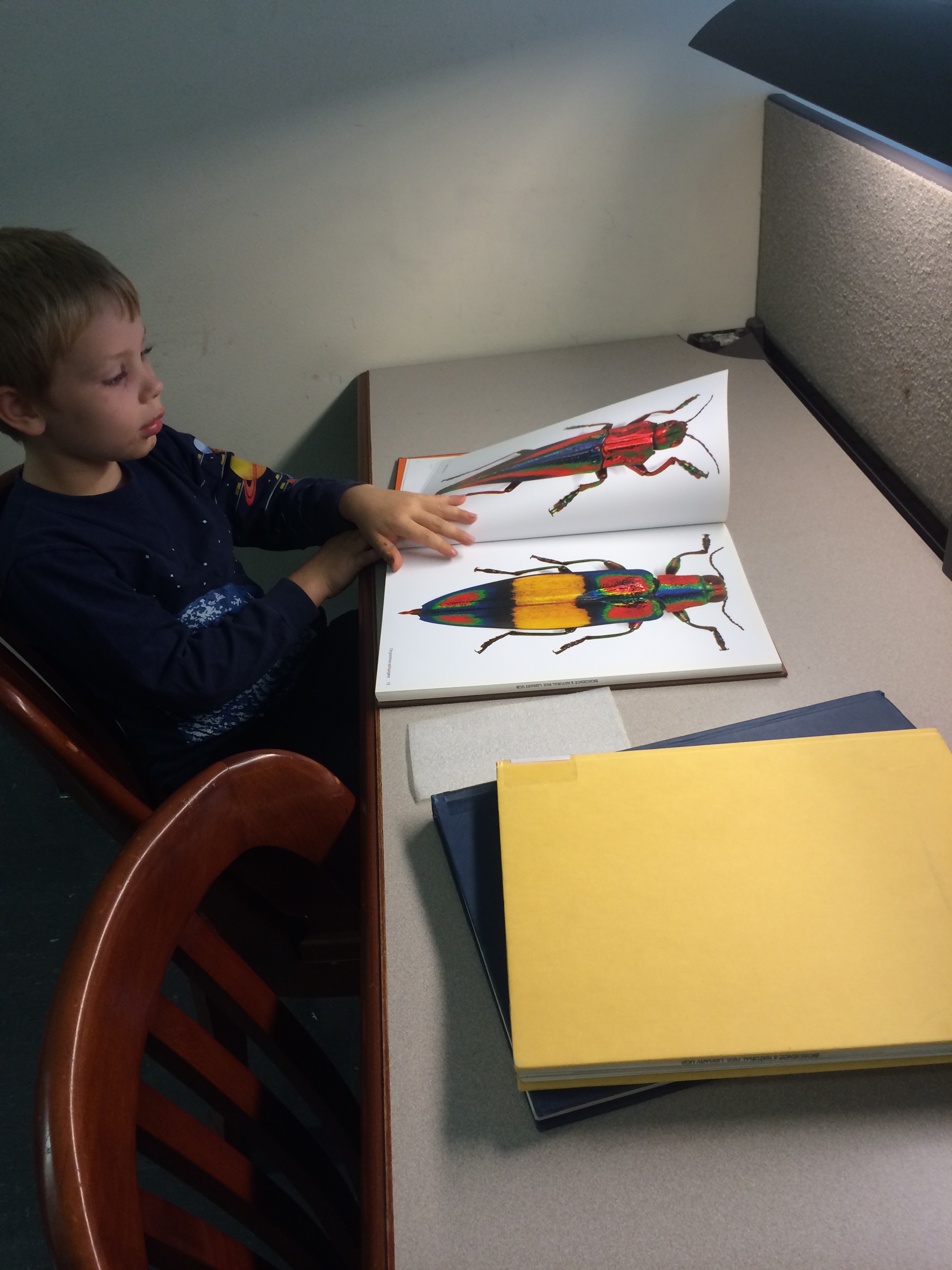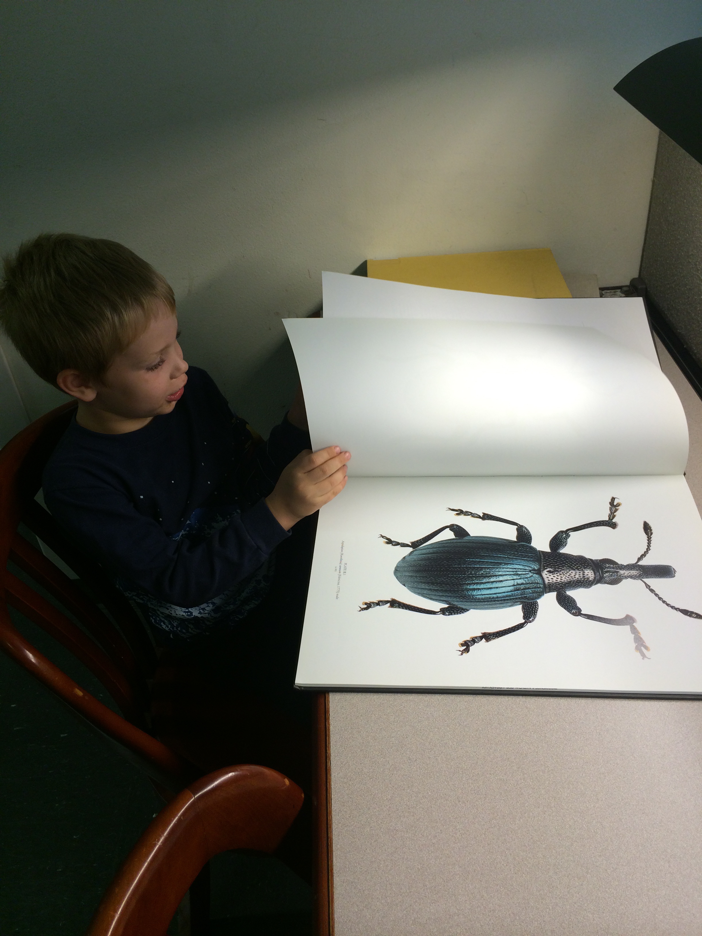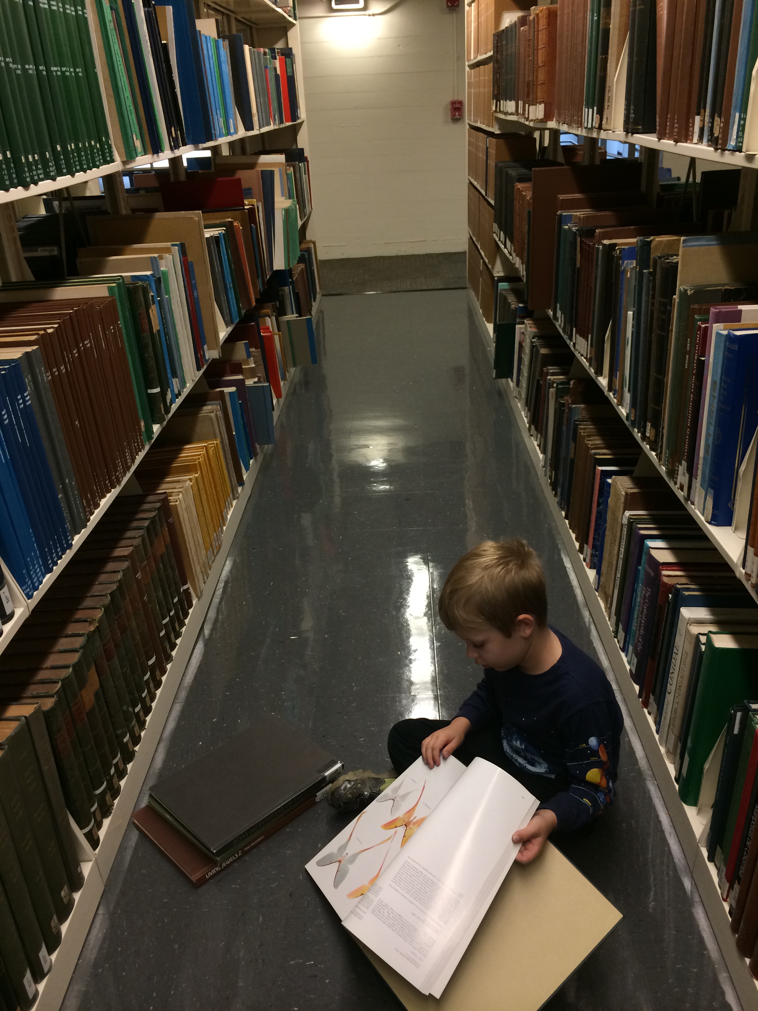 But I wanted Kieran to get a sense of all the amazing stuff in a university library, even for a little guy like him. We started by looking in a huge dictionary (he looked up the word beetle, big surprise) and then we went up to the top floor, where the oversize books are kept.
