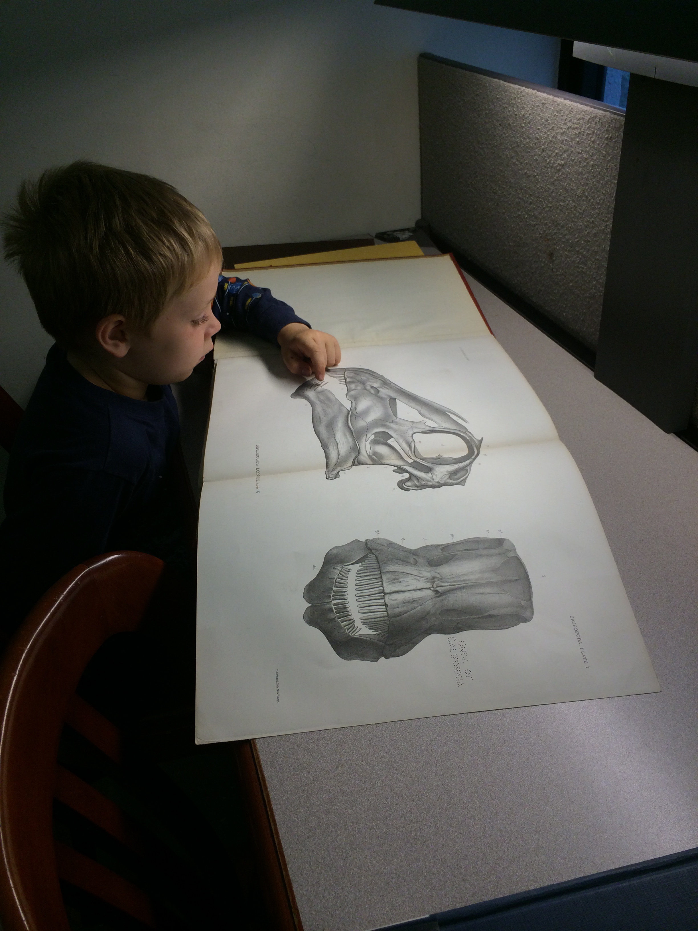 We looked through Othniel Marsh’s huge book on the Diplodocus, which has enormous, fold out leaves showing some of the bones at large scale — not quite life size, but big, big, big! Kieran counted the teeth of the Diplodocus in one of the fantastic drawings.