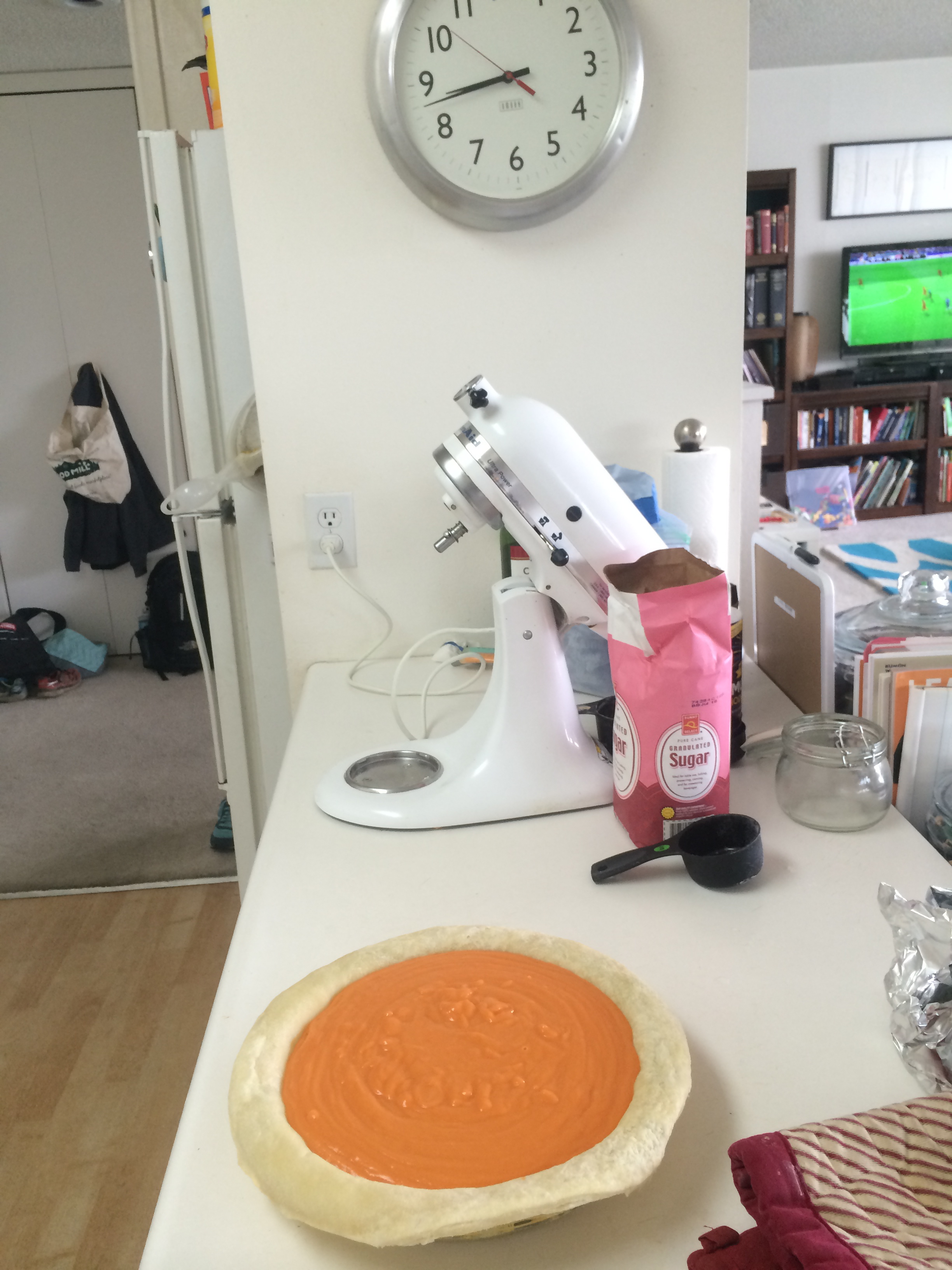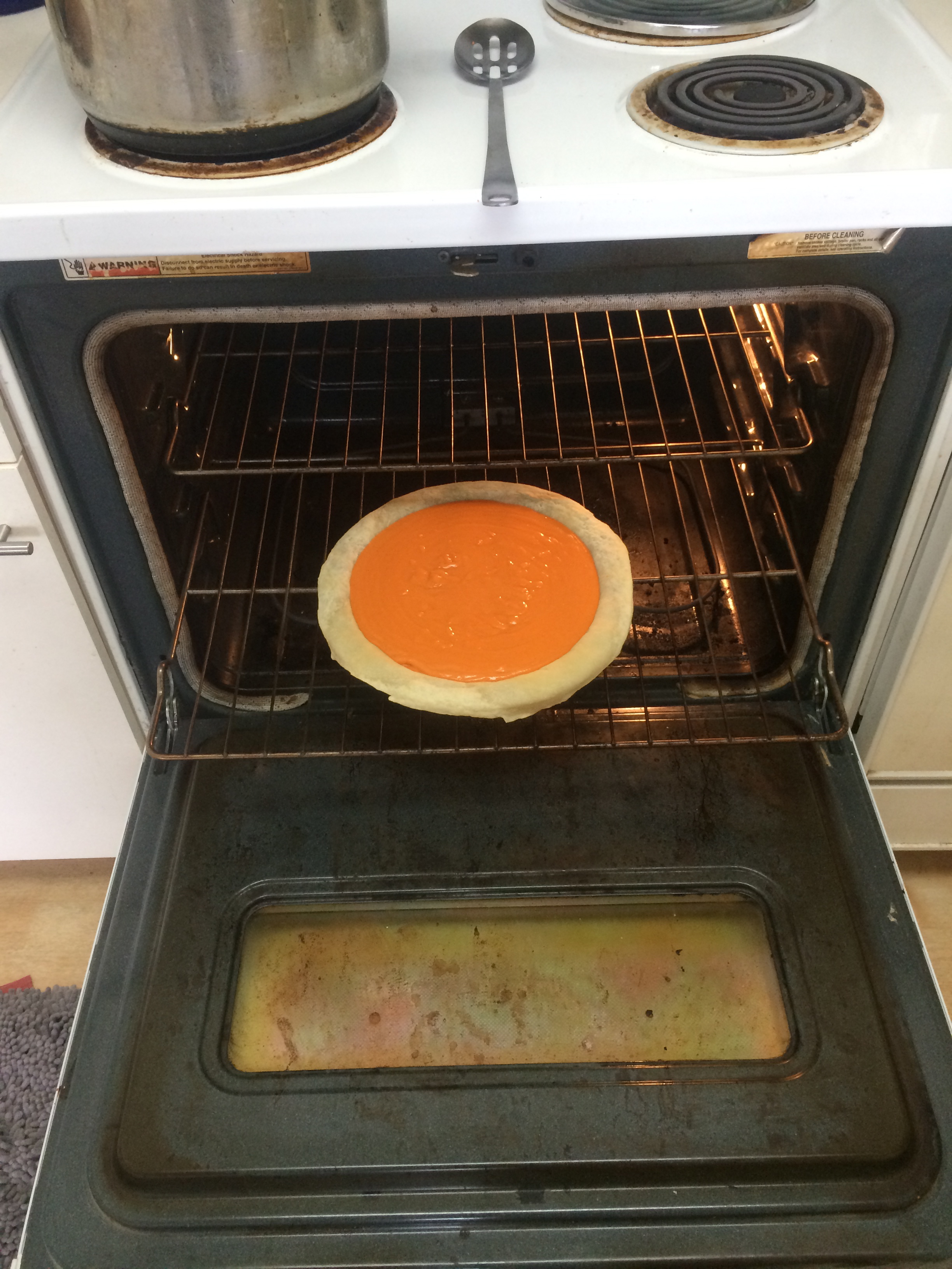 The crust was done baking by 8:33. Thirteen minutes at 350 degrees firmed it up a bit.