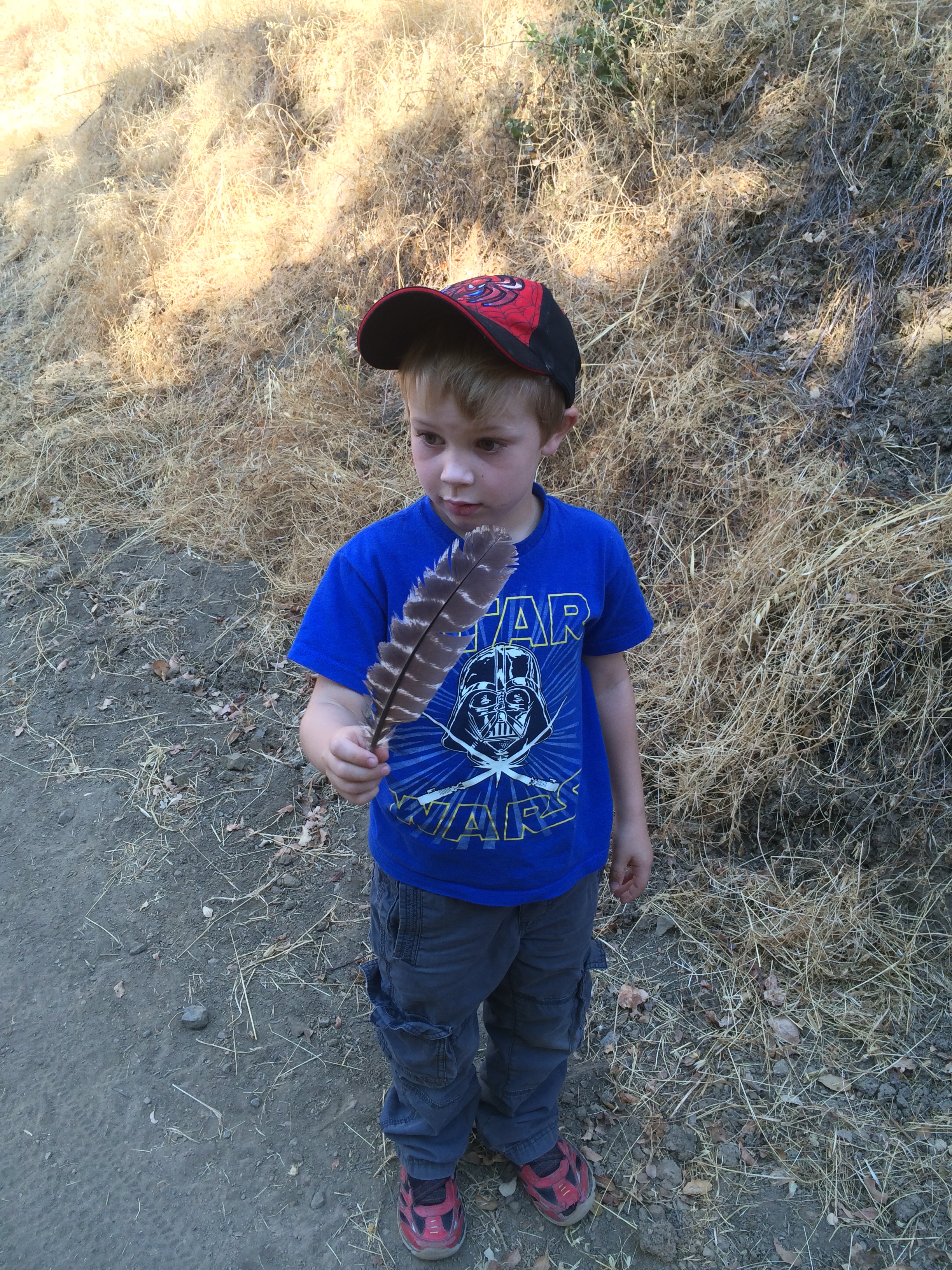 Kieran collected feathers as we explored, mostly from wild turkeys, whose dinosaurian footprints were visible in the dust of the trail.