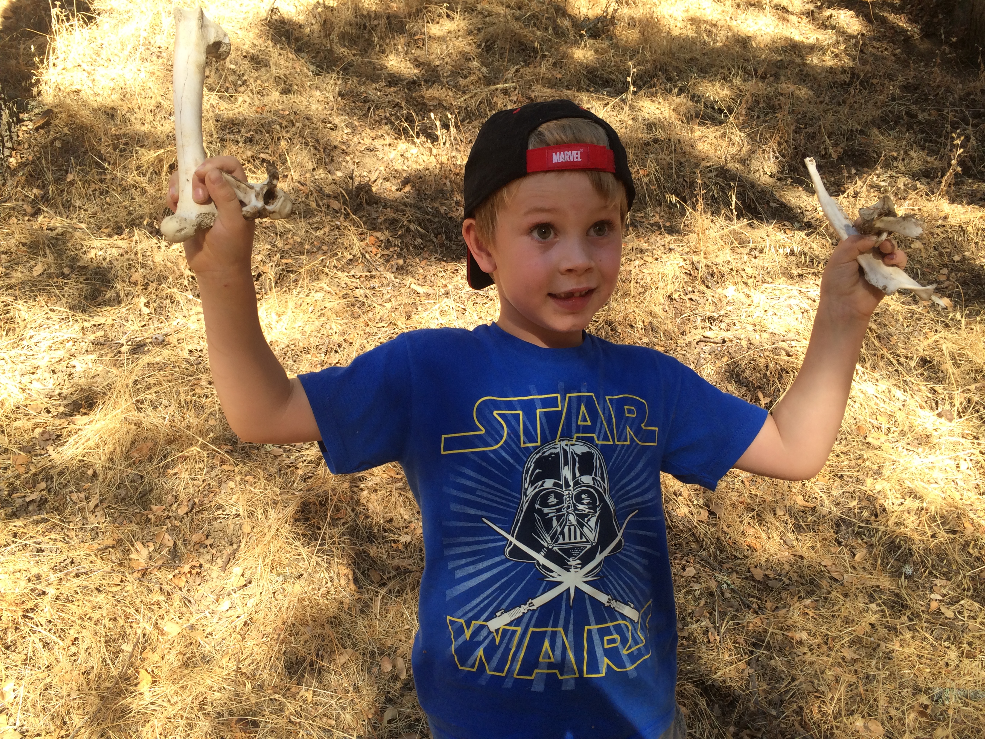Our main goal for this trip was quickly achieved, as we began finding many bones among the dry creek’s stones. We hypothesize that winter rains wash bones down, down, down the steep hills into the stream beds, and so far, our experience confirms this. After finding a mandible and a few long leg bones of our local mule deer (Odocoileus hemionus), we found a cranium with most of its teeth intact and huge antlers still attached. Kieran carried this enormous skull and rack with him on the rest of the hike, lugging it carefully up and over the various dry cataracts we scaled.