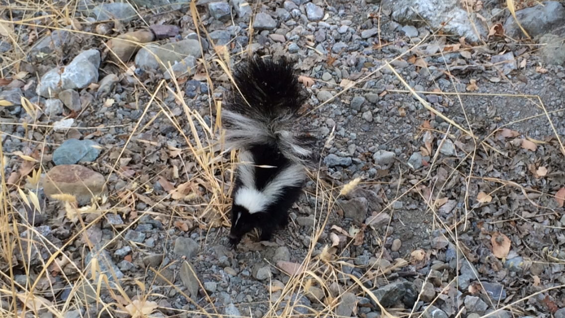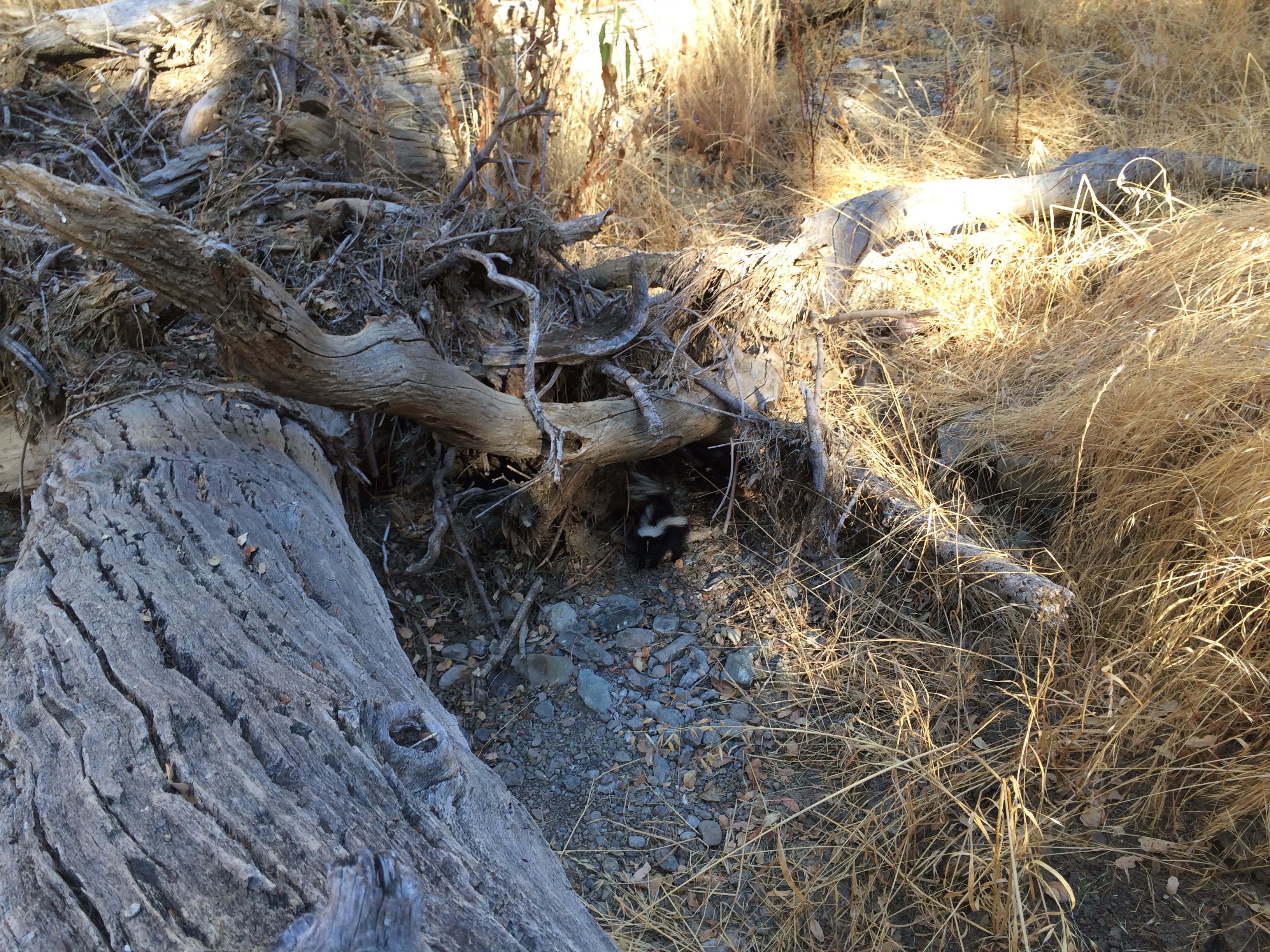 I’m glad he saw it, since I was just blundering on and would likely have clambered right over its den. The little Mephitis mephitis raised its tail at us a few times, but we kept our distance and let it calm down. On our way back down the mountain an hour later, the skunk had emerged from its den and was foraging actively in the dry stream bed, poking about the stones for grubs or insects to munch on. We detoured carefully around it, while getting a good look, too.