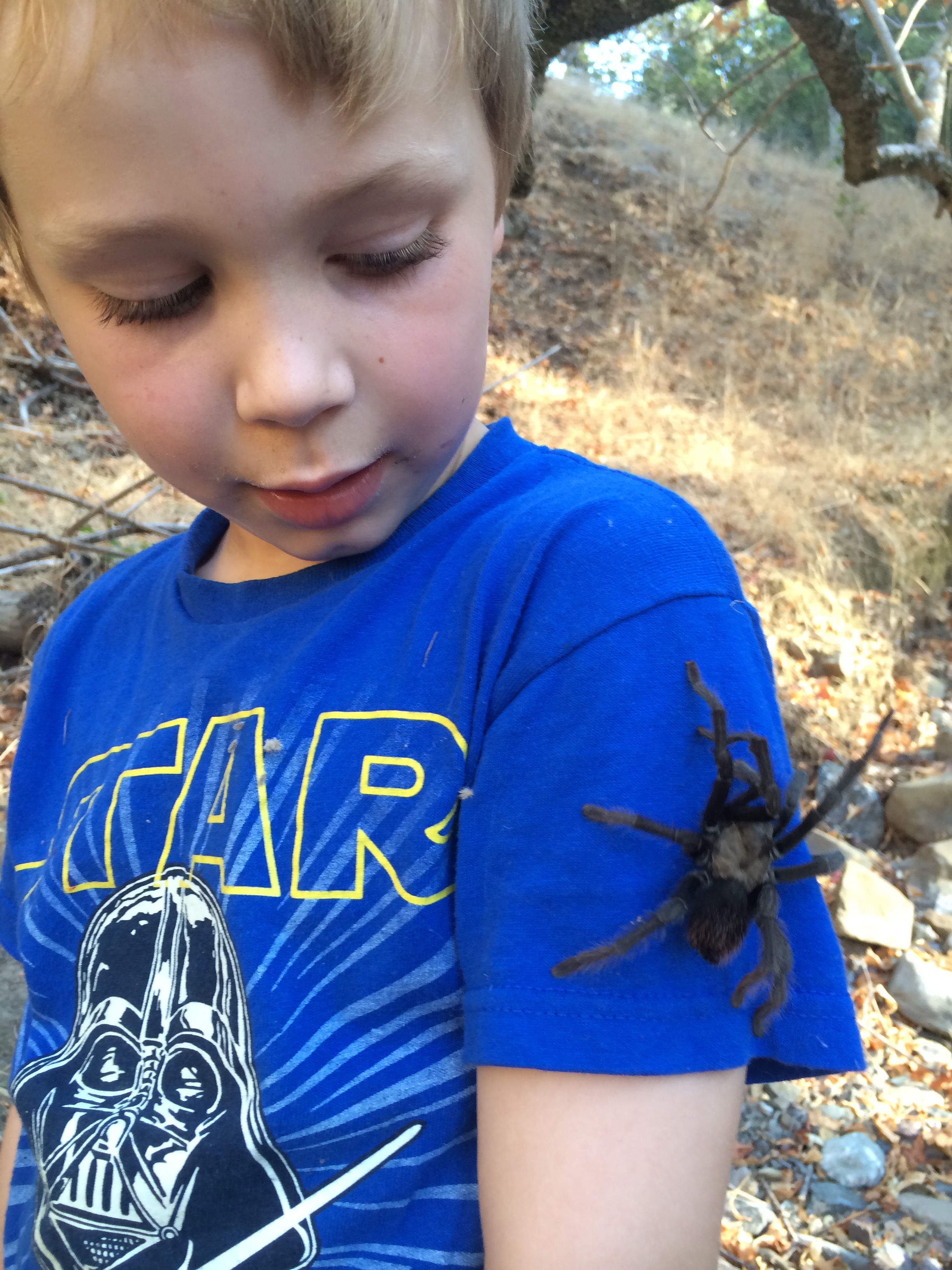 Kieran and I went back to Mount Diablo on Sunday evening, just a few days after taking his grandparents there during the week. We went to the same area, just inside the north border of the vast park, where Burma Road trail crosses the street heading up the mountain. We eschewed trails and instead followed the bones of dry Little Pine Creek up into the hills. In this drought summer, the creek bed is dry and easy to follow as a trail, so long as you keep an eye out for poison oak and dodge it. Late in summer, some of the tricky poison oak branches have shed their telltale leaves and only dangle a few white berries.