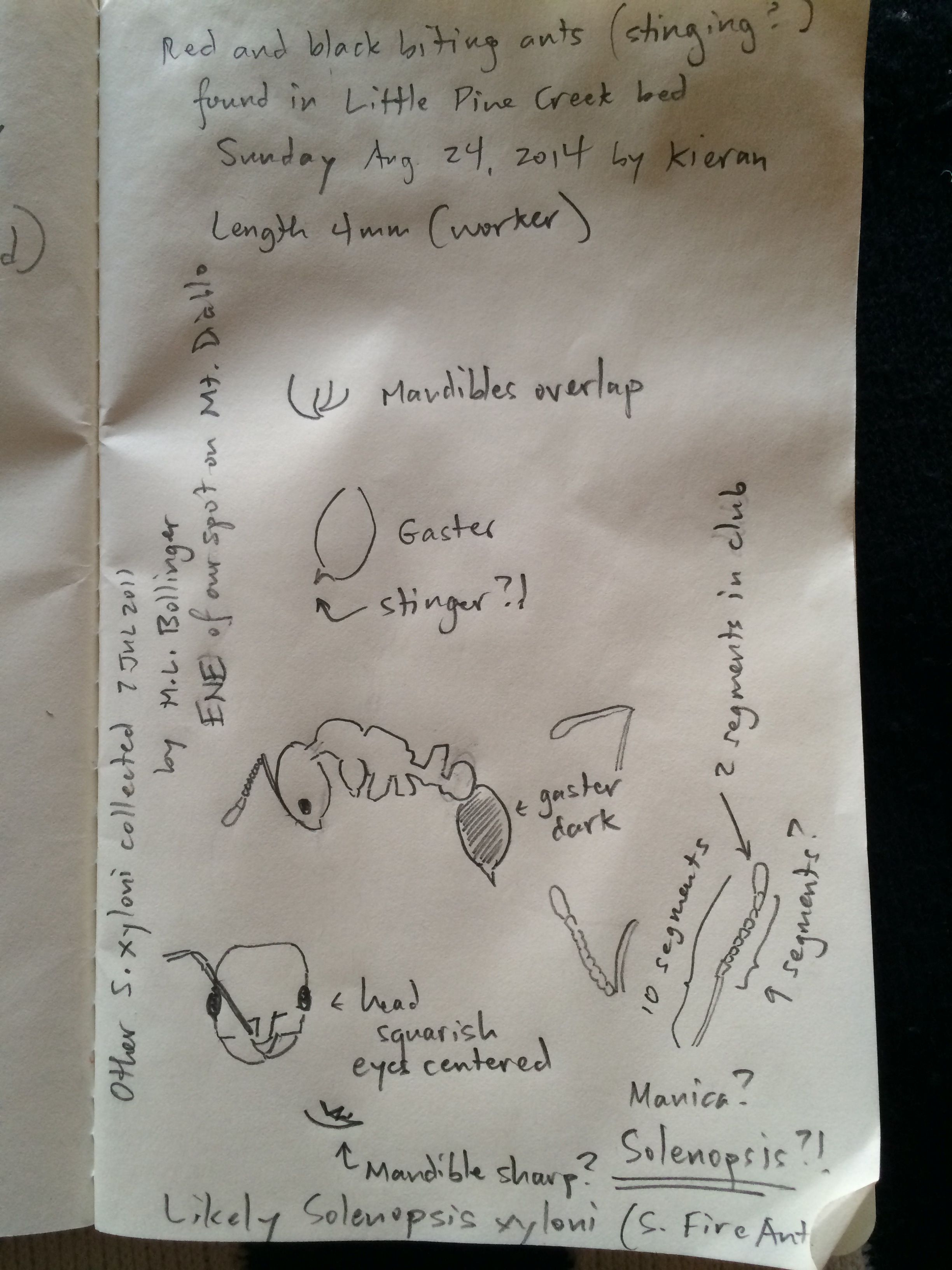 After blundering about, I narrowed these specimens down to a surprising genus — Solenopsis. Why is that surprising? Because those are the notorious fire ants of the South! I didn’t know we had them in California at all. Seems likely these aren’t the famously fierce (and famously imported) Soleopsis invicta, but rather a moderately fierce cousin, Solenopsis xyloni.