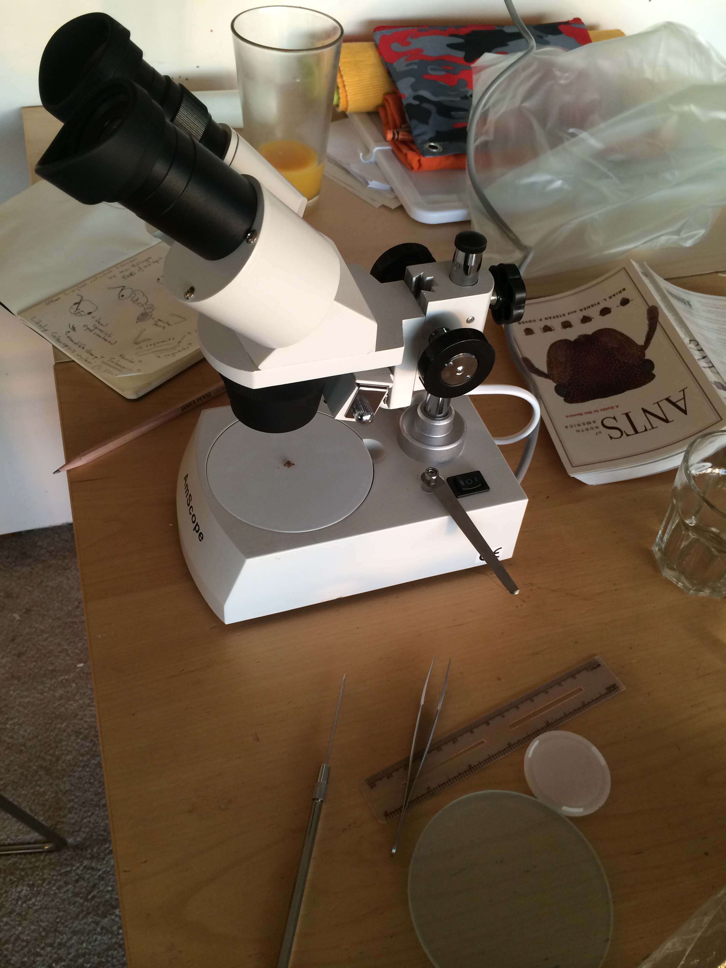 My “needle nosed” forceps aren’t needles under the microscope, either! They’re great, blundering things, big as the ants themselves, making it hard to grab a leg and rotate the ant’s body, for example. I tried using a metal probe with a point to open an ant’s mandibles, but couldn’t manage it.