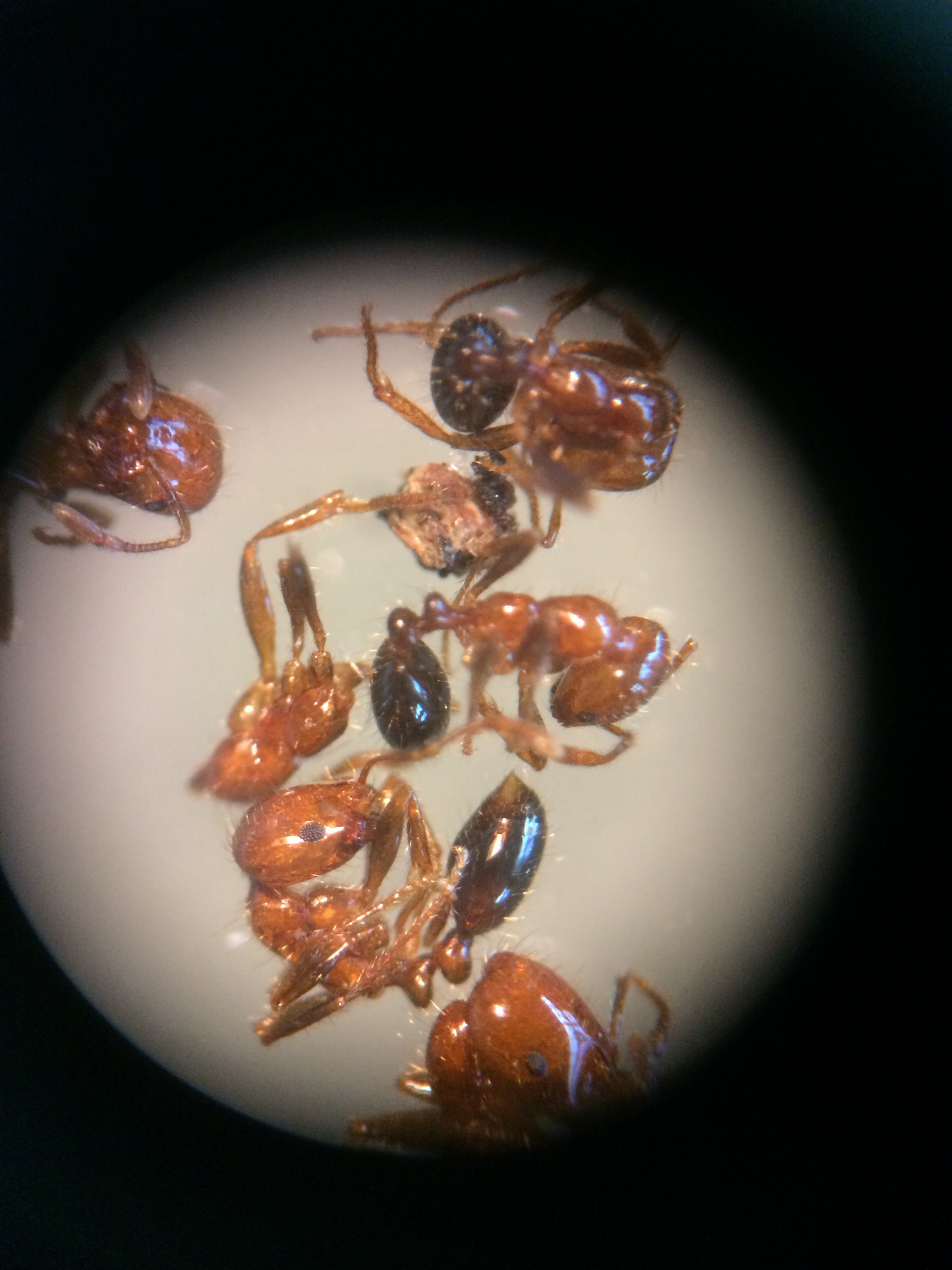 Kieran and I recently collected some tiny, stinging ants in a dry creek bed on Mt. Diablo. We brought a few workers home and studied them under our microscope, but even with the help of a heavy pile of ant books, we weren’t sure what we’d got. So we contacted the California Academy of Sciences.