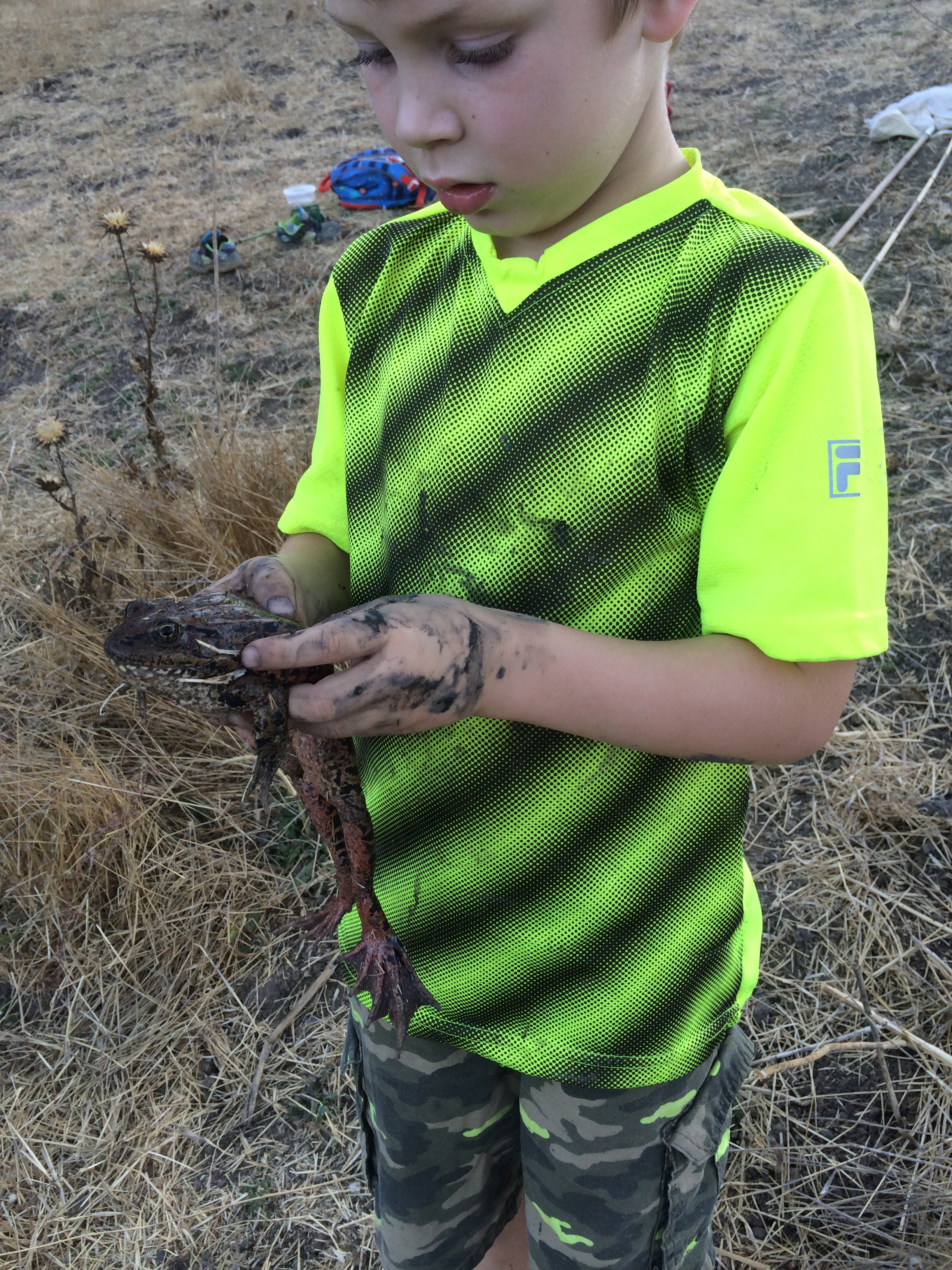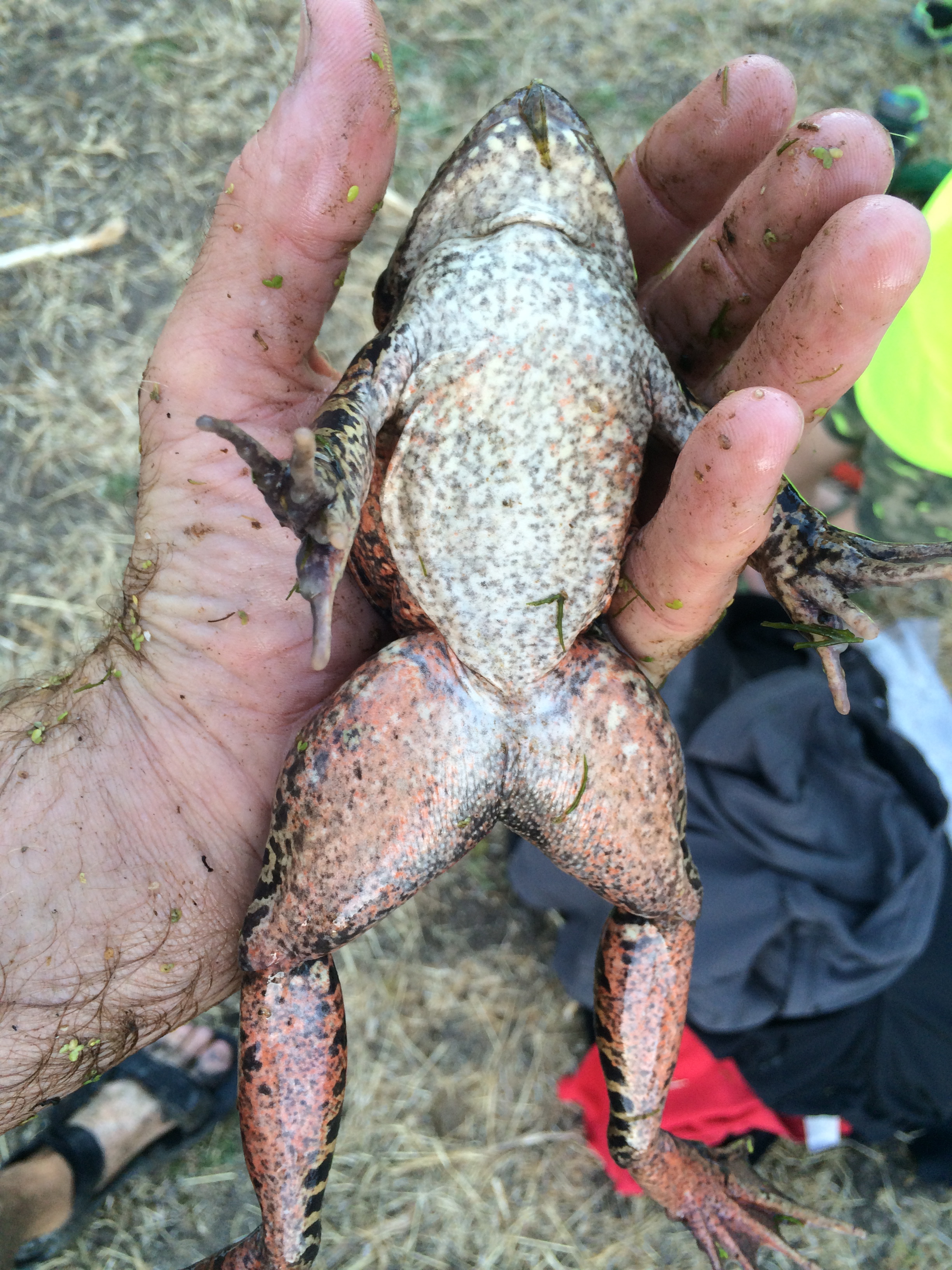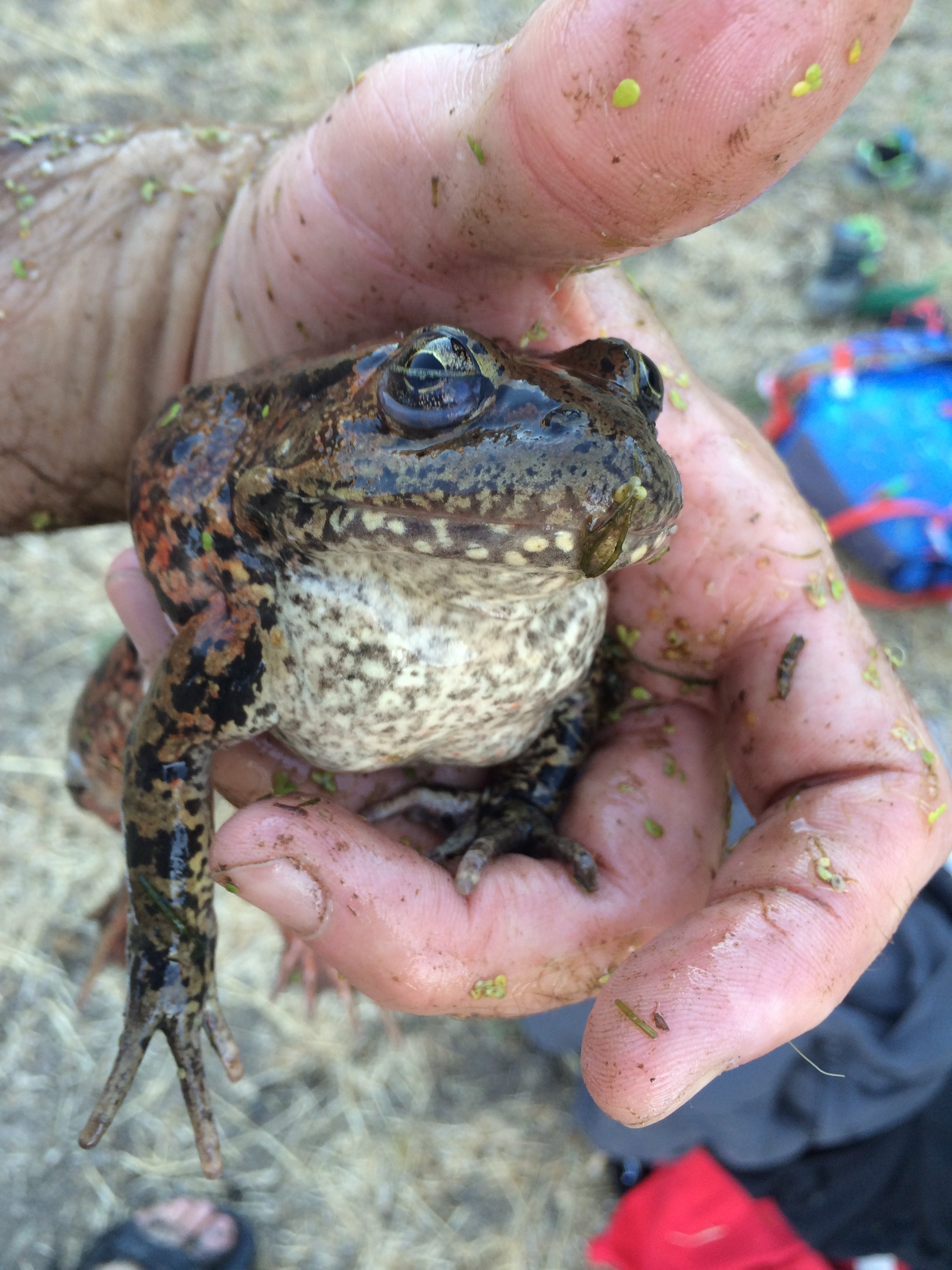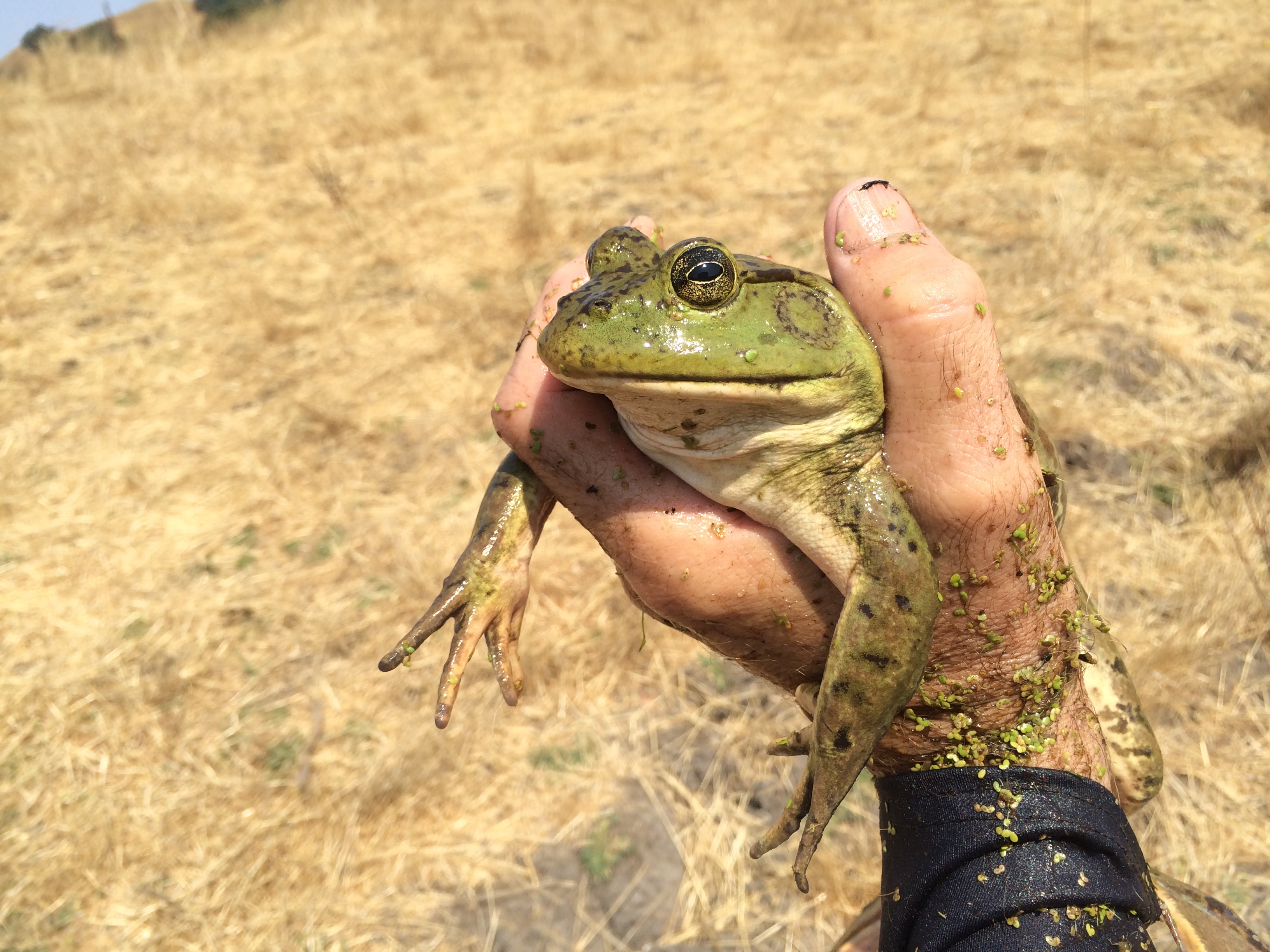On one of our frequent trips to the Briones bullfrog pond — this was, let me see, Saturday evening — we found a frog we’d never met before, and one that surprised us. Since the enormous, ravenous American bullfrog (Rana catesbeiana) was introduced to California in 1905, for food — yuck! — the native frogs, including this species, Rana draytonii, have been under serious pressure. Since this pond we regularly visit is home to several dozen bullfrogs, we didn’t expect to ever find a native California red-legged frog in it, and especially not a very large, healthy one. Yet here it was! And, even better news — we found plenty of juvenile R. draytonii in and around the margins of the pond, too. Perhaps the drought is affecting the bullfrogs — they aren’t able to burrow down and survive when a pond dries up completely, which is something the red-legged frog can do. But this pond — though it used to be over my head in the middle and is now just neck deep — ain’t anywhere near drying up yet. And there are still plenty of bullfrogs. Wait there until dusk and, while enjoying the dance of bats overhead you can be serenaded by the deep bass mating call of a bullfrog!