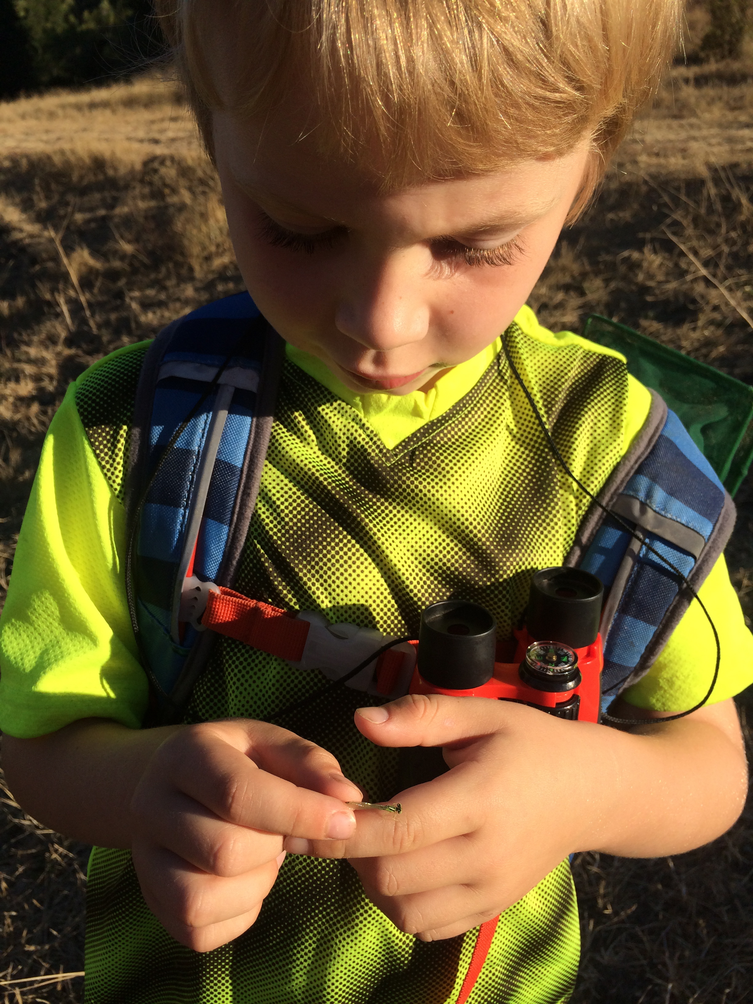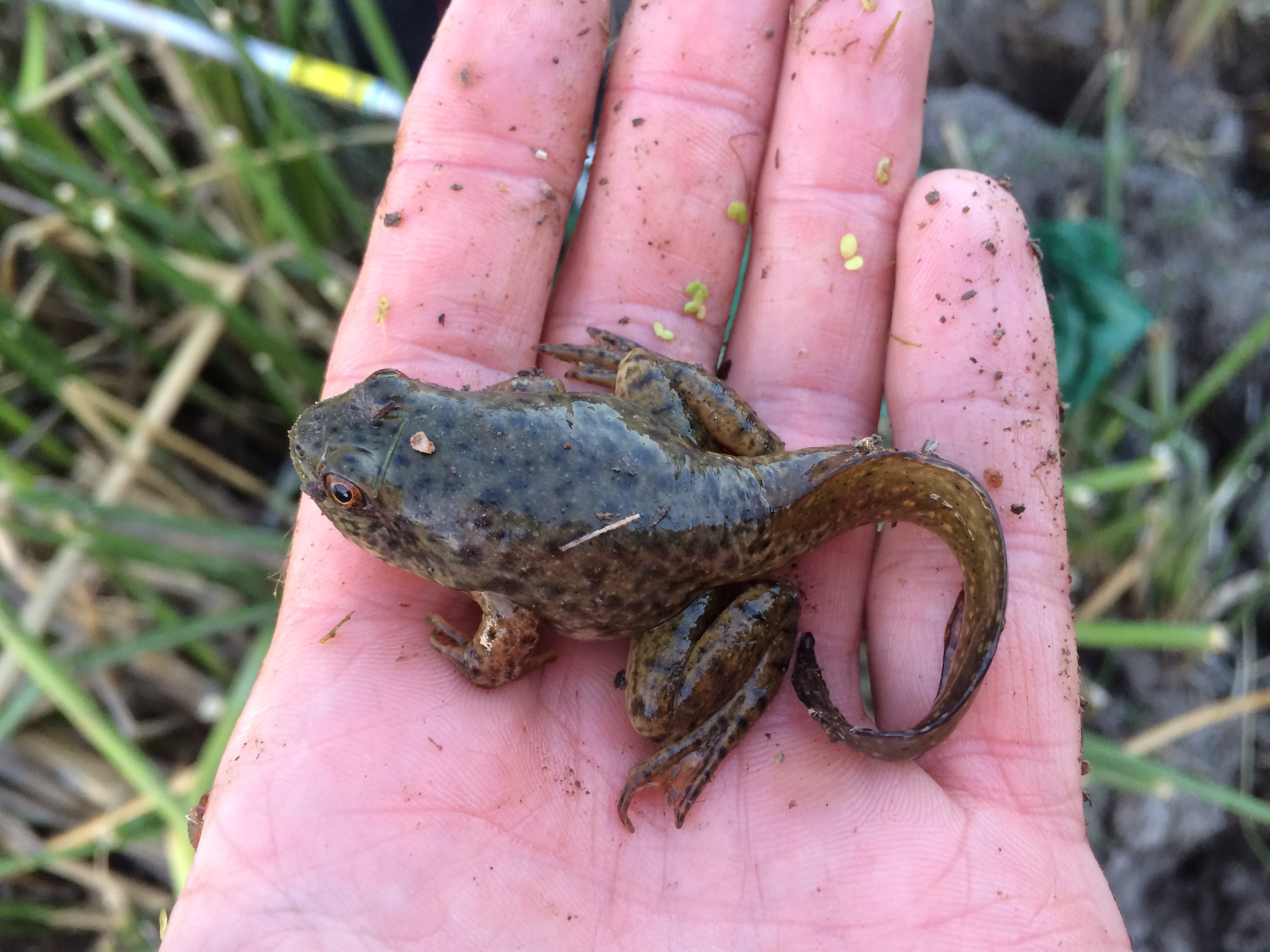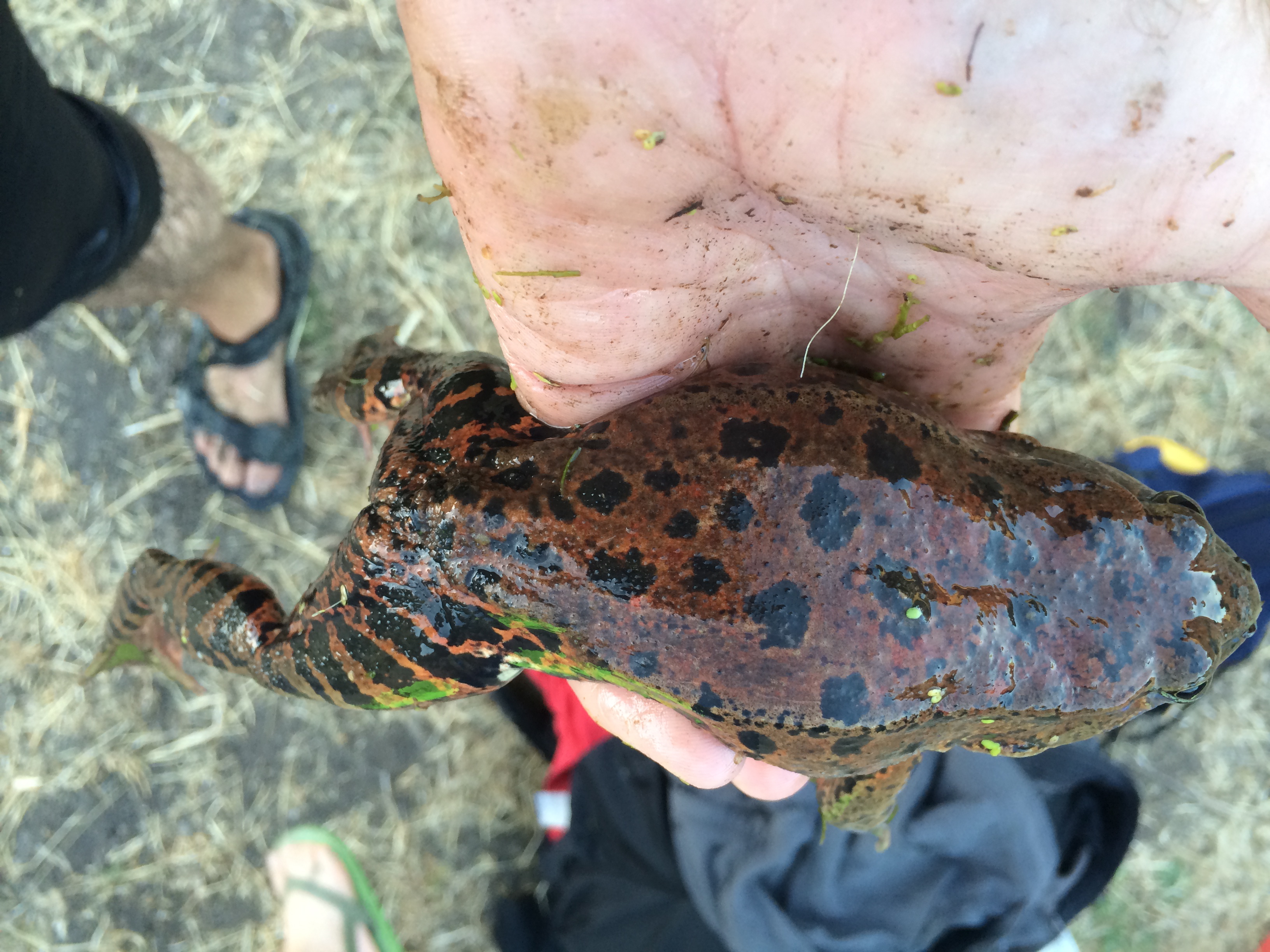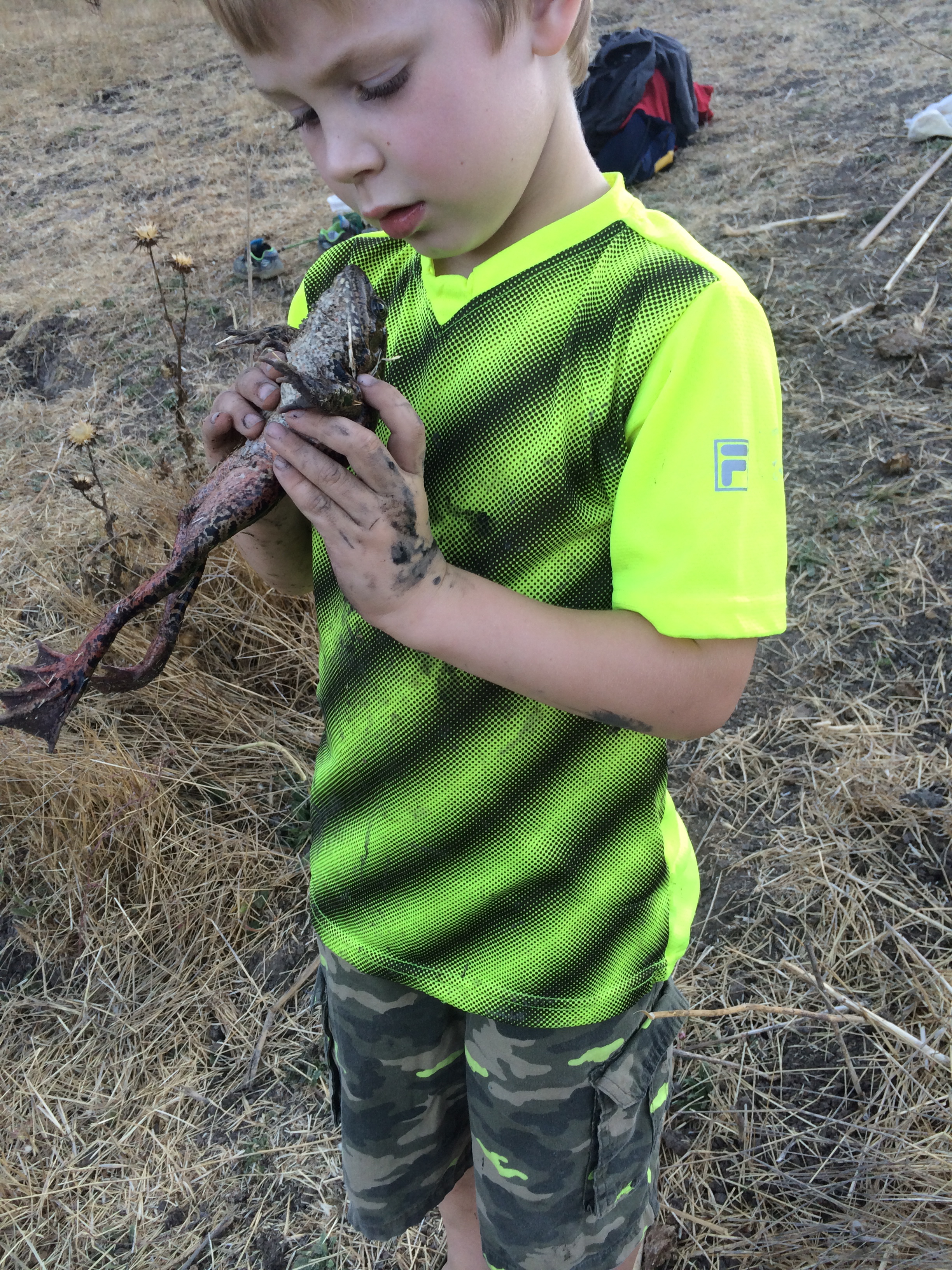 On one of our frequent trips to the Briones bullfrog pond — this was, let me see, Saturday evening — we found a frog we’d never met before, and one that surprised us. Since the enormous, ravenous American bullfrog (Rana catesbeiana) was introduced to California in 1905, for food — yuck! — the native frogs, including this species, Rana draytonii, have been under serious pressure. Since this pond we regularly visit is home to several dozen bullfrogs, we didn’t expect to ever find a native California red-legged frog in it, and especially not a very large, healthy one. Yet here it was! And, even better news — we found plenty of juvenile R. draytonii in and around the margins of the pond, too. Perhaps the drought is affecting the bullfrogs — they aren’t able to burrow down and survive when a pond dries up completely, which is something the red-legged frog can do. But this pond — though it used to be over my head in the middle and is now just neck deep — ain’t anywhere near drying up yet. And there are still plenty of bullfrogs. Wait there until dusk and, while enjoying the dance of bats overhead you can be serenaded by the deep bass mating call of a bullfrog!