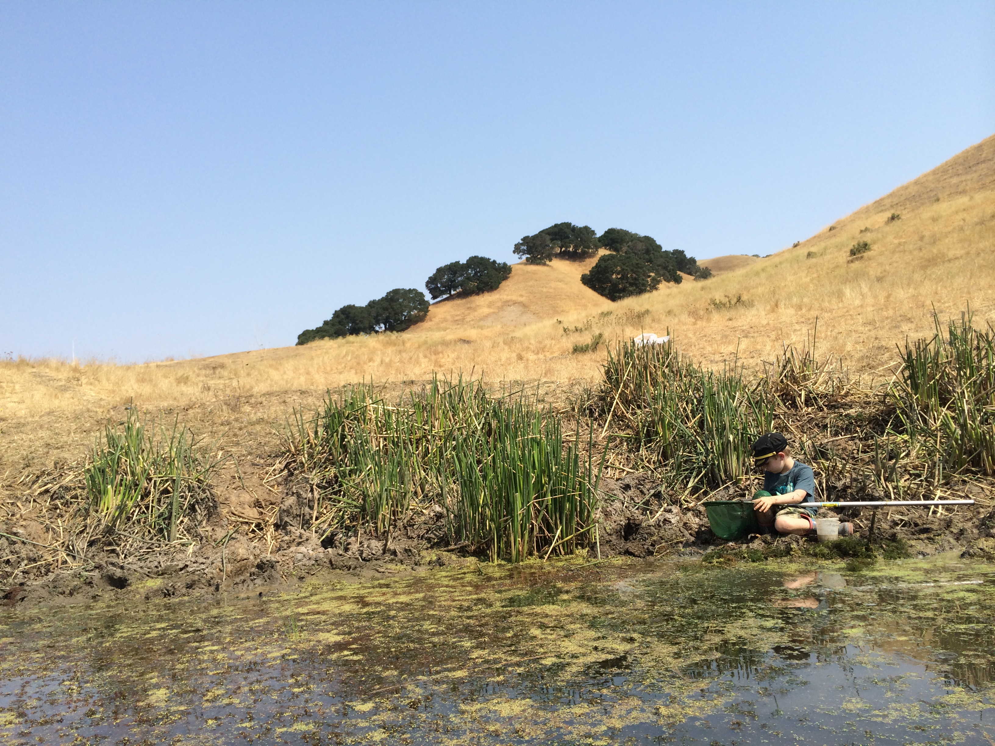 The pond, though shrunken, is far from dry (photo taken from the middle, where it’s about five feet deep).