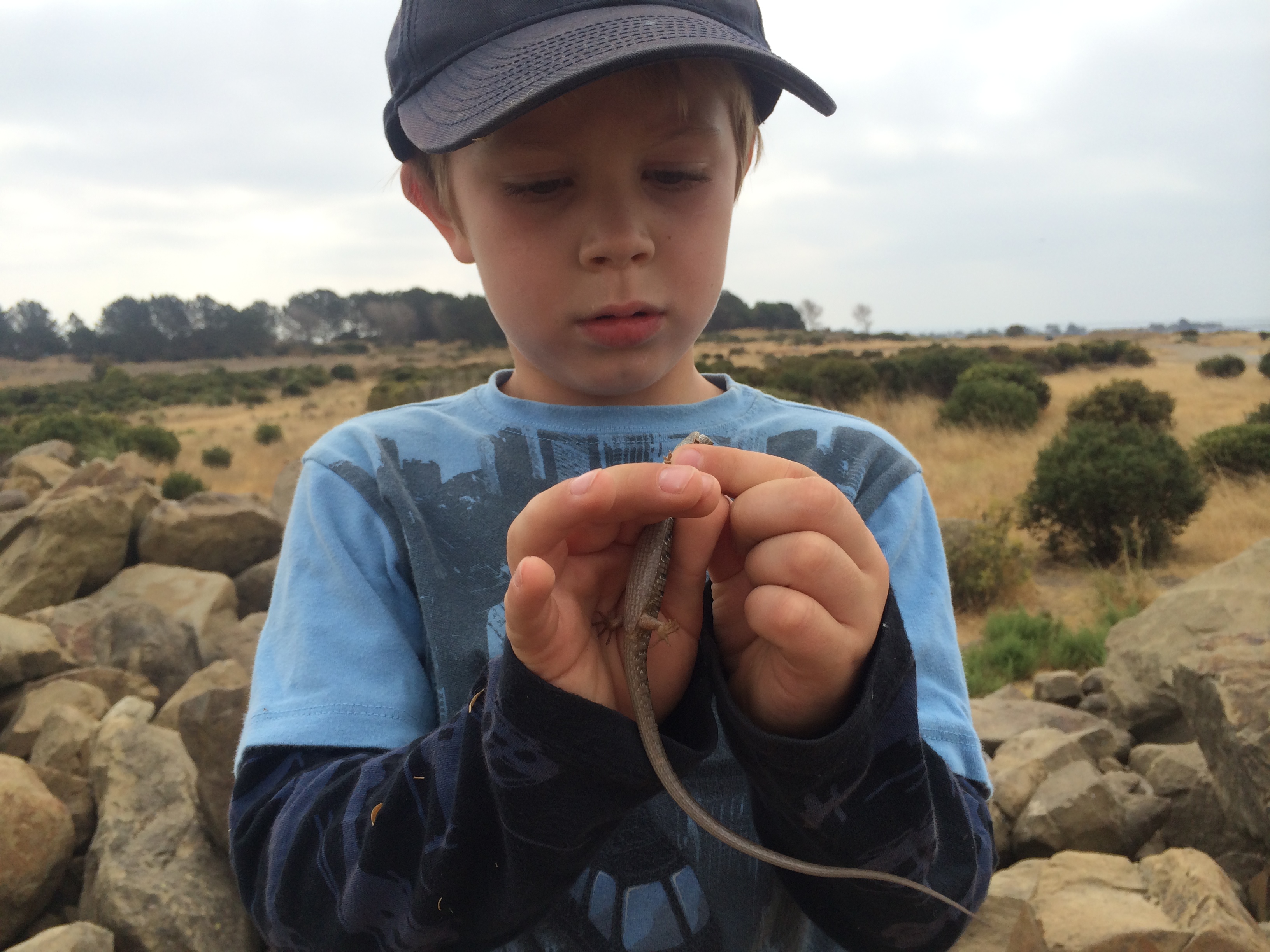 Kieran, his grandmother and I went to Oyster Bay, a park built on an old landfill in San Francisco Bay near the end of the Oakland Airport runway. Since the land was constructed of huge blocks of broken up concrete, it’s a convivial place for snakes and lizards. On Sunday we found two young alligator lizards in the genus Elgaria. We have two local species of Elgaria, and I’m not expert enough to tell ’em apart just lookin’ at ’em. They’re fascinating, snakelike lizards — even though they have legs they tend to slither through the dry grass in a serpentine movement. Their long, long tails contribute to the snakelike sense, and they’re prehensile. Alligator lizards are fierce and do bite, though these young specimens couldn’t break the skin or really hurt us much.