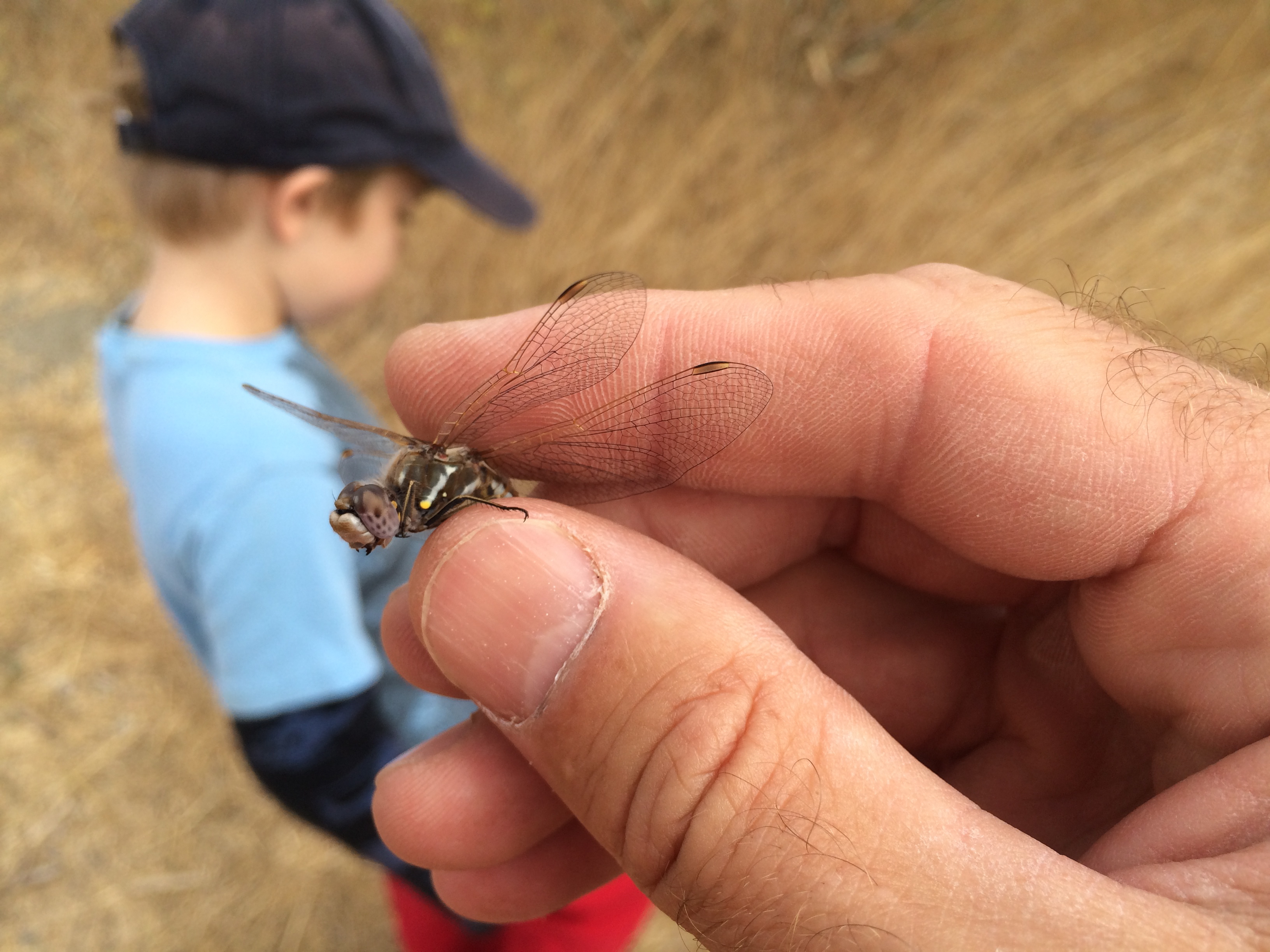 We also caught a dragonfly in the meadow. I suspect it was Sympetrum corruptum due to the distinctive diagonal white stripes with yellow dots at the end on its thorax. It was considerably smaller than the big Anax junius dragonflies we caught earlier in the summer.