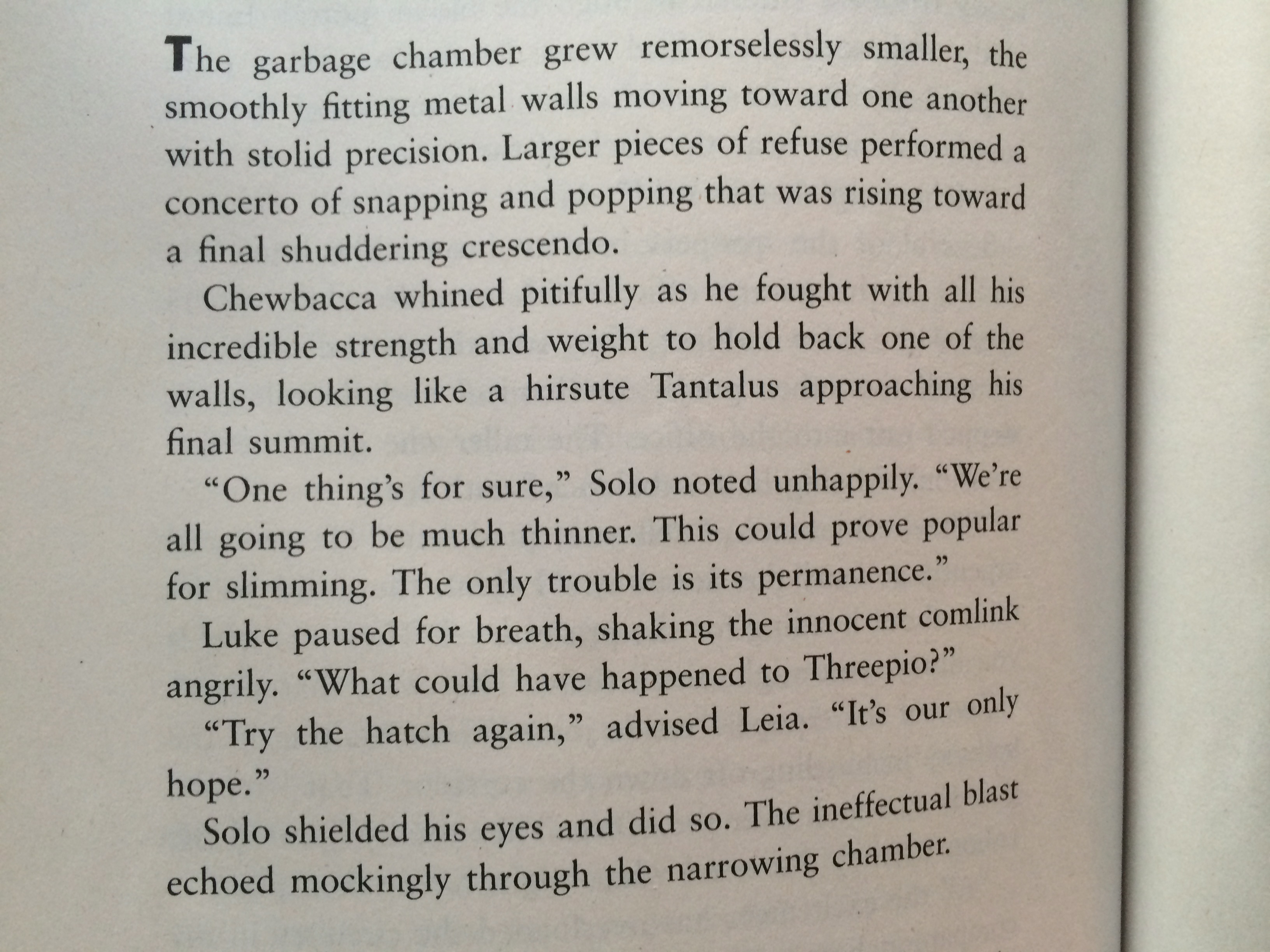 He describes Chewbacca pushing against the moving wall of the garbage masher “looking like a hirsute Tantalus approaching his final summit.”