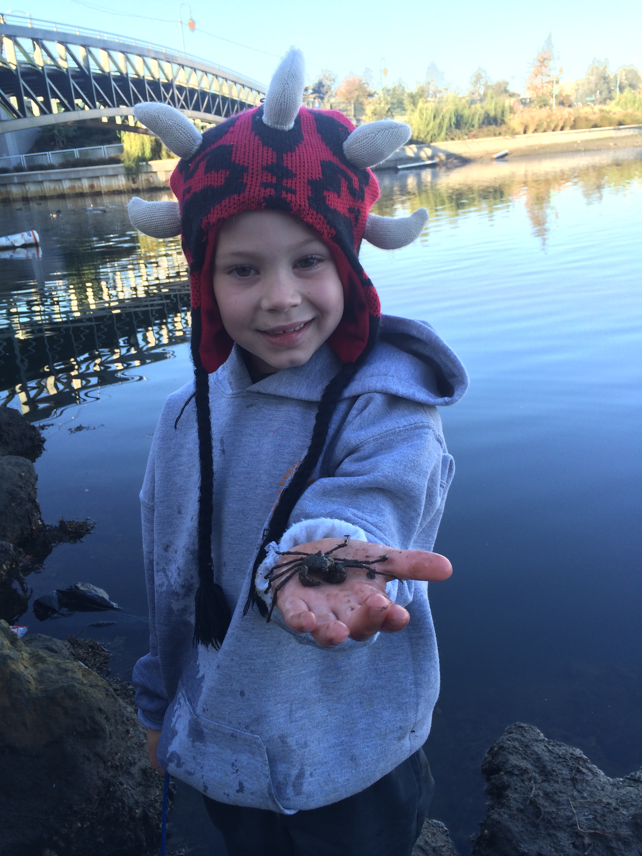 Early this morning my son took me out to explore the cold, shallow shore of Lake Merritt here in downtown Oakland. We waded in with nets and peered around the rocks near the estuary entrance. Kieran, with his sharp young eyes, immediately spotted and caught several spider crabs, then added to that collection, ending up with about eight or ten of them in little plastic bowls on the shore, where curious passersby peered at them, and at us.