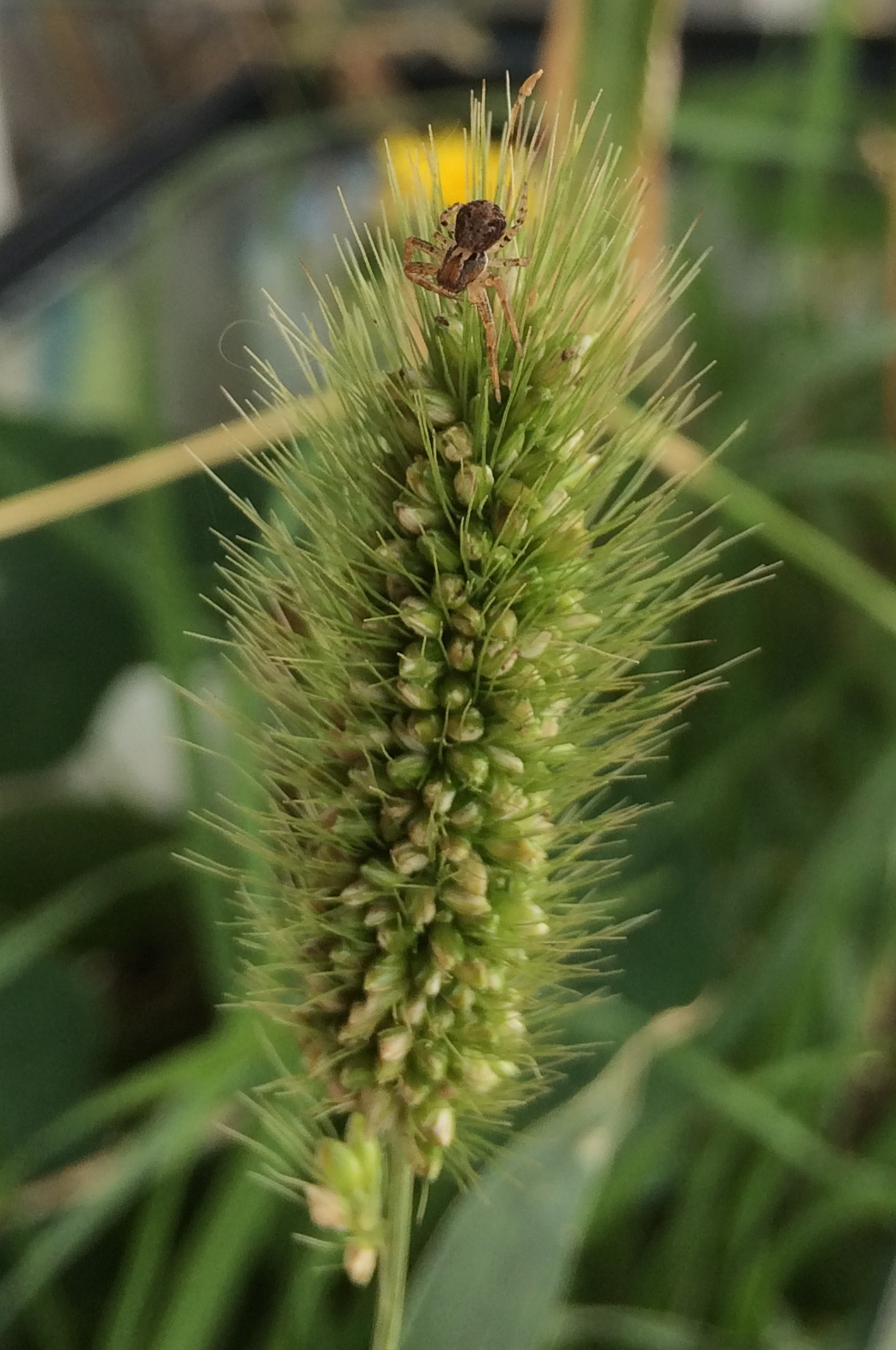 This week I found a tiny, drab brown crab spider in one of my son’s terrariums. It waited patiently on an inflorescence of grass. Though I did my best to identify it, even with multiple field guides it ain’t easy! It’s No. 2 leg isn’t longer than No. 1, which seems to rule out Philodromidae. So my best guess is Xysticus, one of the 26 different species of that genus found in California, Oregon and Washington. They’re very patient creatures, and just wait on a flower, like this grass flower, until an insect comes along to pollinate it. Some crab spiders are colorful — yellow or pink — and can even change their color like a chameleon to match a flower.