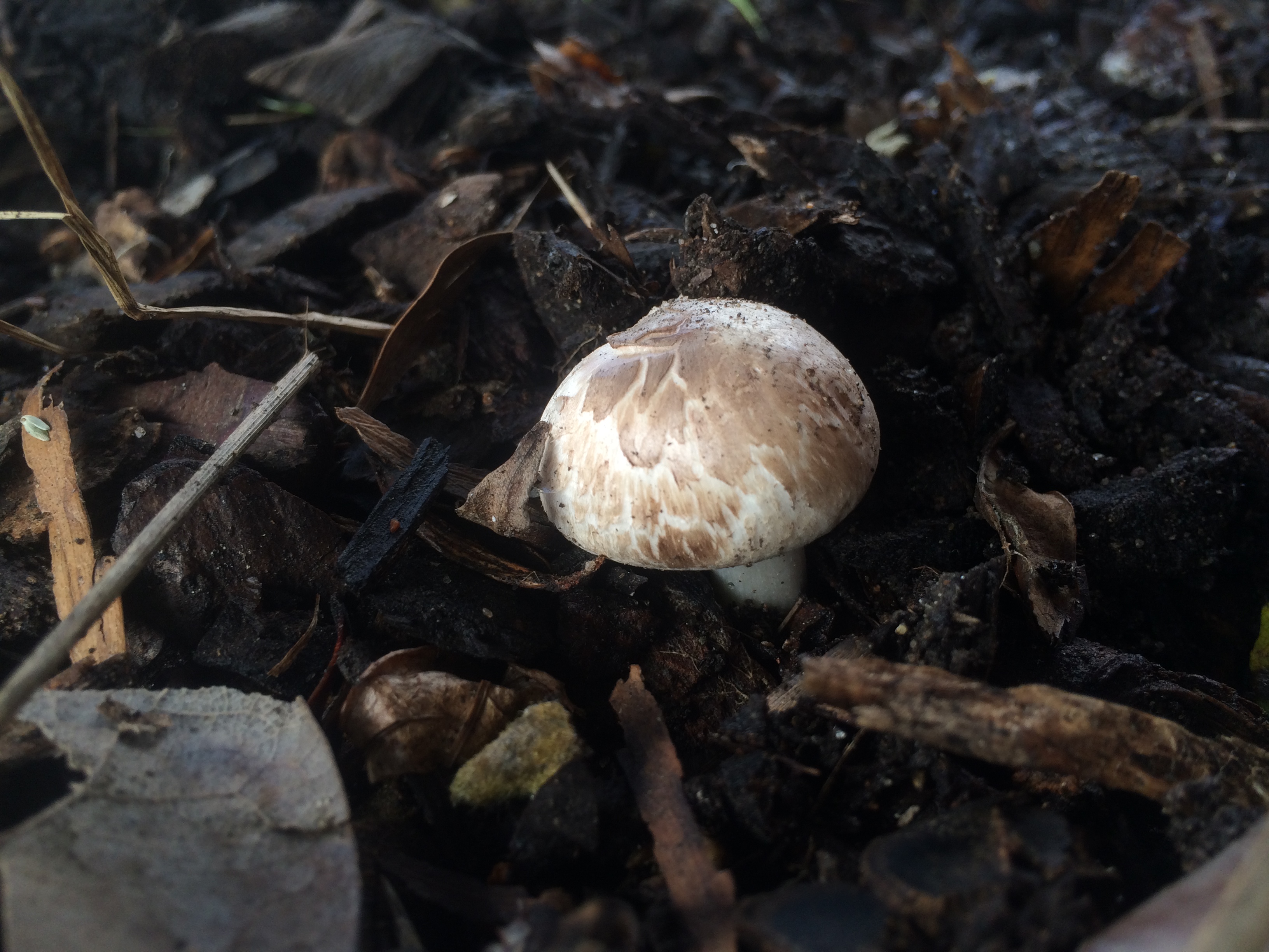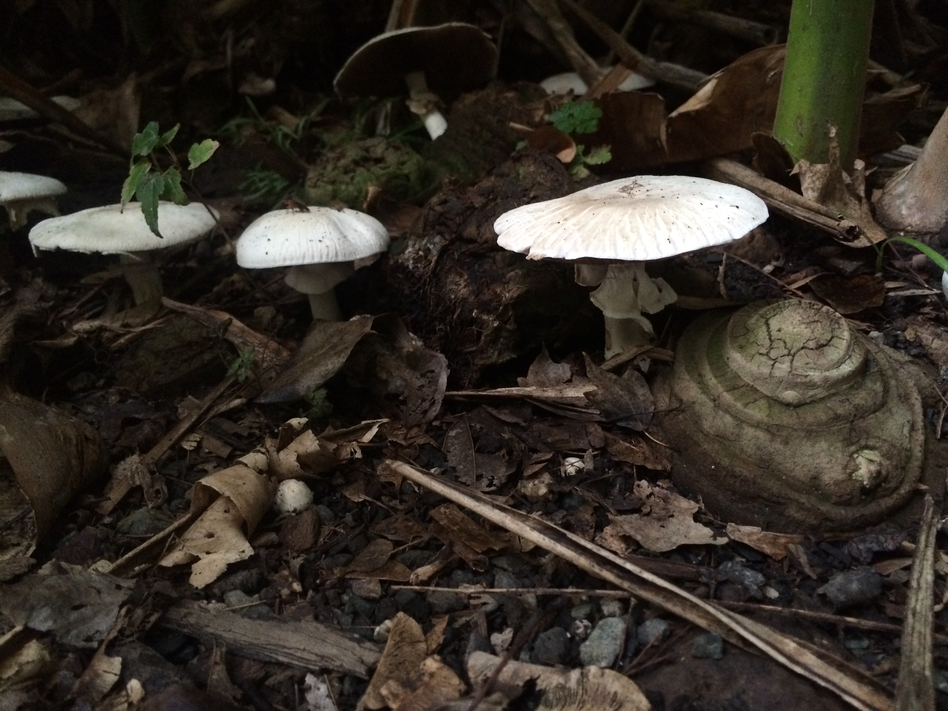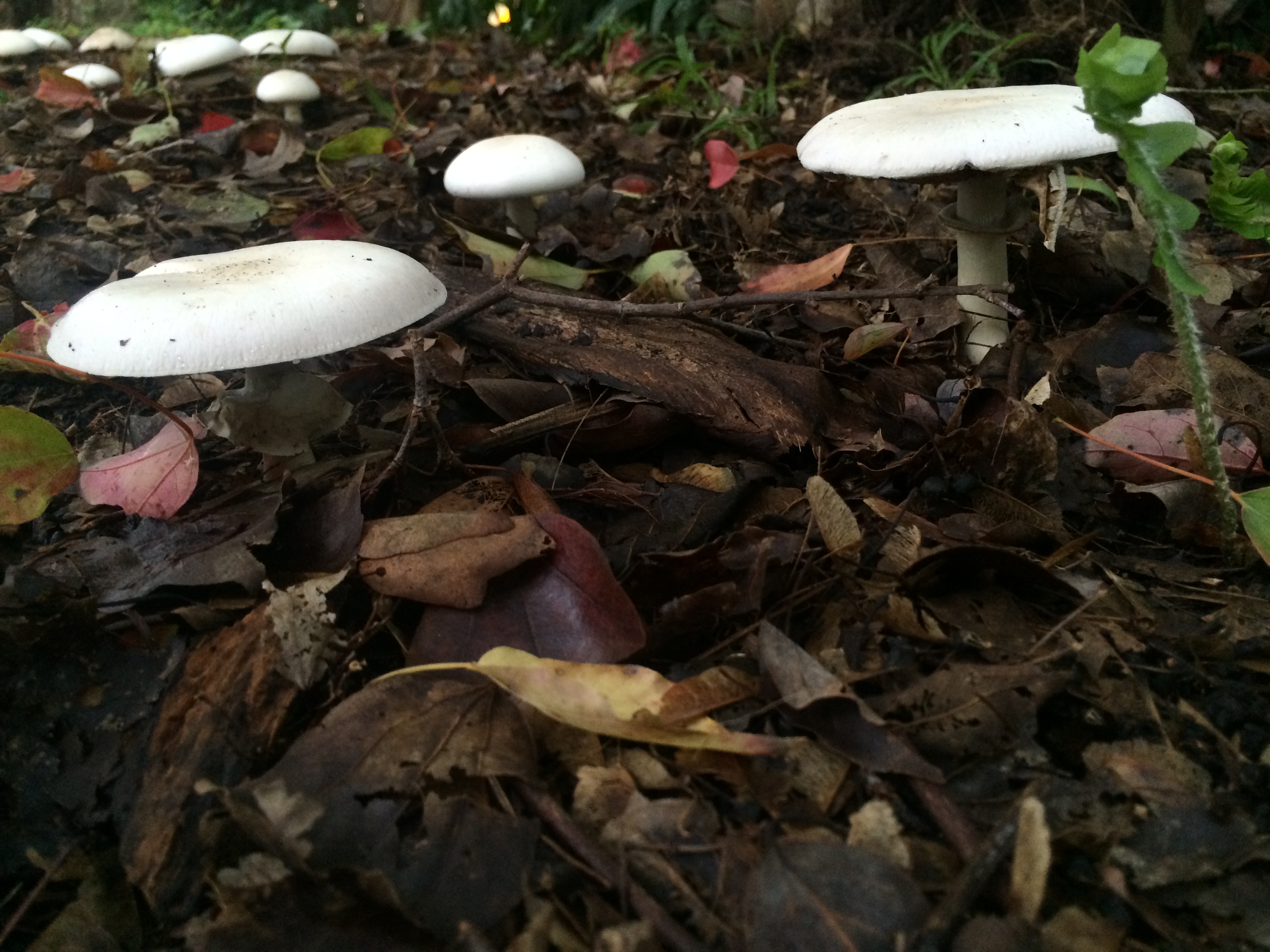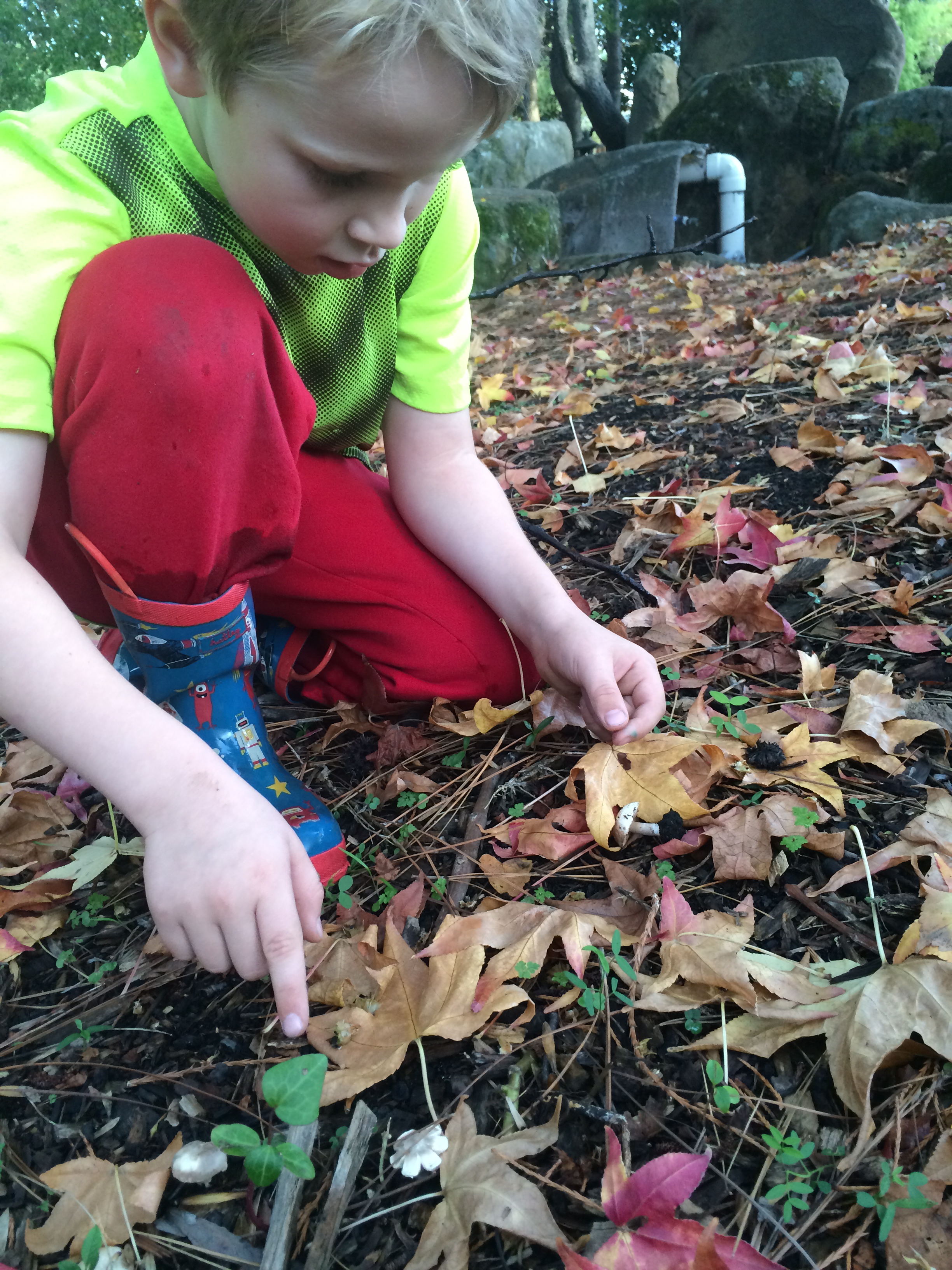 It rained last night, and this afternoon on our way home from school, Kieran and I stopped, as we nearly always do, in the lovely Lakeside Garden. Everything was still wet from the rains, and Kieran immediately spotted some mushrooms with his sharp young eyes. For an hour, as the setting sun pulled the light out of the park, we went everywhere, peering closely at the ground seeking more mushrooms. We found plenty of them, some already out and open, like little umbrellas, others still just nudging their way out of the grass or fallen leaves.