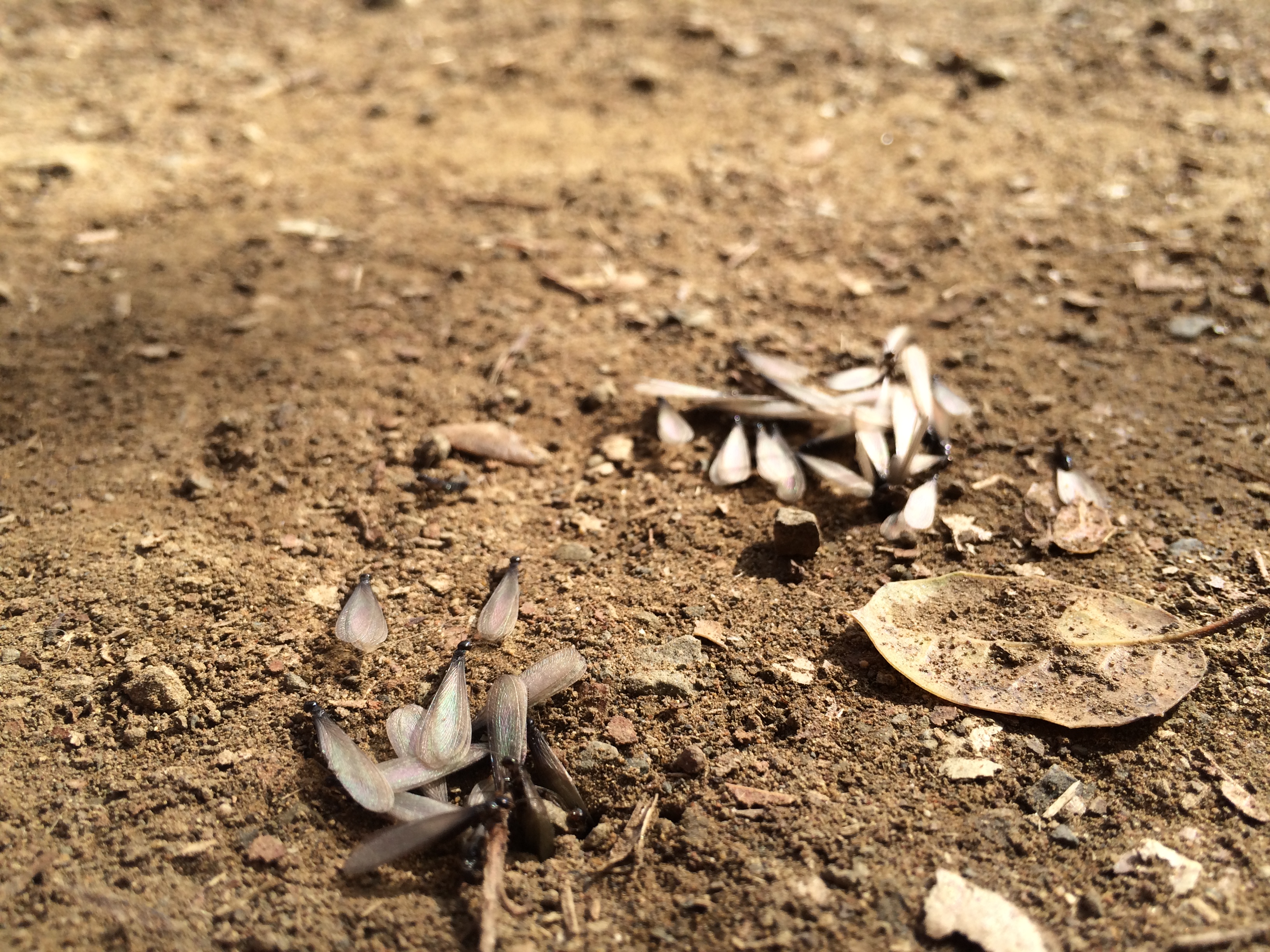 Two holes had opened in the dirt of the trail, and dozens of winged termites were swarming out and fluttering into uncertain flight. These alates — future kings and queens — don’t mate in the air like ants do, rather they just disperse, sometimes only a few meters, other times much farther. Then they break off their own wings and the males and females find each other on the ground, pair up, and set up housekeeping in some tiny crevice or other. Their mortality rate is astonishingly high, with fewer than 1 percent likely to survive. Most end up, like those Homeric heroes, as a feast for birds. We’ve also seen ants teaming up to attack them on the ground.