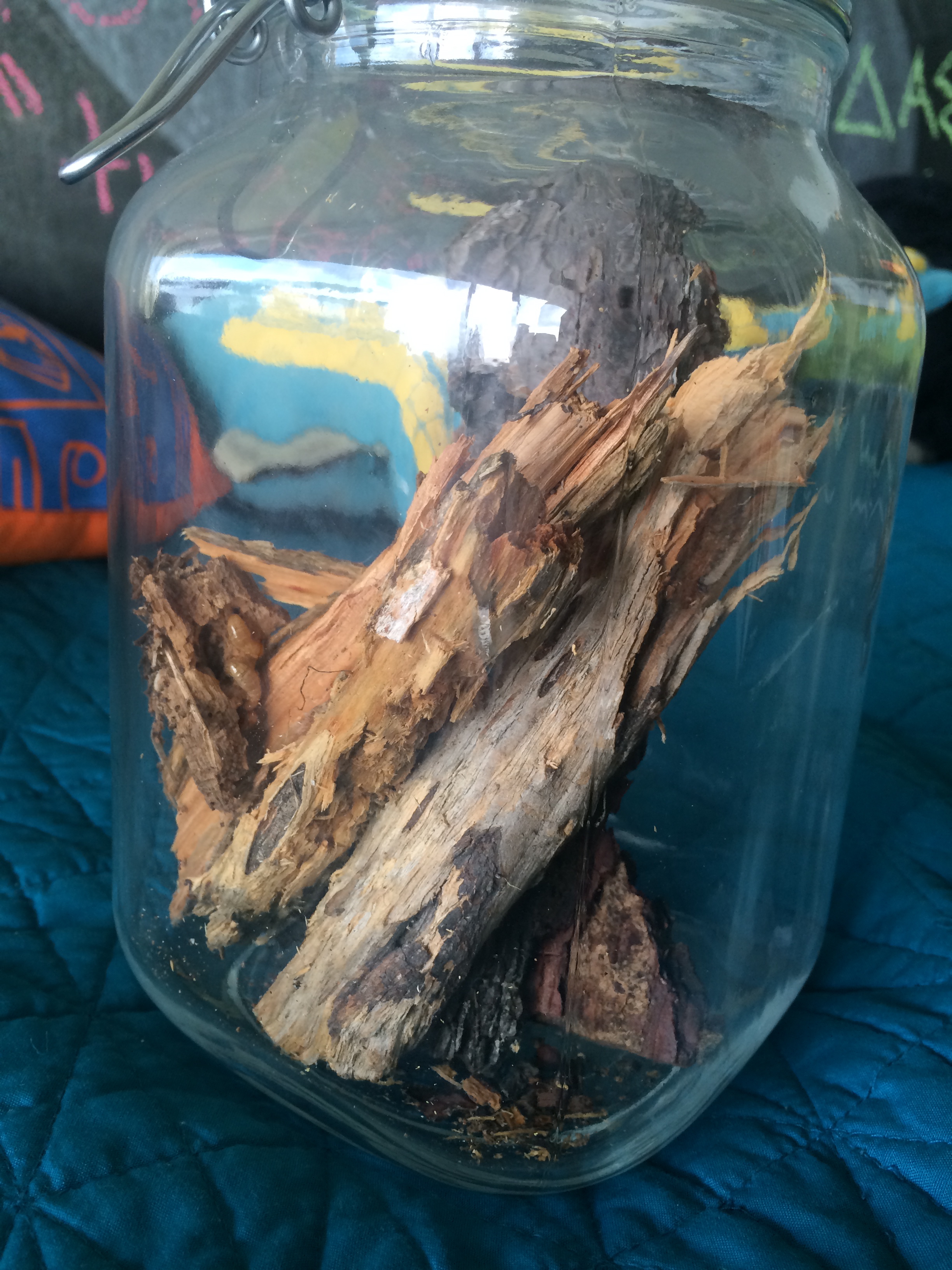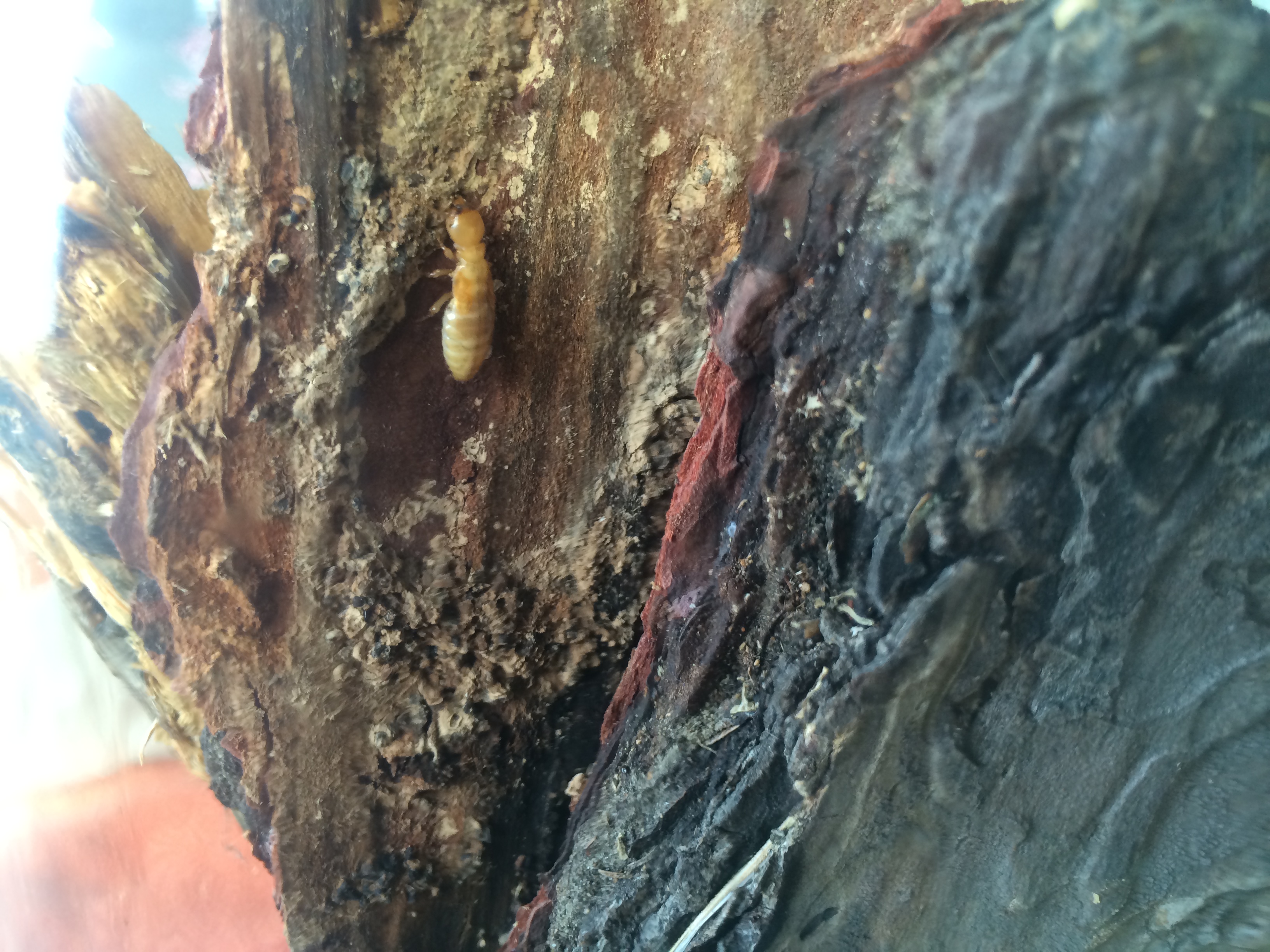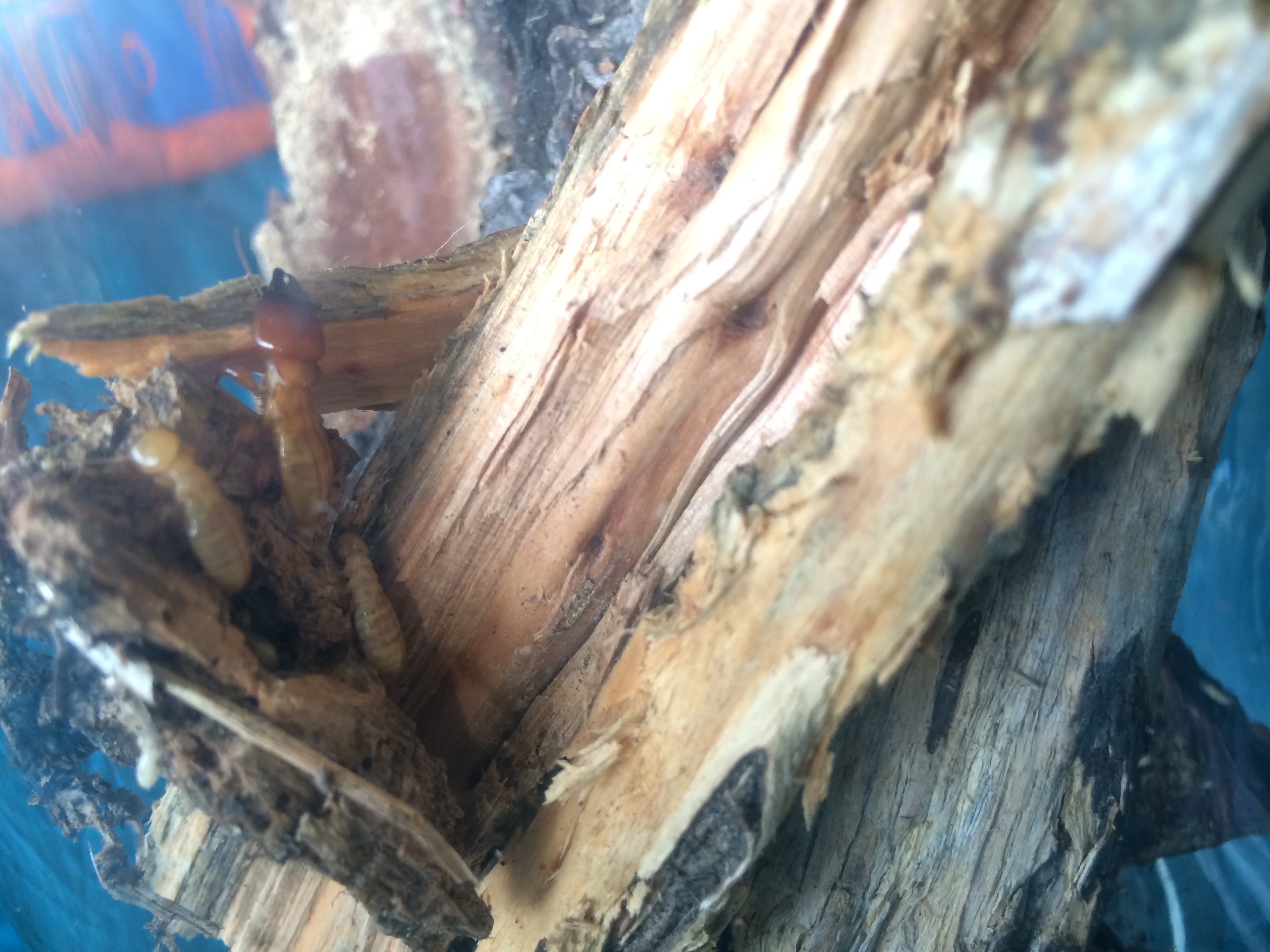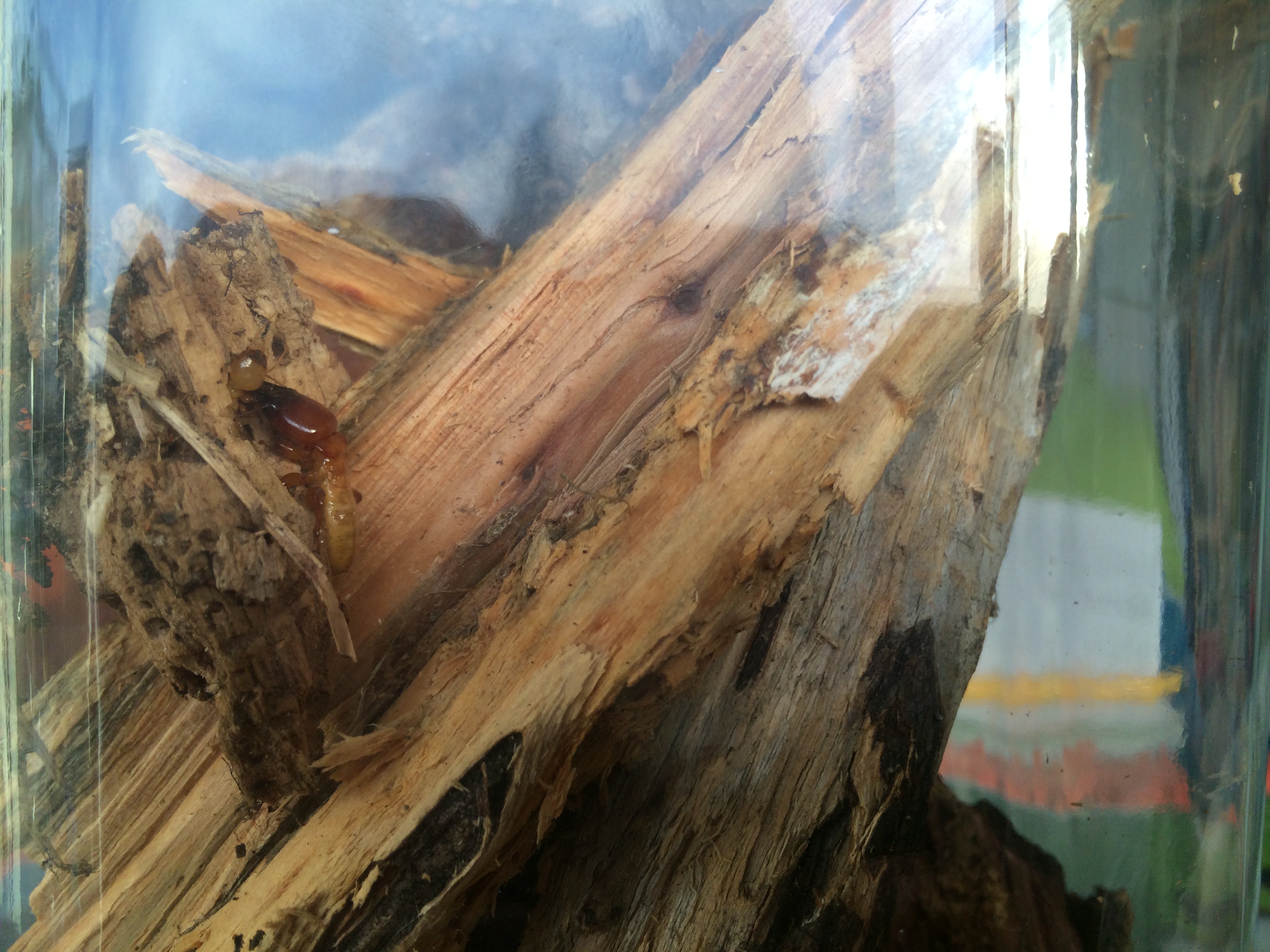 A few minutes later, breaking open some rotting logs, we found some much larger termites, Zootermopsis angusticollis, or Pacific Dampwood Termites. These don’t damage structures, rather they eat spongy decaying wood, some of which may already have been broken down by fungus. They’re much larger than R. hesperus, and so easier to observe, and they do OK in captivity, making them and their close relative Z. nevadensis (which may even be the same species) some of the most studied termites in the world. So we brought home some of the wood we found them in, as well as one soldier, three larger nymphs, and half a dozen small nymphs, and put ’em all in a big glass jar to observe. We don’t know if they’ll survive, but the nymphs theoretically have the capability of changing into a queen and a king. Unlike ants, which are really a type of wingless wasp, termites are close cousins of cockroaches, and their nests don’t only have a queen. Termite nests have a king and queen who live side by side throughout the life span of the colony.