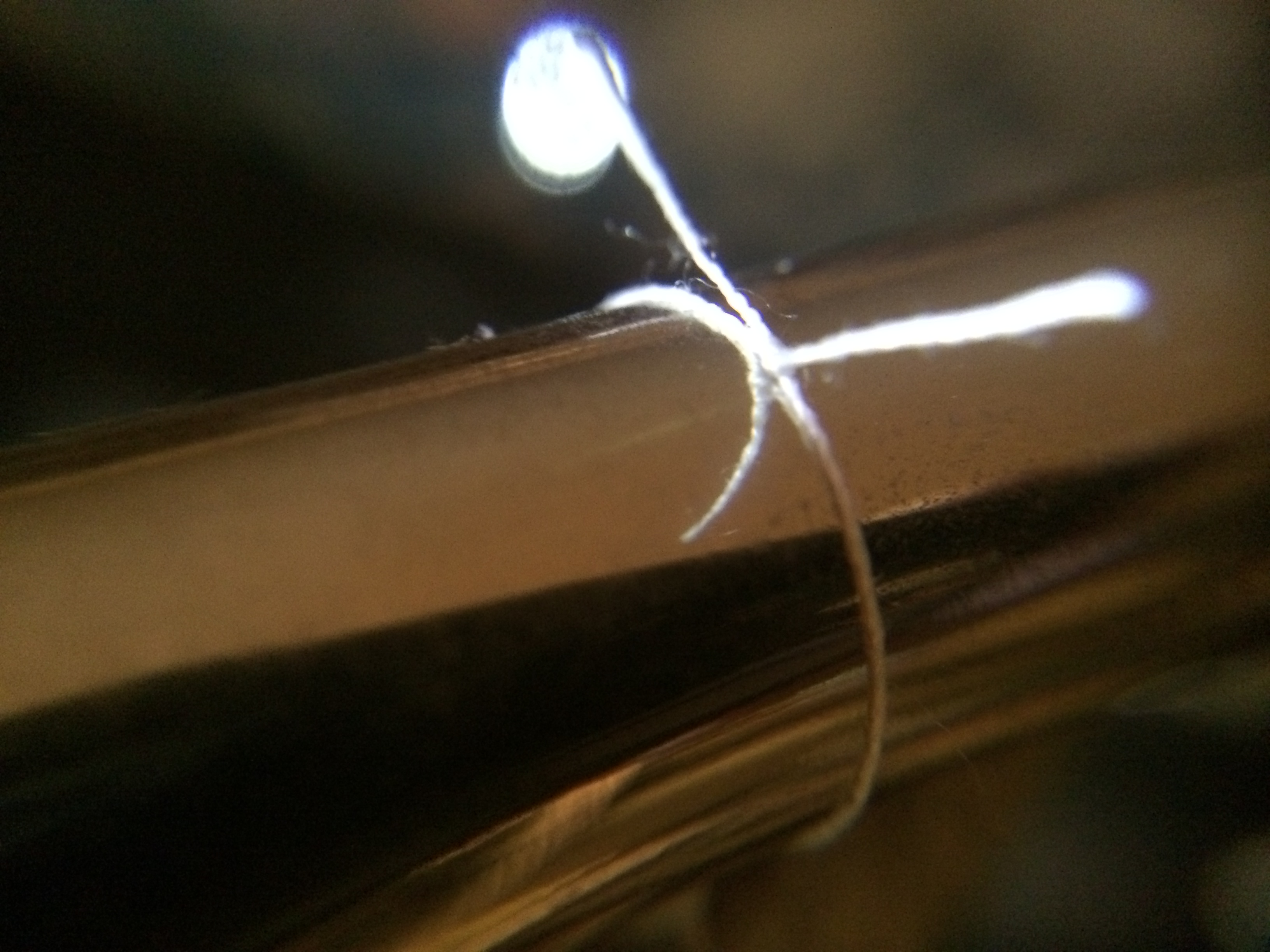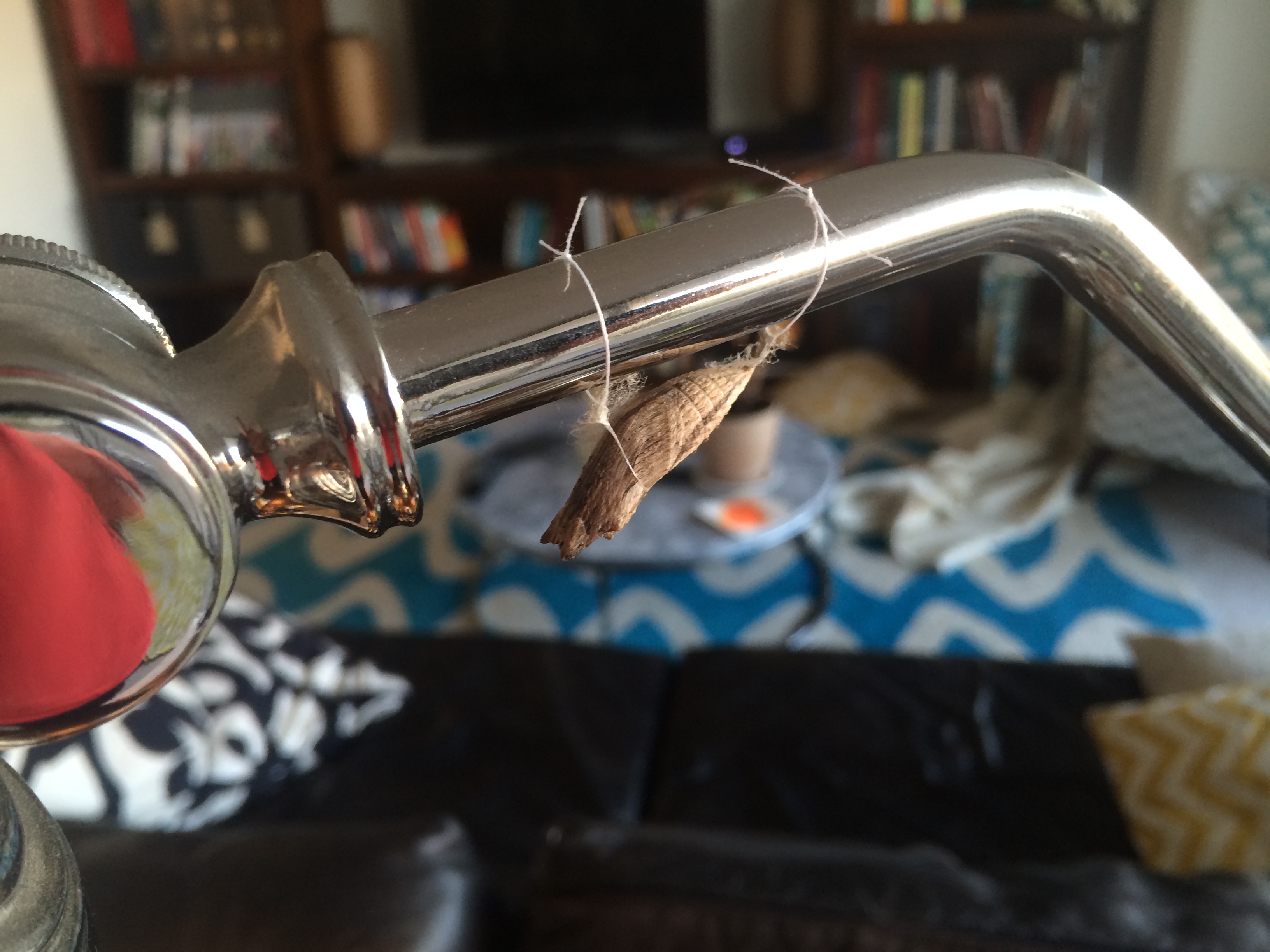 One of them somehow broke its connections and fell to the bottom of the cage. Worrying that it might not be able to emerge safely this spring, I carefully tied it to my desk lamp with some thread last night. A delicate operation, to be sure!