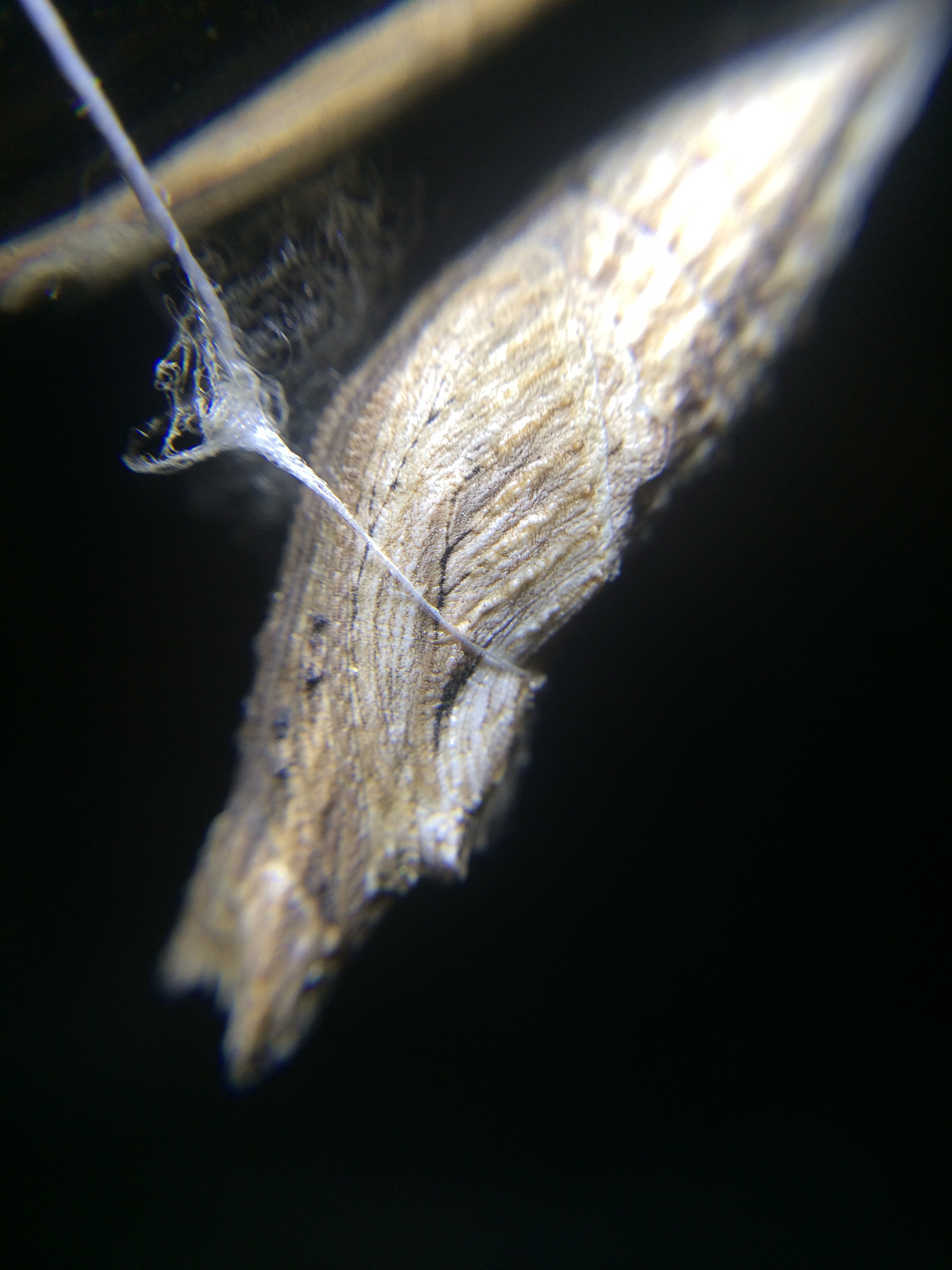 We also have two chrysalises from Anise Swallowtail caterpillars Kieran spotted on some fennel last May. We brought them home and they ate and ate and ate, finally forming pupae in a little net cage we kept them in. Each carefully secured itself to the wall using silk threads before pupating.