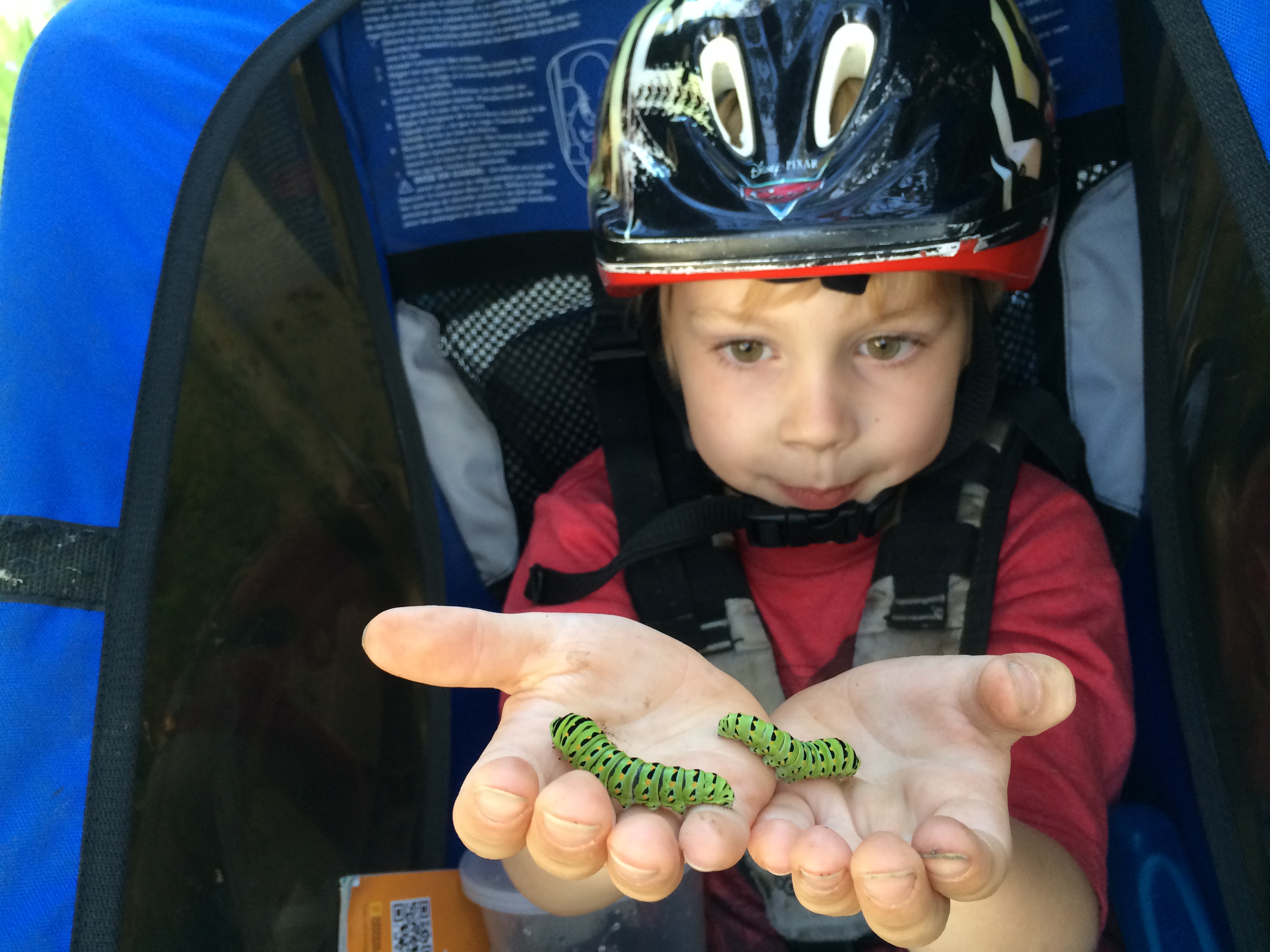 Kieran was given two Monarch butterfly caterpillars yesterday by one of the city’s park rangers. She gave him a small bottle of water with two leafy stalks of milkweed (their food) and asked him to raise them at home as part of a special pollinator project. We’ve had them 24 hours and they have visibly grown! They have quite an appetite.