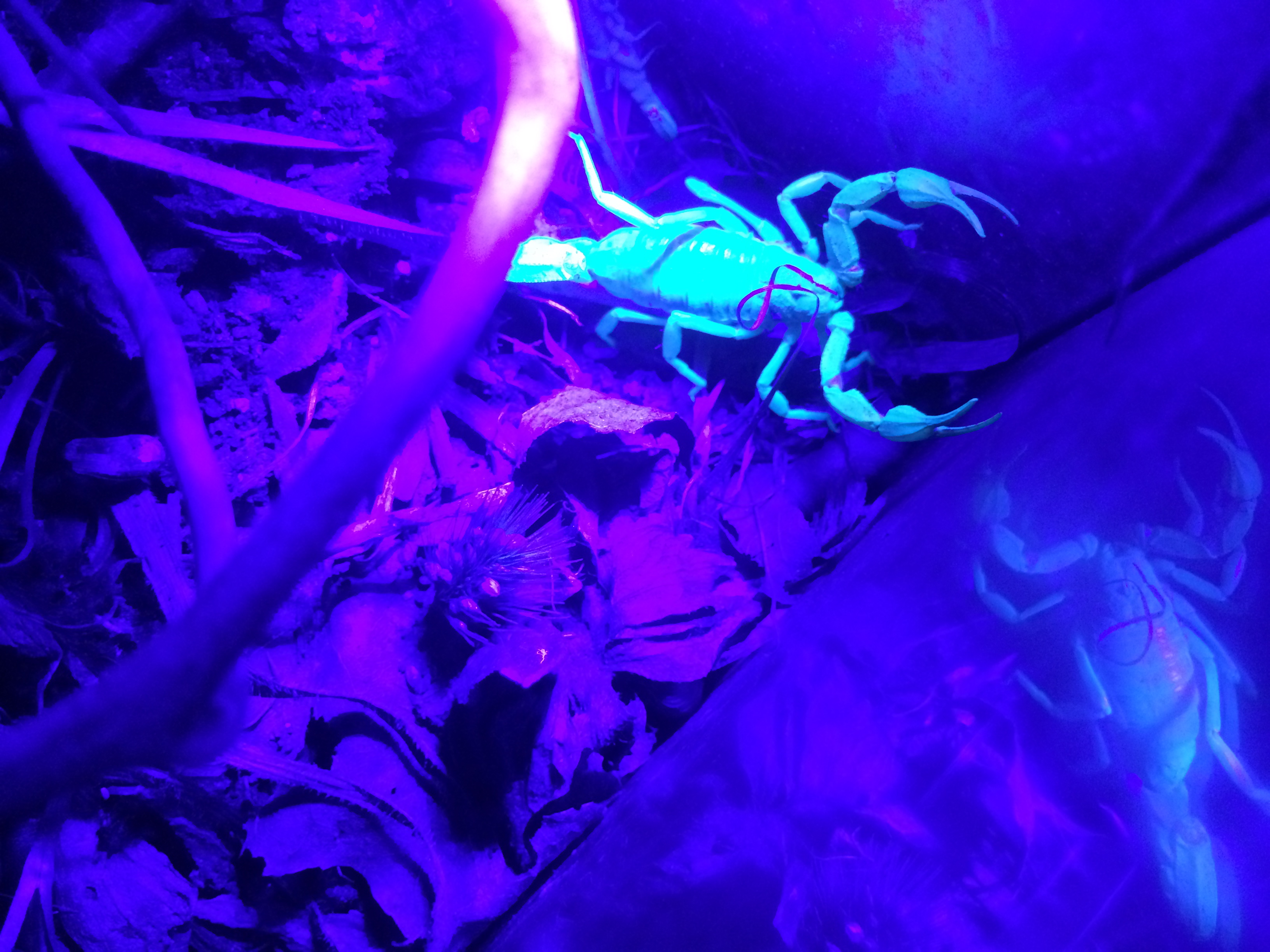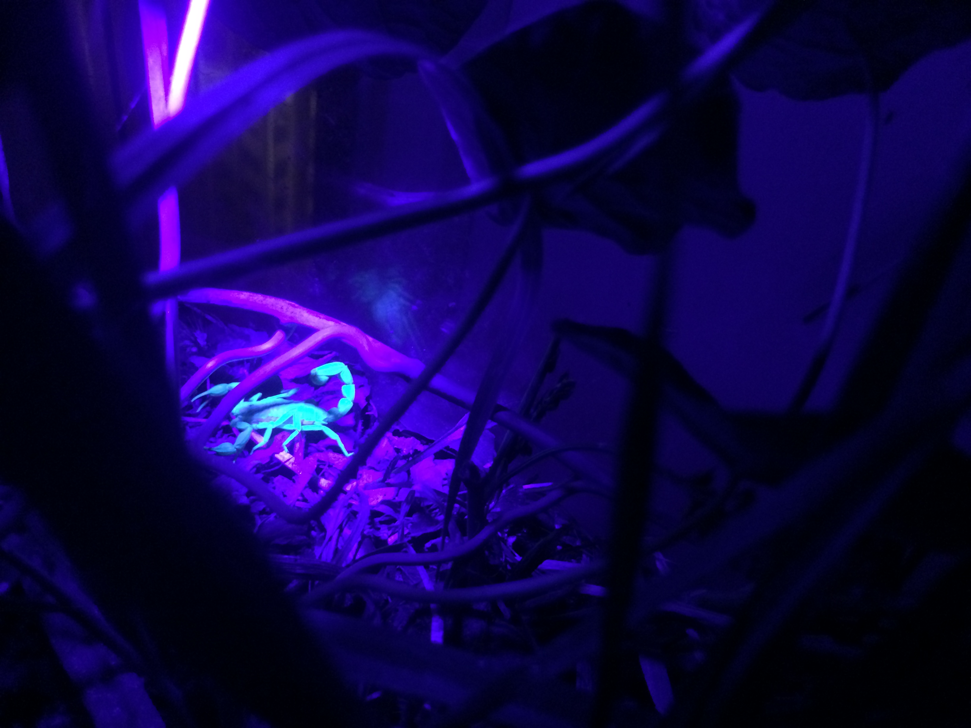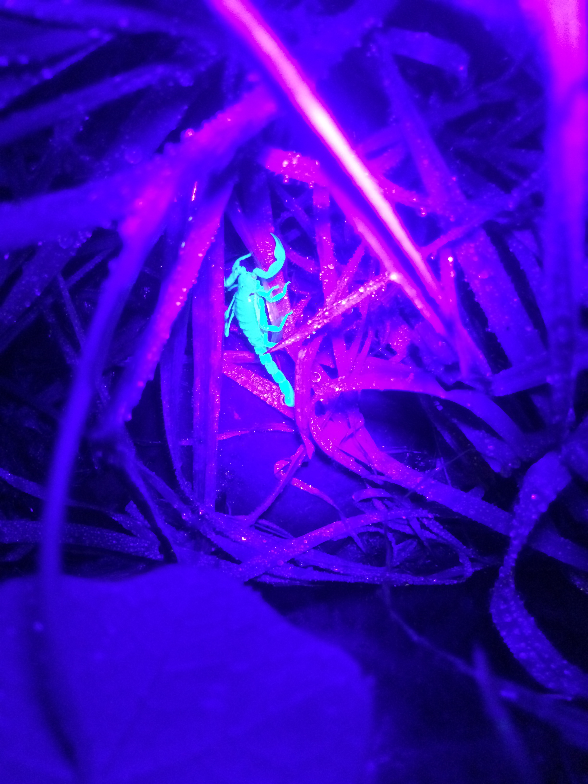 Better than Instagram, folks. Scorpions, for some reason, fluoresce when you shine an ultraviolet light on them. Few other insects and arthropods glow like they do, although some flat Polydesmida millipedes do. So whenever Kieran and I want to locate any of the scorpions living in his terrariums, we shine in a UV flashlight at night. They stand out like a neon sign!