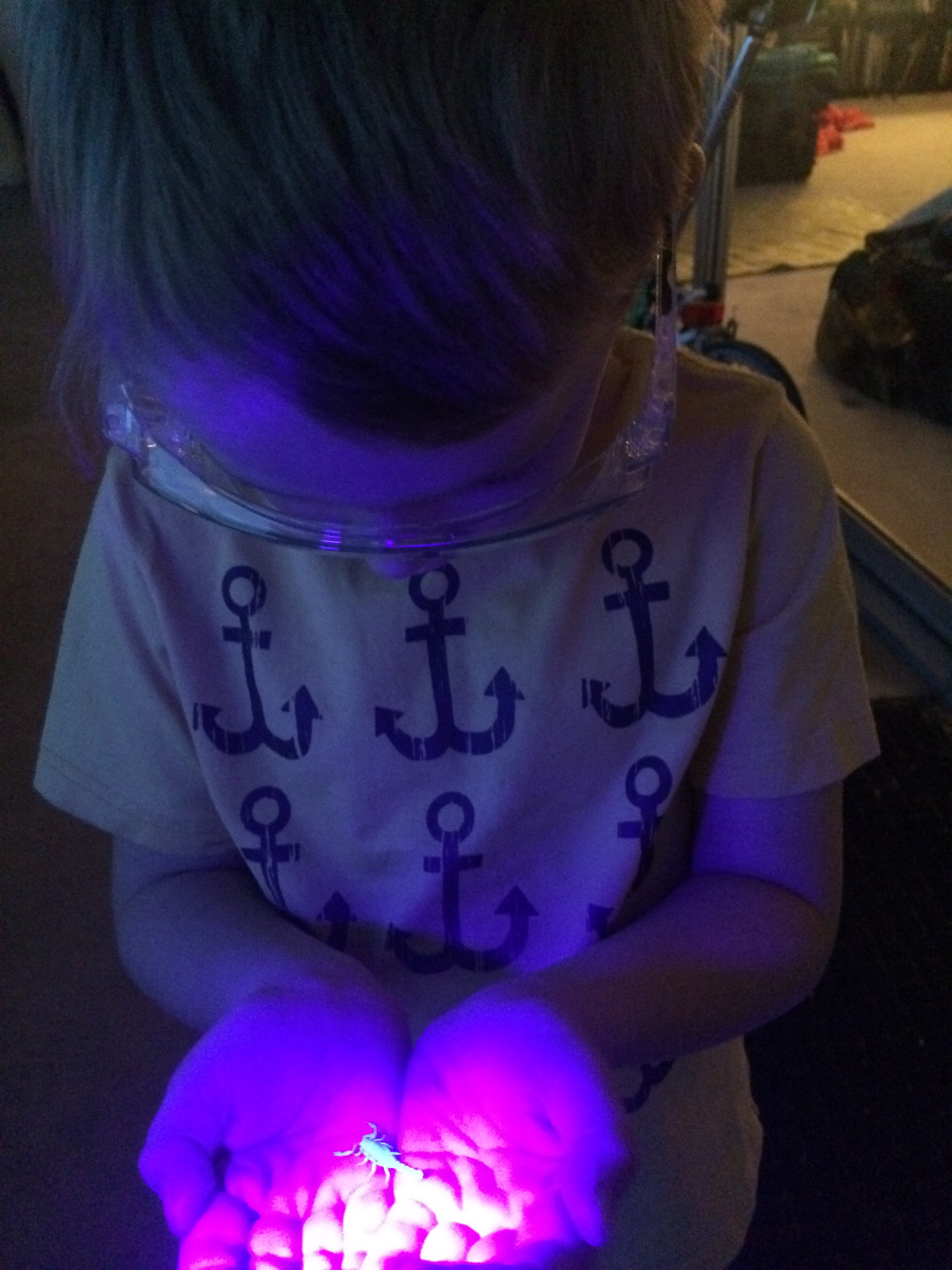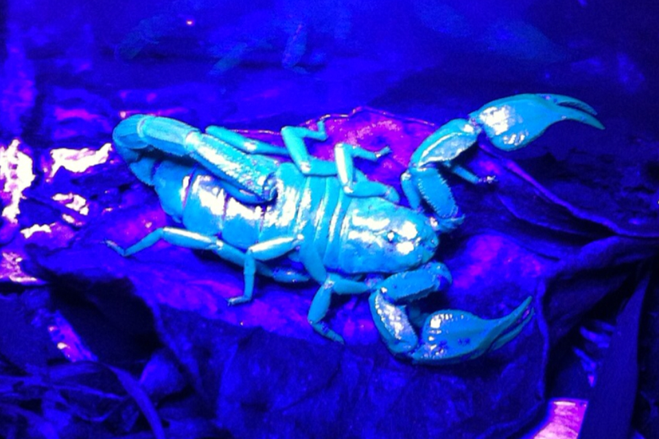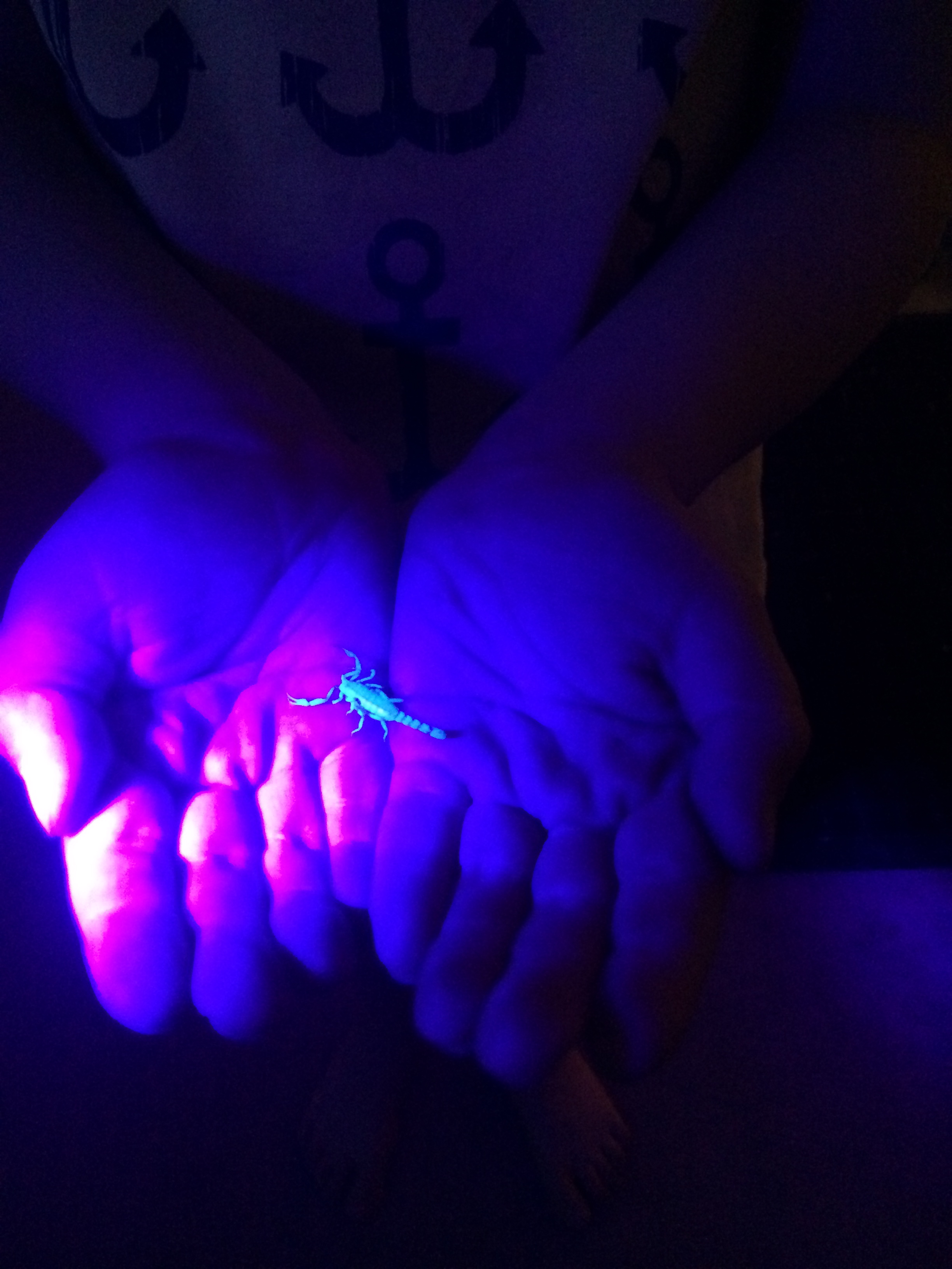 Better than Instagram, folks. Scorpions, for some reason, fluoresce when you shine an ultraviolet light on them. Few other insects and arthropods glow like they do, although some flat Polydesmida millipedes do. So whenever Kieran and I want to locate any of the scorpions living in his terrariums, we shine in a UV flashlight at night. They stand out like a neon sign!