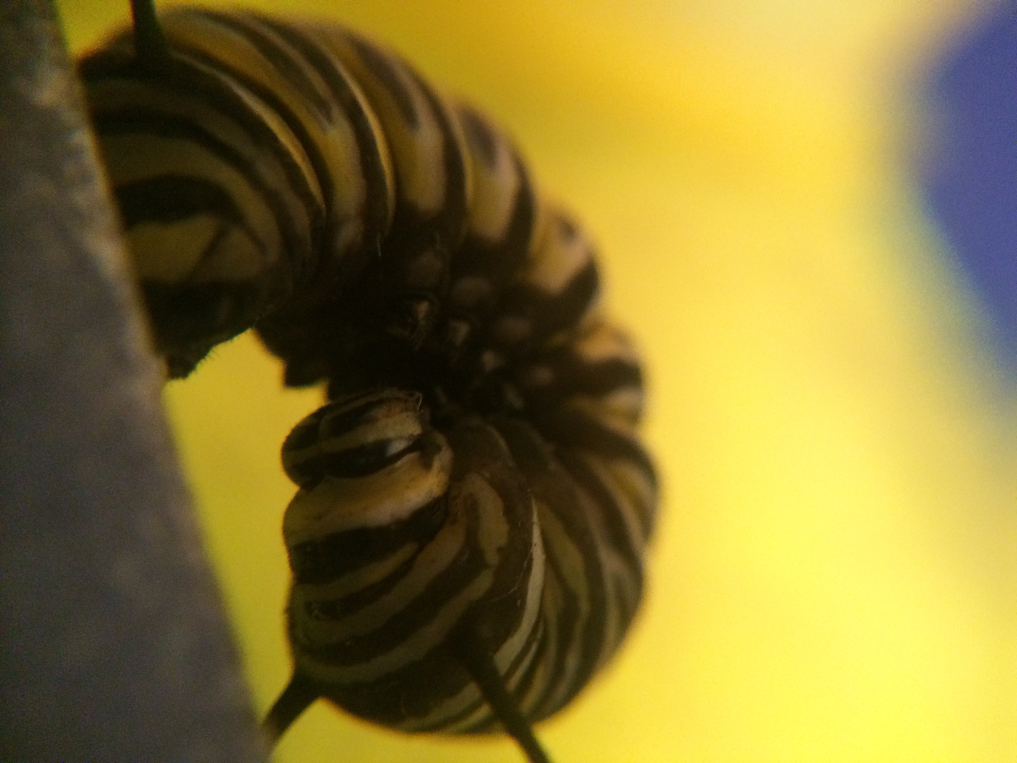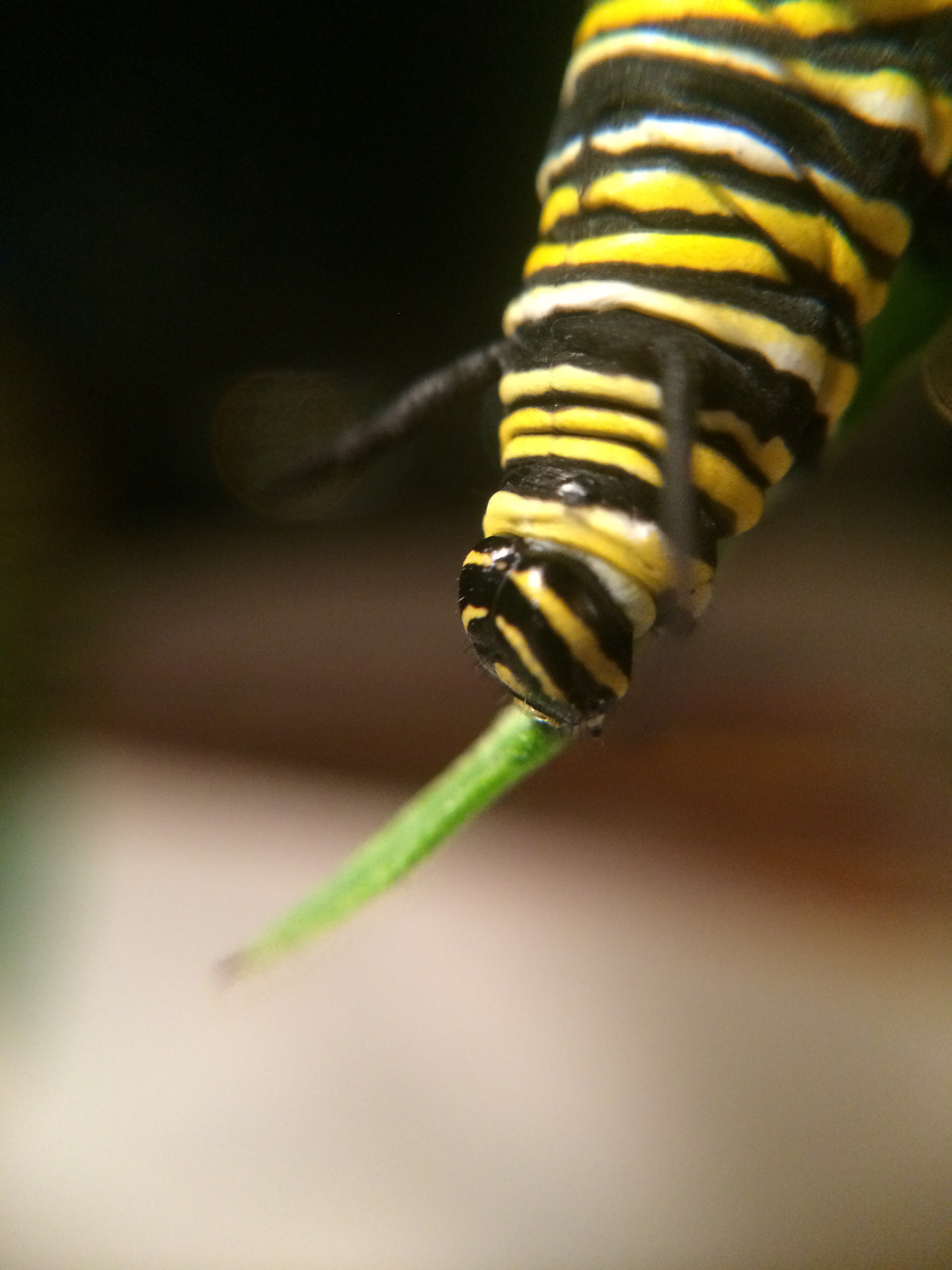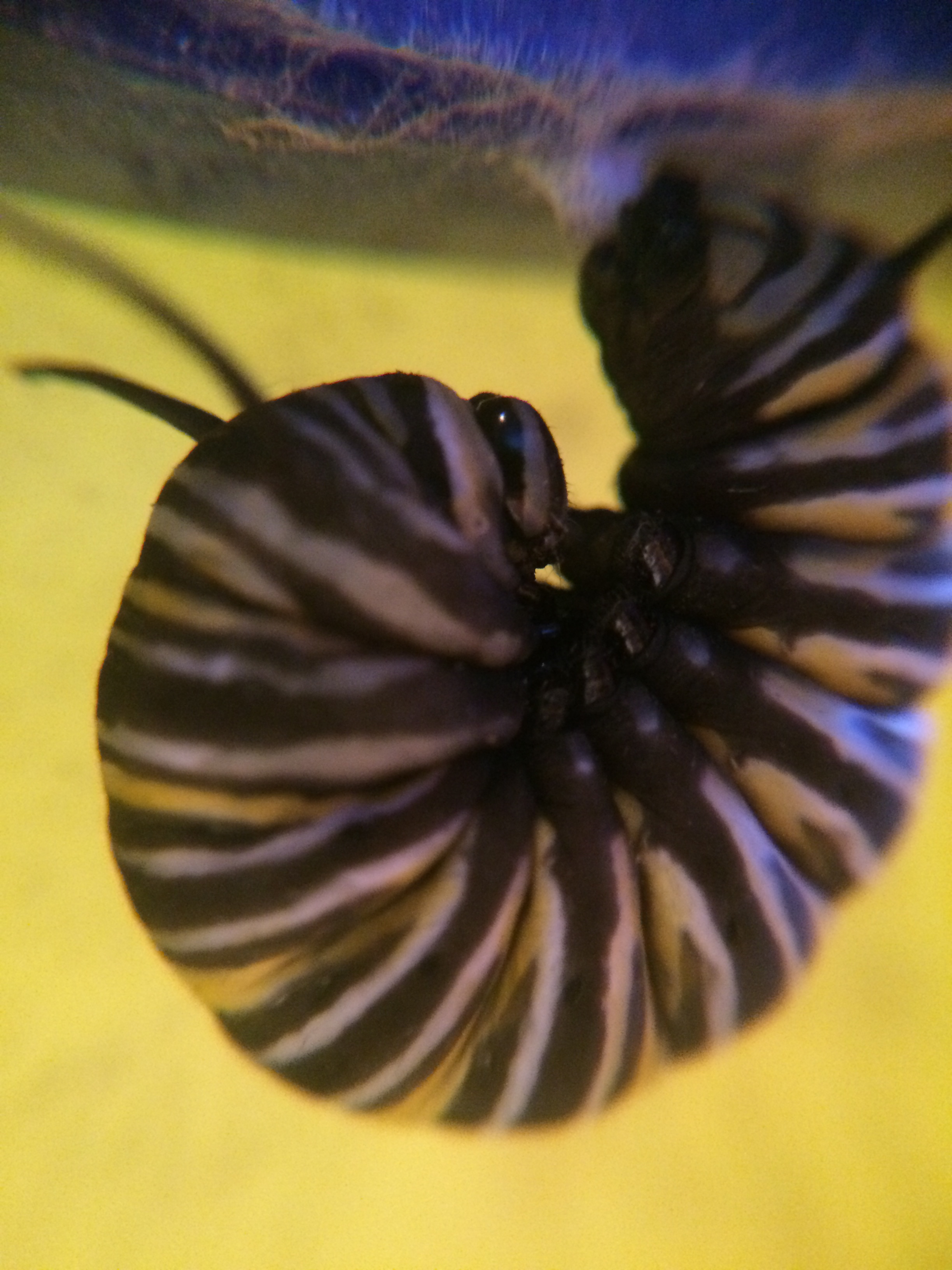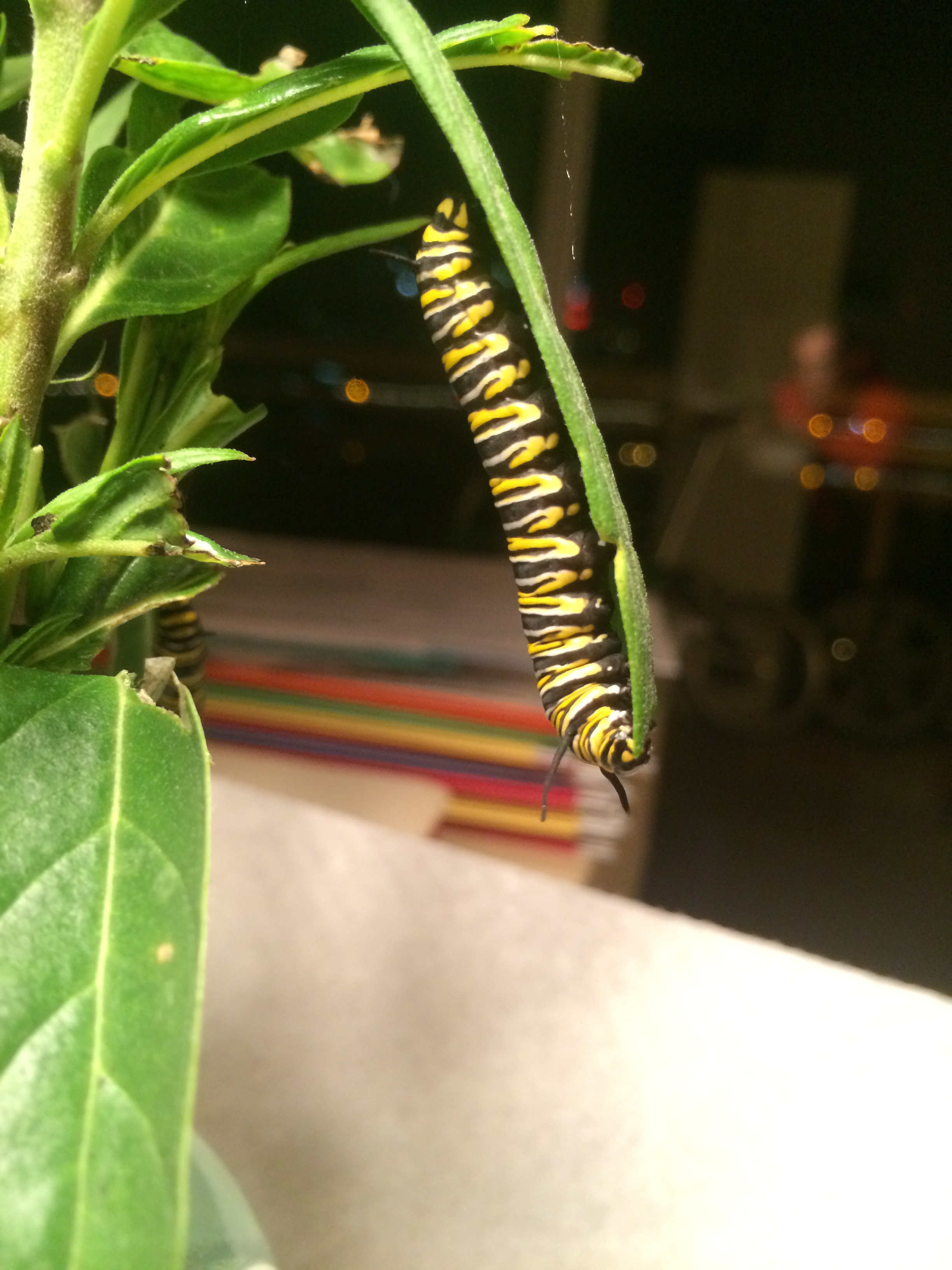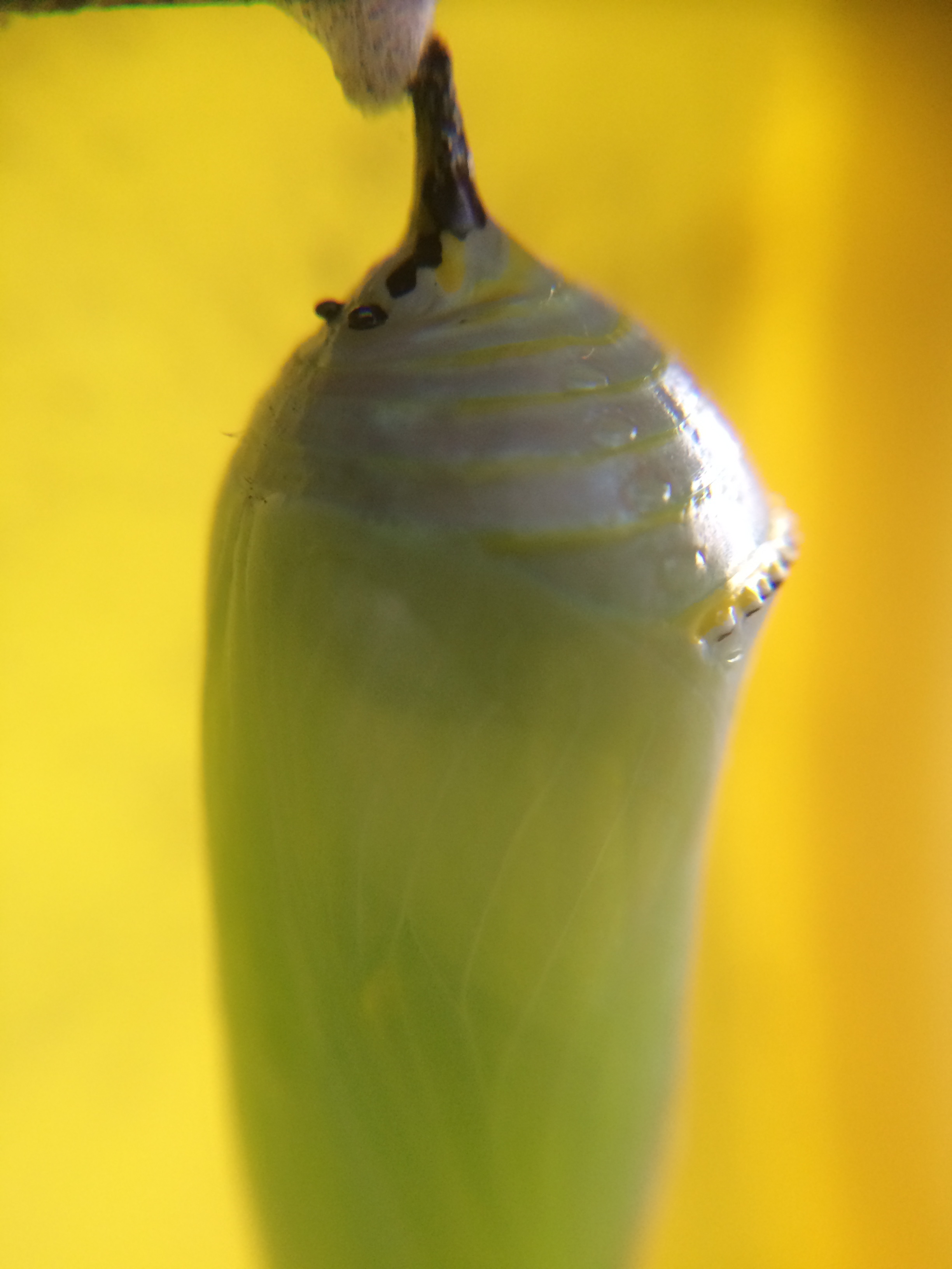 Yesterday afternoon, our fattest Monarch caterpillar became sluggish and lethargic. It crawled up to the roof of the net cage I’d put it in and suspended itself by a bit of silken thread. All day it hung there, sometimes stretched out lengthwise, head down, other times curled into a C shape. Overnight, the caterpillar transformed into a lovely green and gold chrysalis (the word comes from the Greek Χρύση, for gold), leaving a little wrinkled up pile of its elastic skin on the bottom of the cage. Our other two caterpillars ain’t far behind, and should be pupating soon. Right now they’re still focused on their “primary action item,” eating. We now have three chrysalises in our home — one Monarch and two Anise Swallowtails.