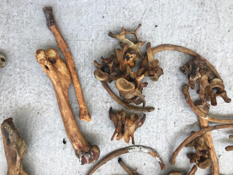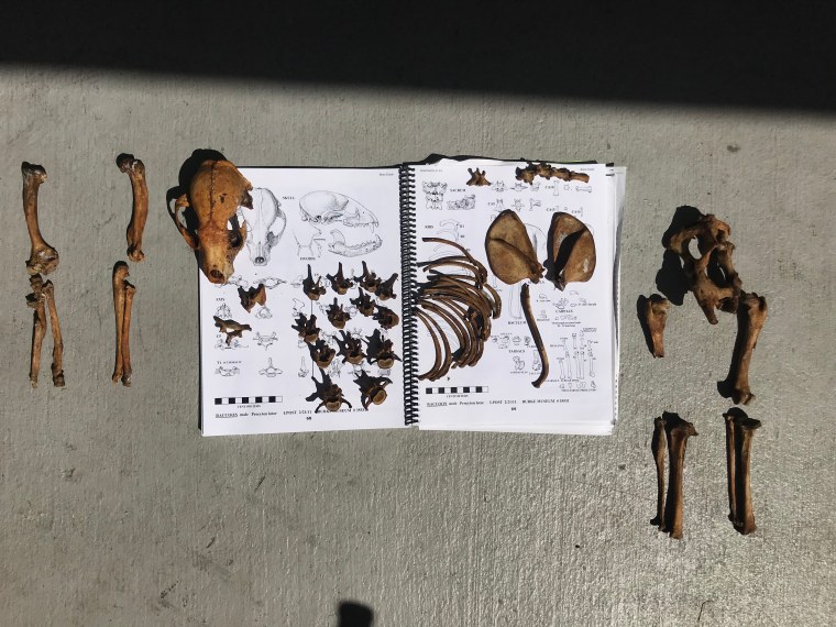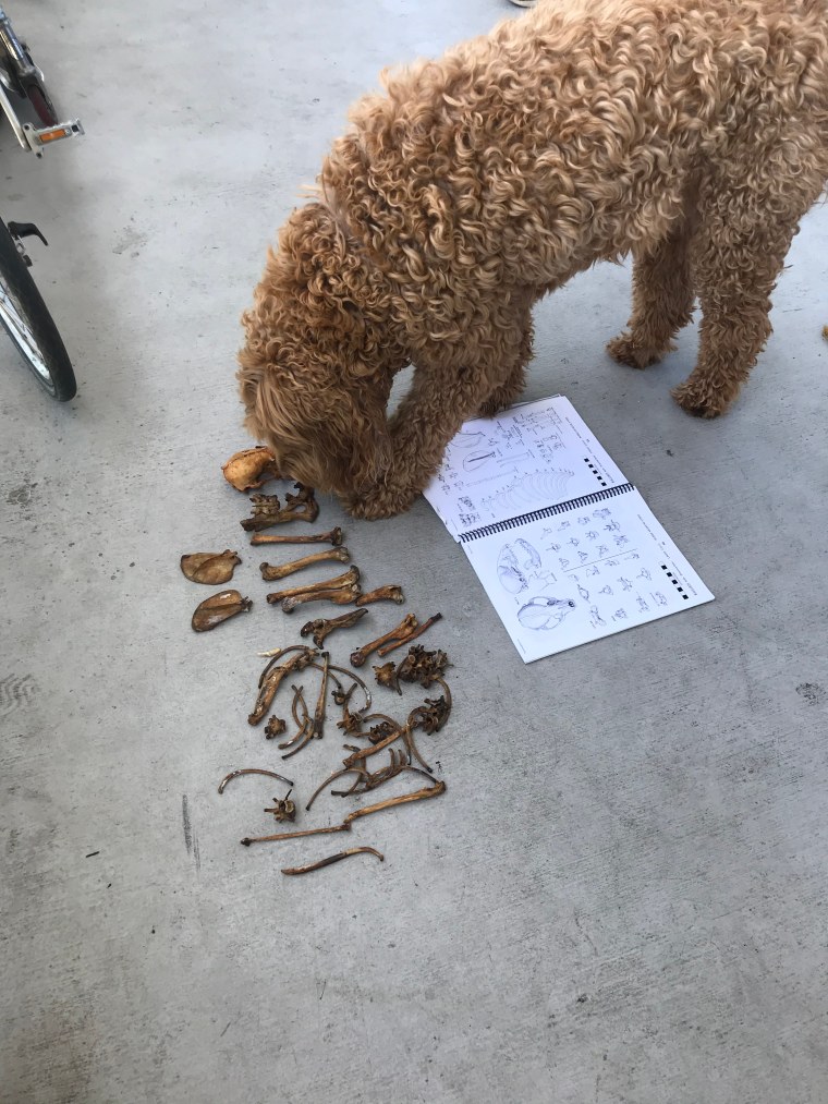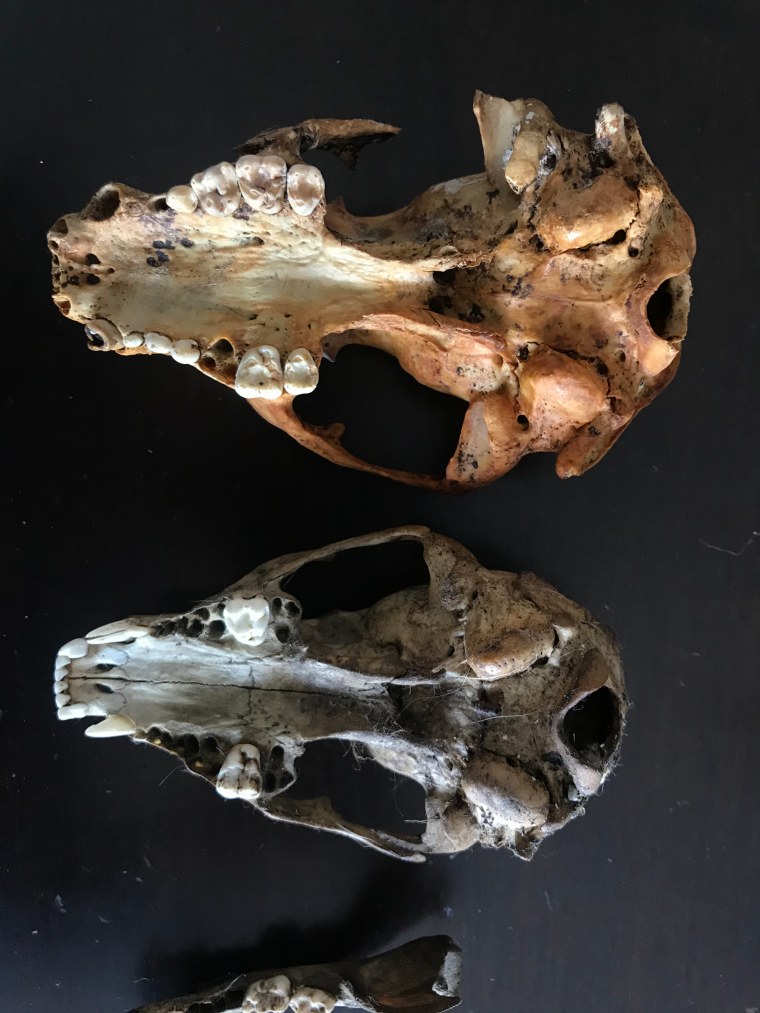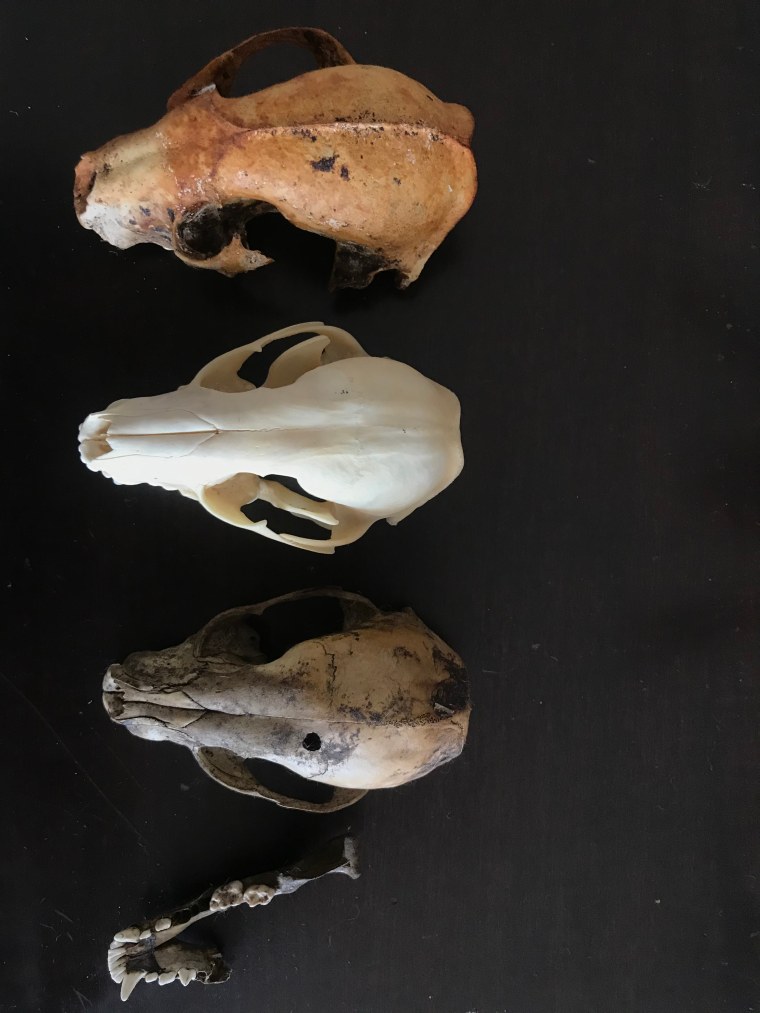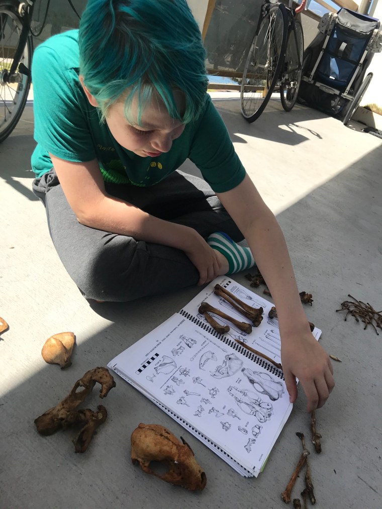 Using a handy guide to the bones of common North American mammals, Kierán began classifying them. We know our specimen was a male because it has a baculum. This was a large specimen, as its skull is bigger than the two other raccoon skulls we have here at home. One skull Kierán spotted earlier this year in a lakeside park here in Oakland — it has a suspicious .22 caliber-sized hole in it that makes us suspect it was trapped and executed, like many of the wild pigs whose skulls we’ve found on Mt. Diablo.