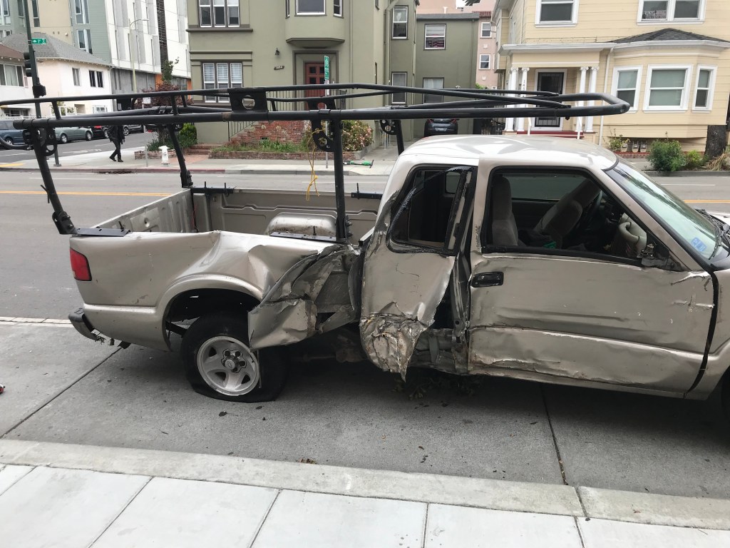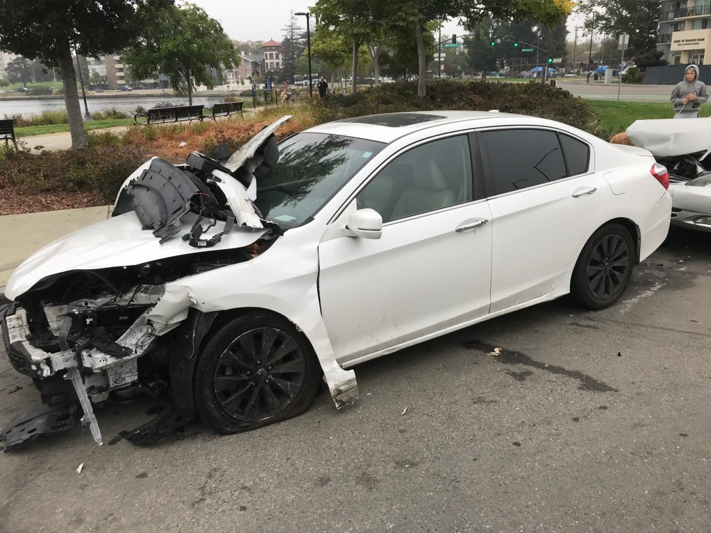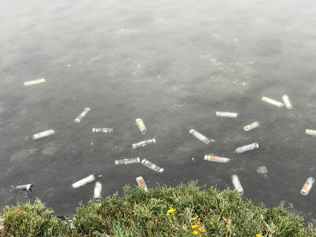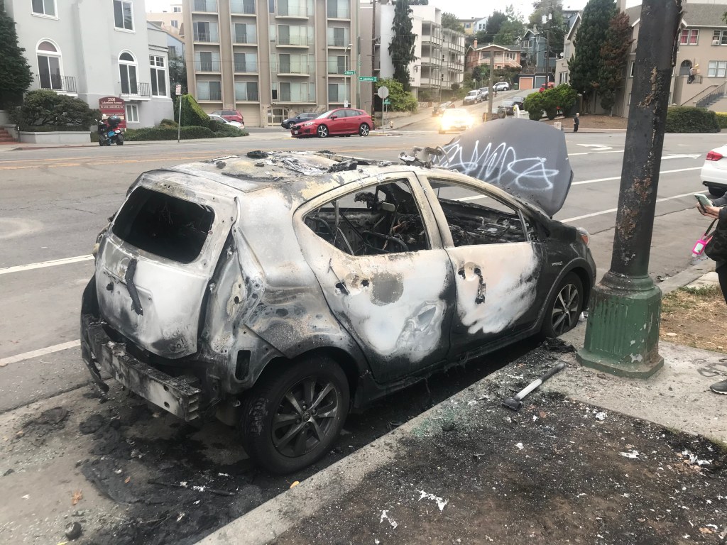 Brown pelicans and cormorants rest on floating booms in Lake Merritt.Other birds, like the great egret (Ardea alba — or Casmerodius albus, if you’re old fashioned) and the enormous white Pelecanus erythrorhynchos, just visible at the upper right, stick close to the feeding frenzy.One of the unpleasant things about living by Lake Merritt is that people use it as a trash can.Though the downtown area around Lake Merritt was beautifully designed as a city center to attract people, lately it has been attracting destroyed vehicles.When the pelicans party, they don’t trash the neighborhood.The birds don’t start fires or shoot off explosives, either.Note the orange “violation” tag. No kidding.