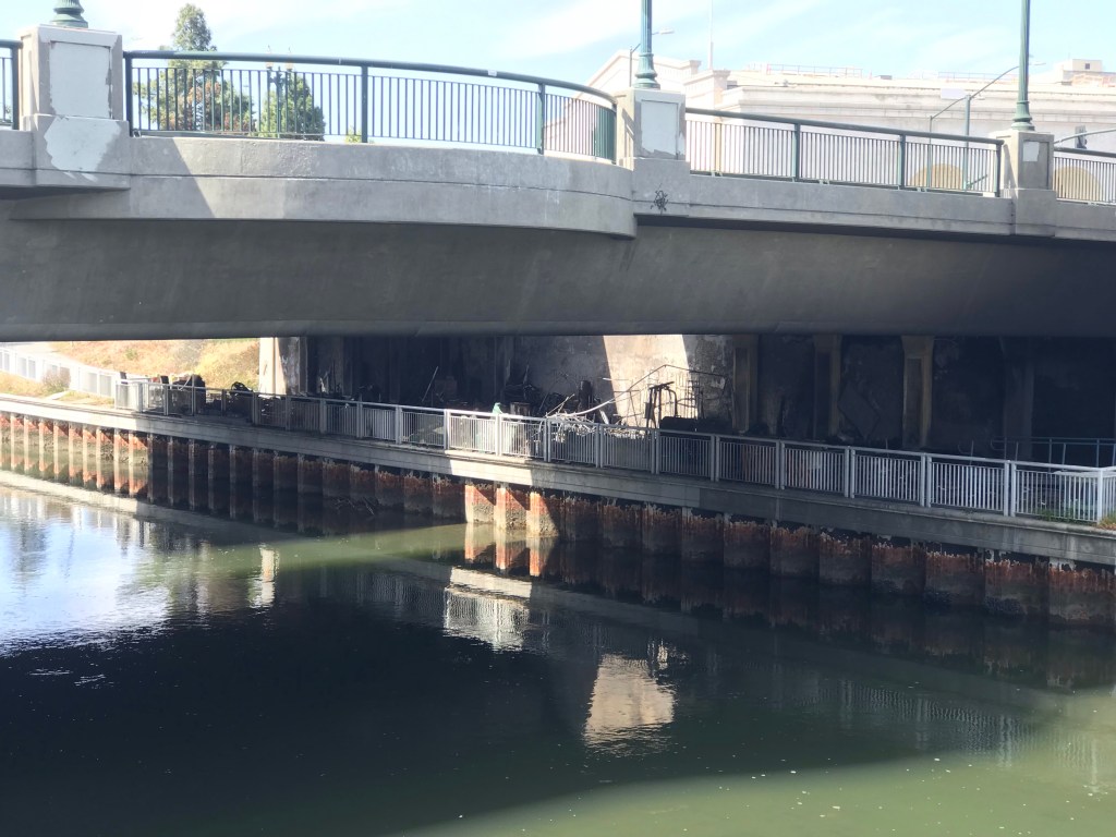 Explosions and fierce fire under the 12th Street Dam in Oakland. About 7:50 pm, several loud, deep booms shook the area. A longtime homeless tent camp burned for 20 minutes, with explosions — pop! pop! pop! — all the time. The tents, covered with heavy plastic tarps, burned intensely. Oakland firefighters put the blaze out by 8:15 and are now down in the charred slag with flashlights.