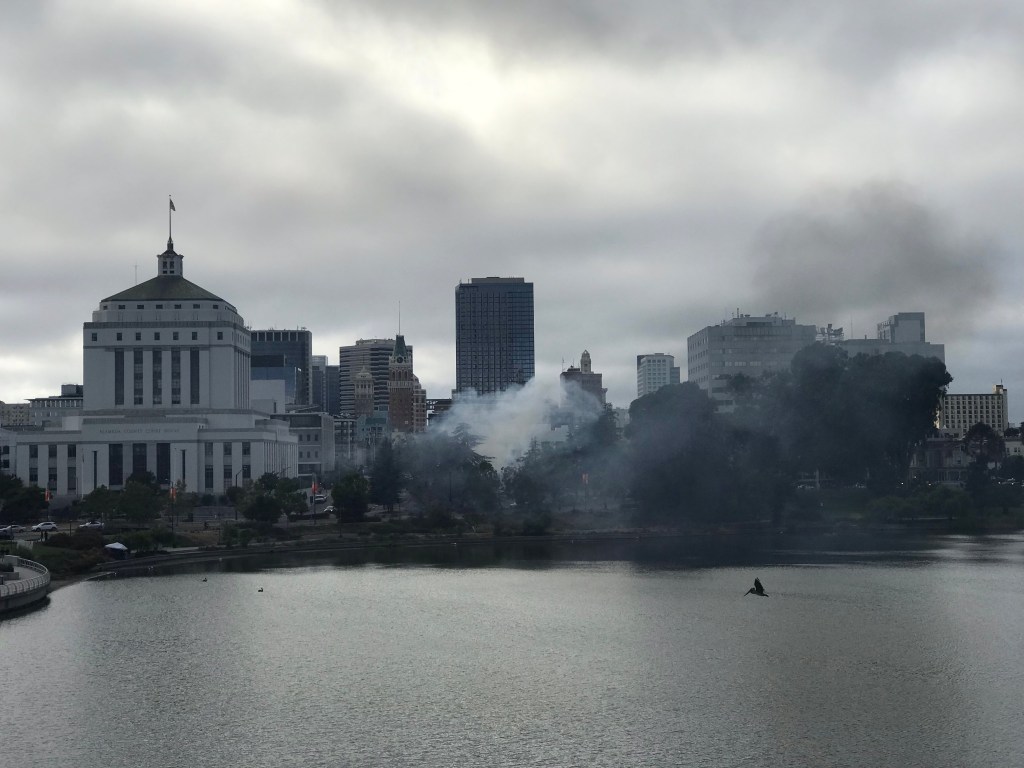 As revelers gathered Saturday evening for a wedding party at Camron-Stanford House beside Lake Merritt, a fire started in an adjacent homeless camp. Clouds of acrid smoke drifted across the wedding venue. The camp, a handful of tents, is across the street from the 1930s-era Alameda County Courthouse, but it hasn’t been cleared out.
