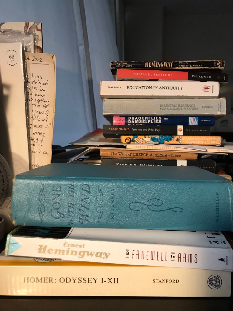 Mitchell? That’s a 1936 edition, pre-WWII. Since covid came along, much of our way of living is gone with the wind. The Hemingway critical essays belonged to my mother-in-law, a woman I never met; it has her scribblings inside, which give me some imagined insight into her mind. And A Farewell to Arms states Hemingway’s existential philosophy quite clearly — “We were all cooked. The thing was not to recognize it.” Keep calm and carry on.
