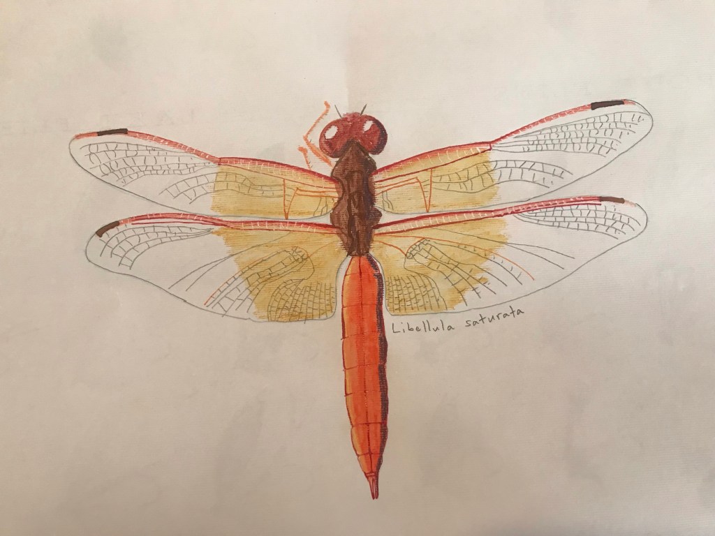 This time, I wrote about my day photographing pollinators in the Lakeside Garden. (A man was shot yesterday afternoon just outside the garden, across the street from my son’s school, but I’d already mailed the letter). I painted a large image of the Libellula saturata we caught.