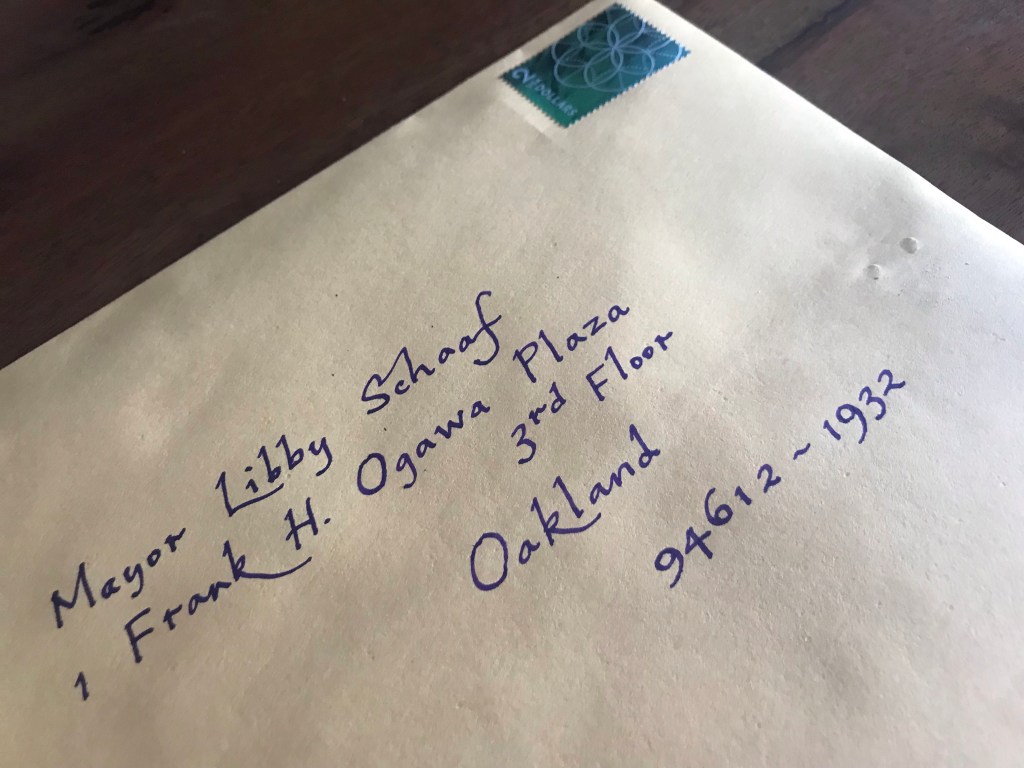 Every August I write a letter to Oakland’s mayor, Libby Schaaf. This was the third year I sent a long, handwritten letter to her City Hall address. I keep the letters half positive and half negative — I don’t just complain. Who knows if she even gets them or reads them or cares. But it is cathartic to write them.