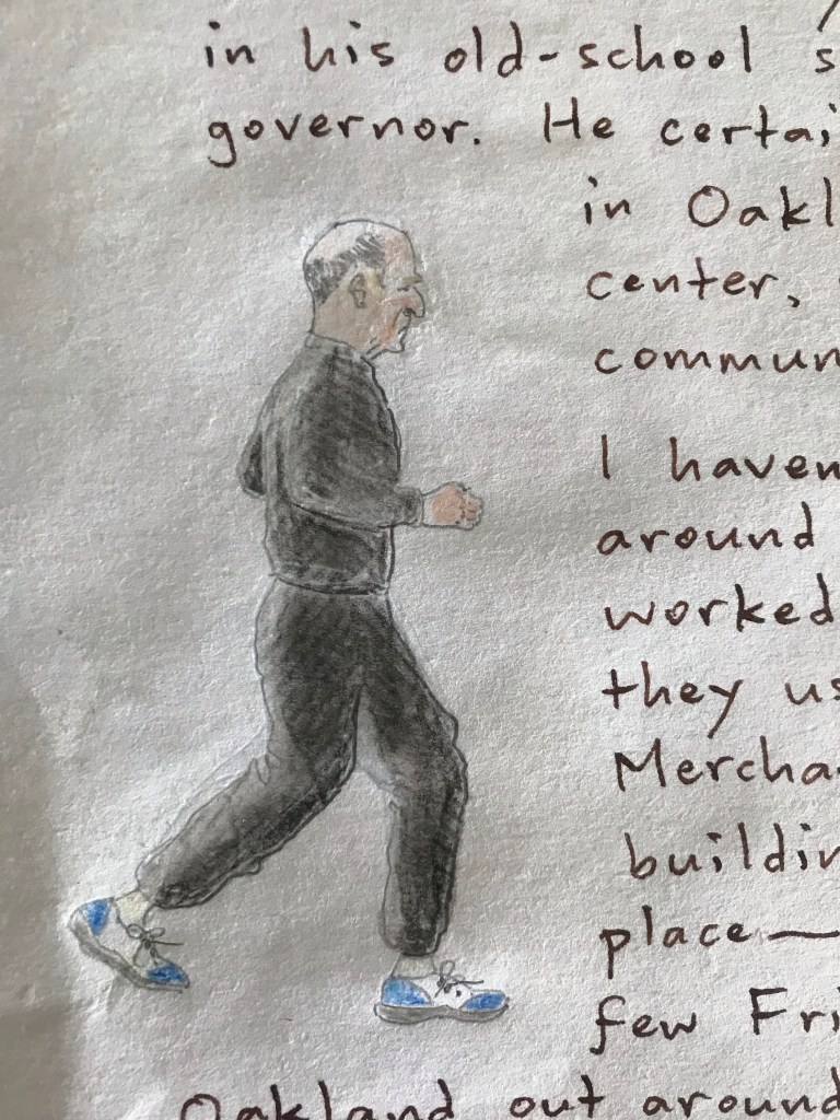 Last year, I wrote about diving pelicans and drew a picture of our former mayor, Jerry Brown, who used to jog around Lake Merritt. I’ve not seen Mayor Schaaf out there.
