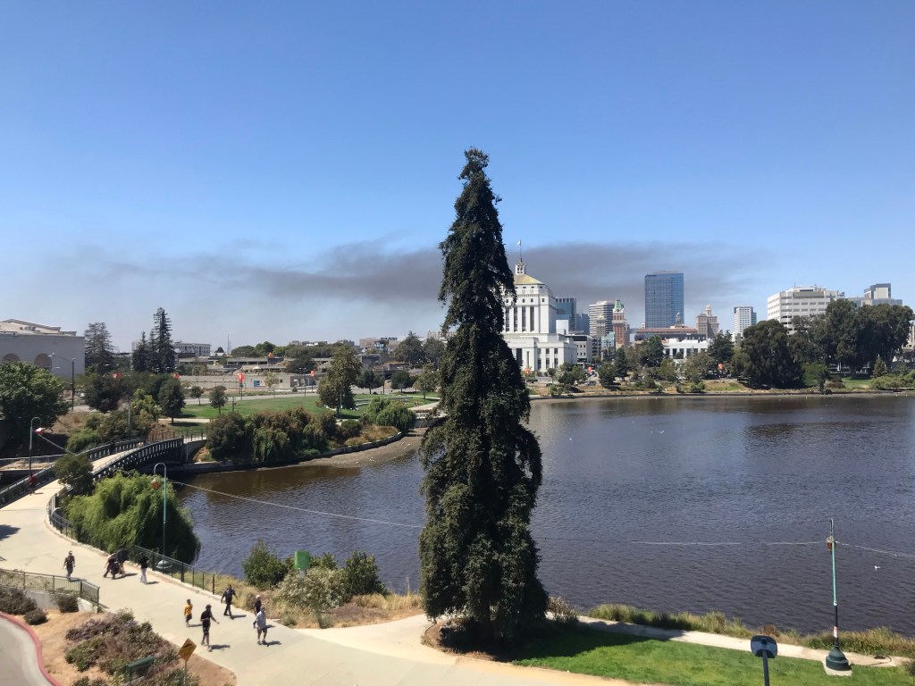 Tuesday afternoon and the spreading smoke of yet another homeless encampment fire in Oakland. These fires happen often — one disrupted a recent wedding at Lake Merritt. Another destroyed half a dozen tents under the estuary bridge (where people are already setting up tents again). And one shut down traffic on Interstates 580 and 880. Oakland’s politicians don’t do much about this perennial problem.