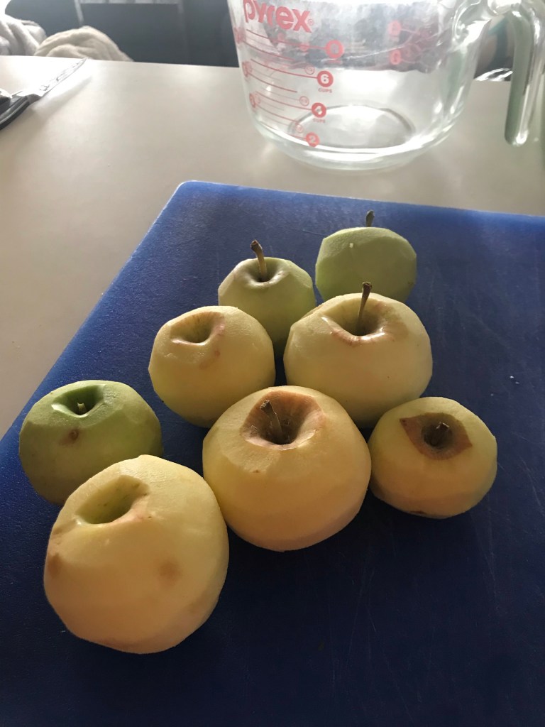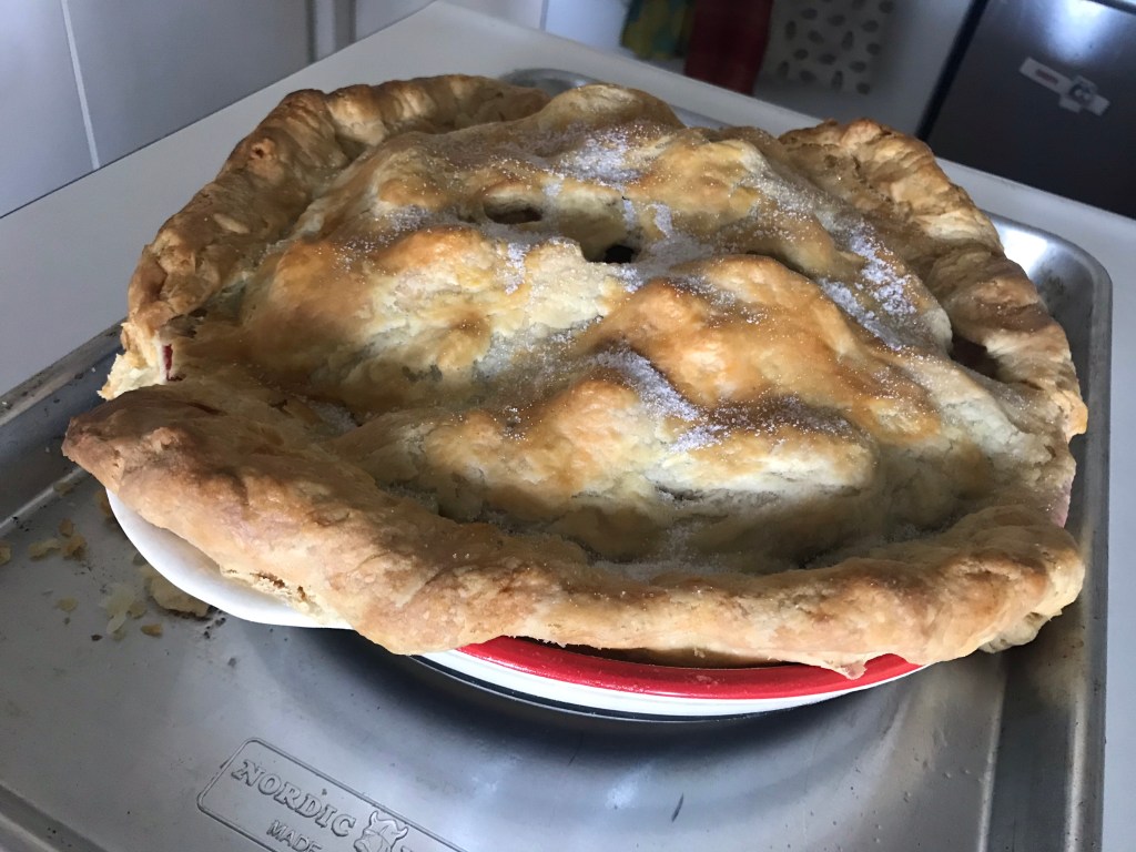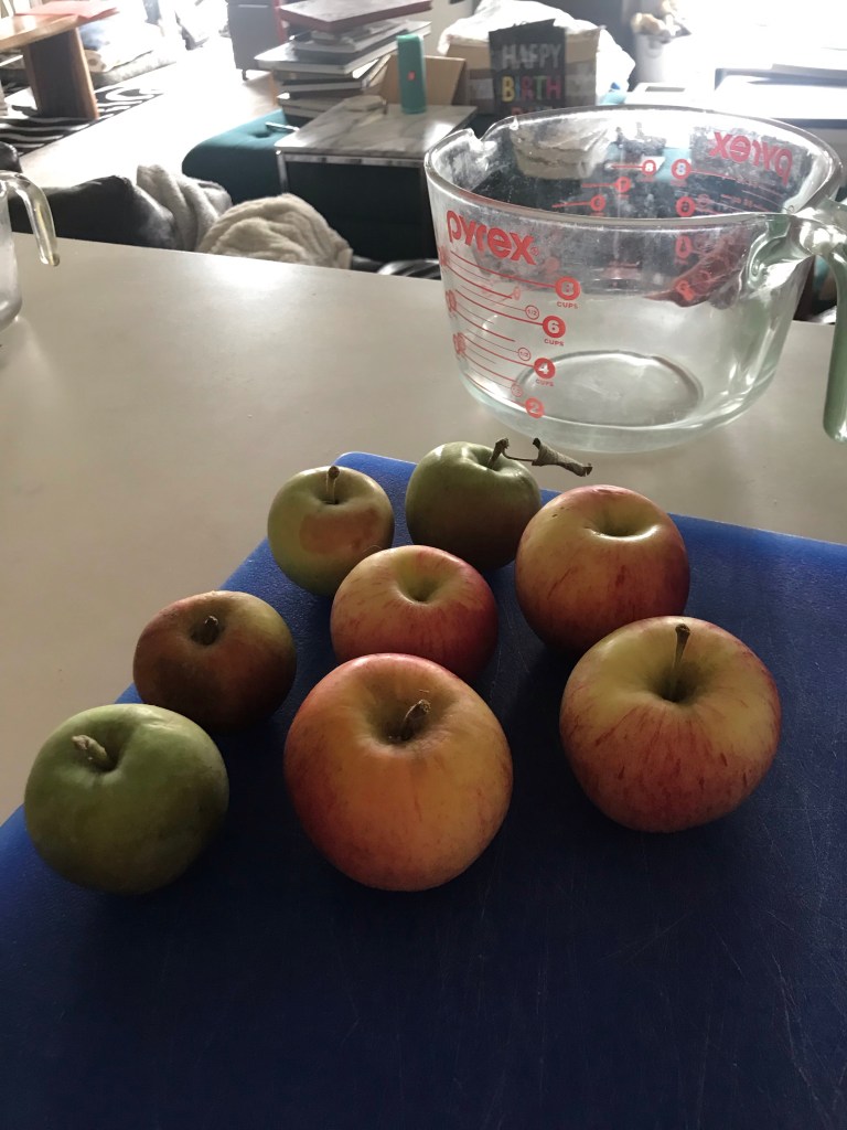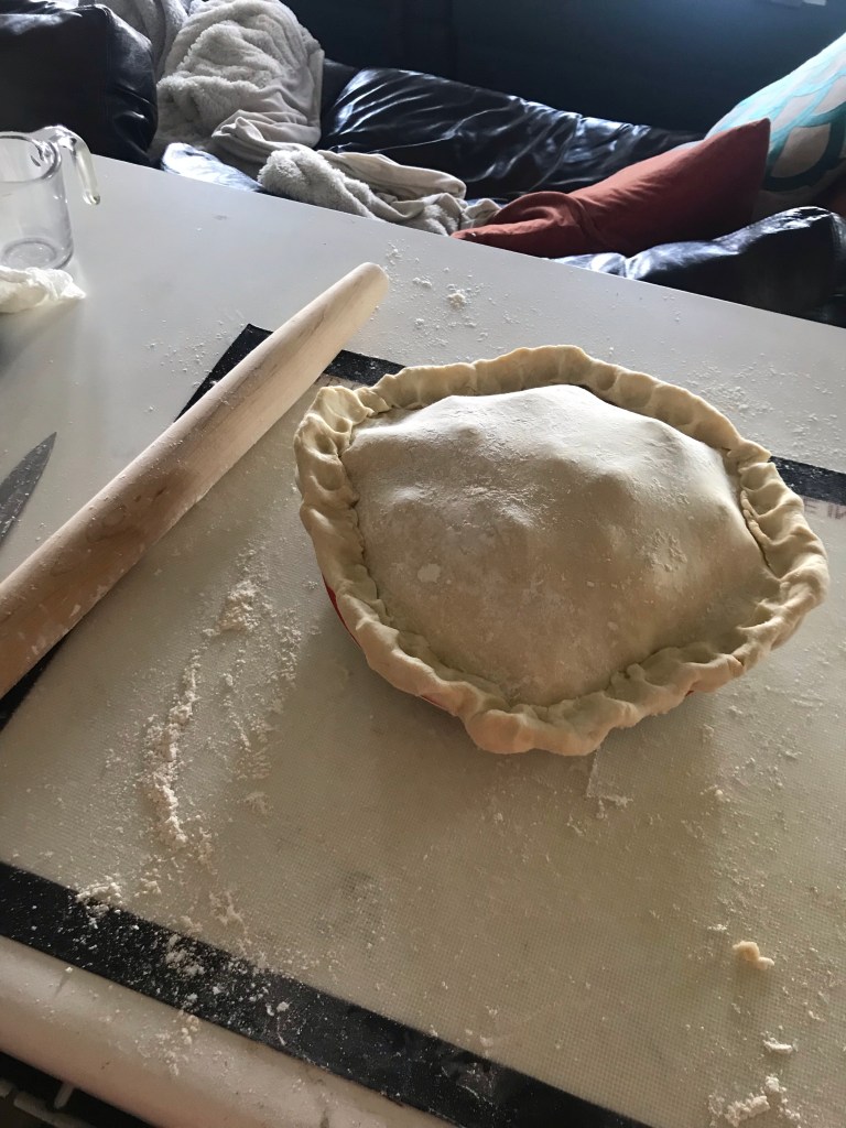 A friend with apple trees gave me a bag of apples yesterday, so I made a pie with them today. They were different sizes and sorts of apples, so it will be a hodgepodge of a pie! I spiced the apples with lemon juice, nutmeg, cinnamon, allspice (first time I’ve tried that) and sugar.