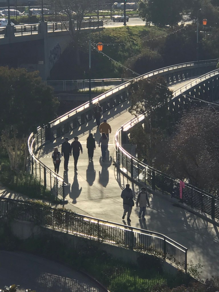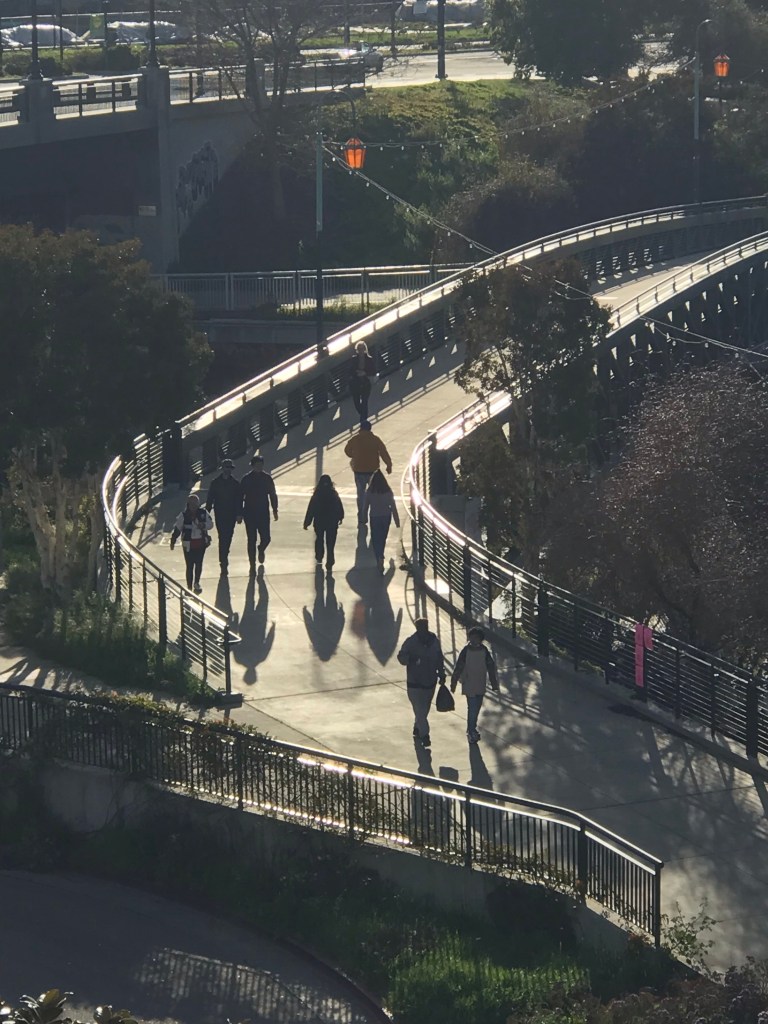 People walking with their shadows on the pedestrian bridge over Oakland’s Lake Merritt Drain Monday evening.