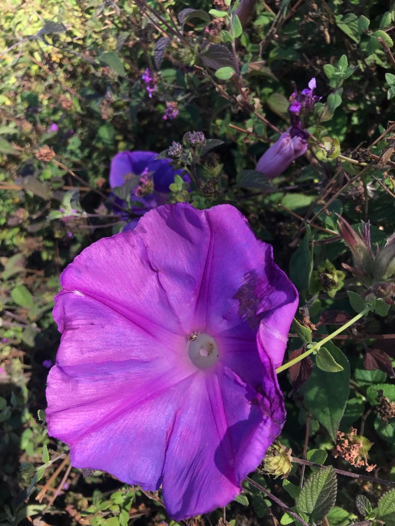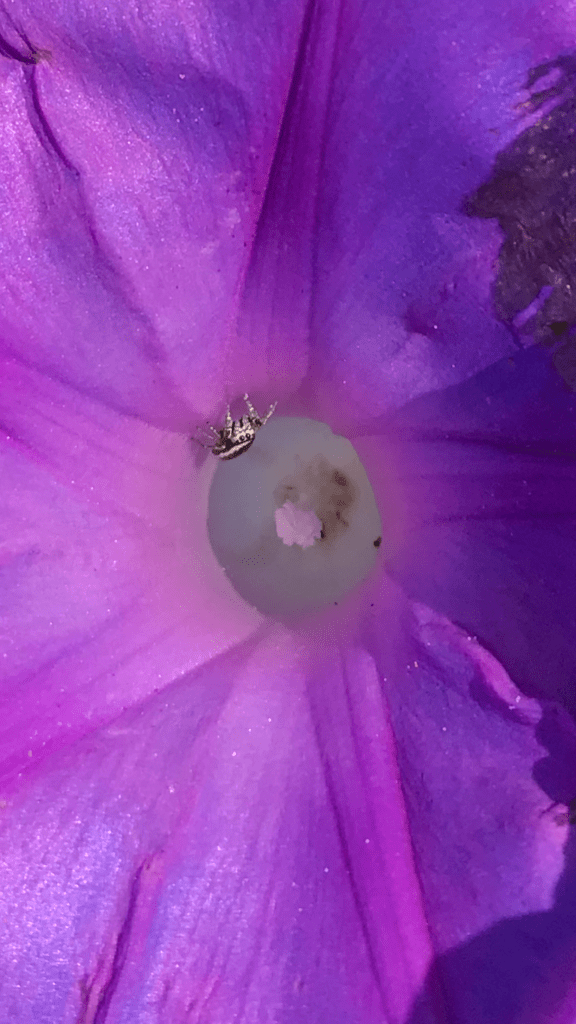 I saw this tiny jumping spider in a morning glory in Oakland’s Mosswood neighborhood. It’s probably Metaphidippus or Pelegrina — both genera have at least six similar species known in California.