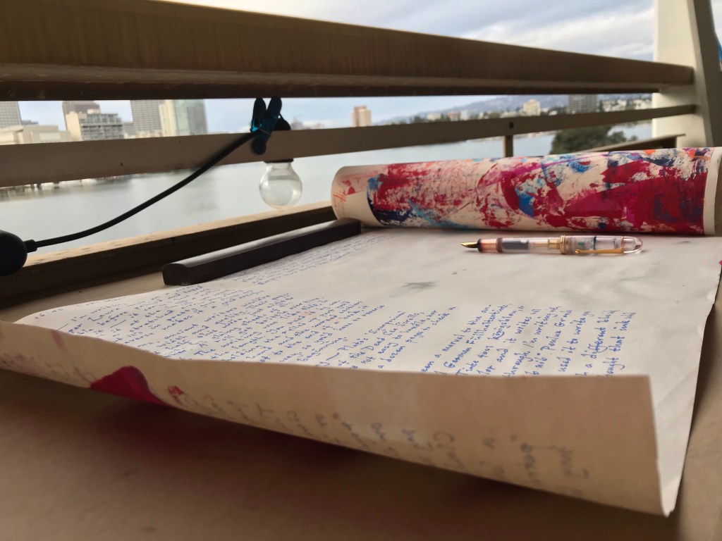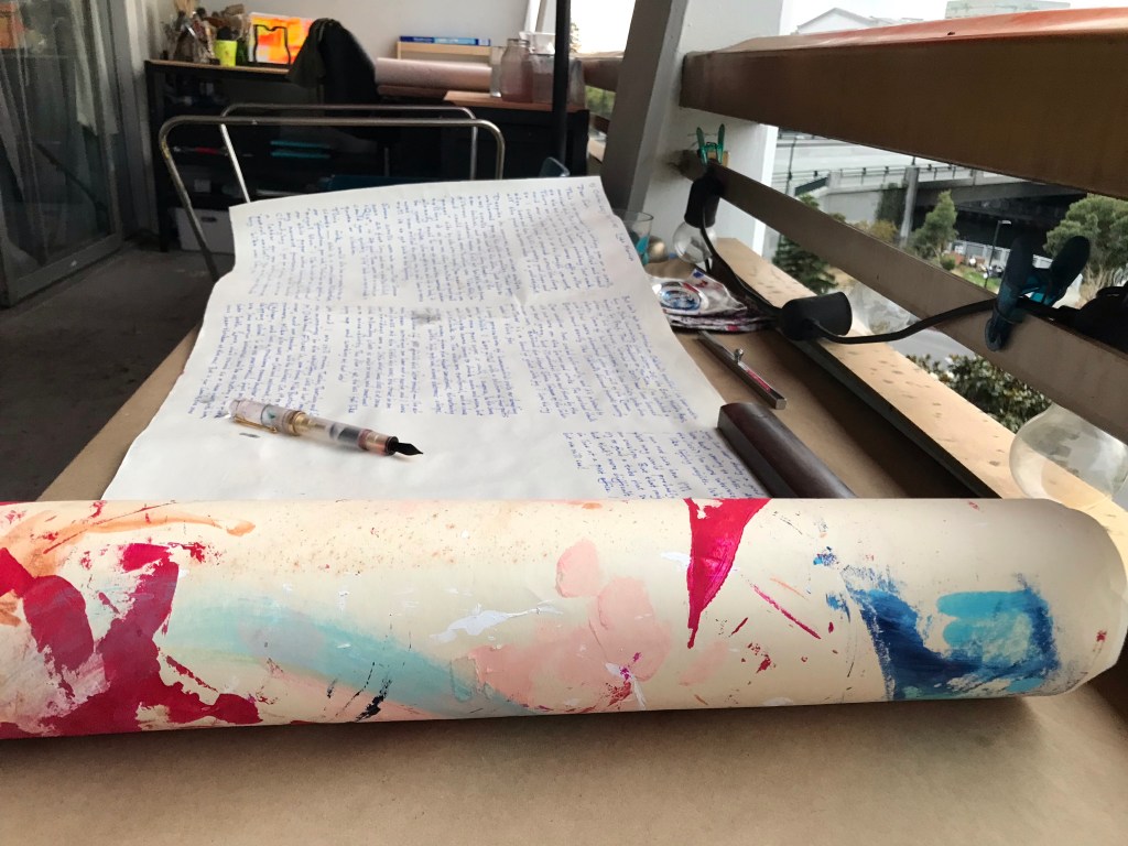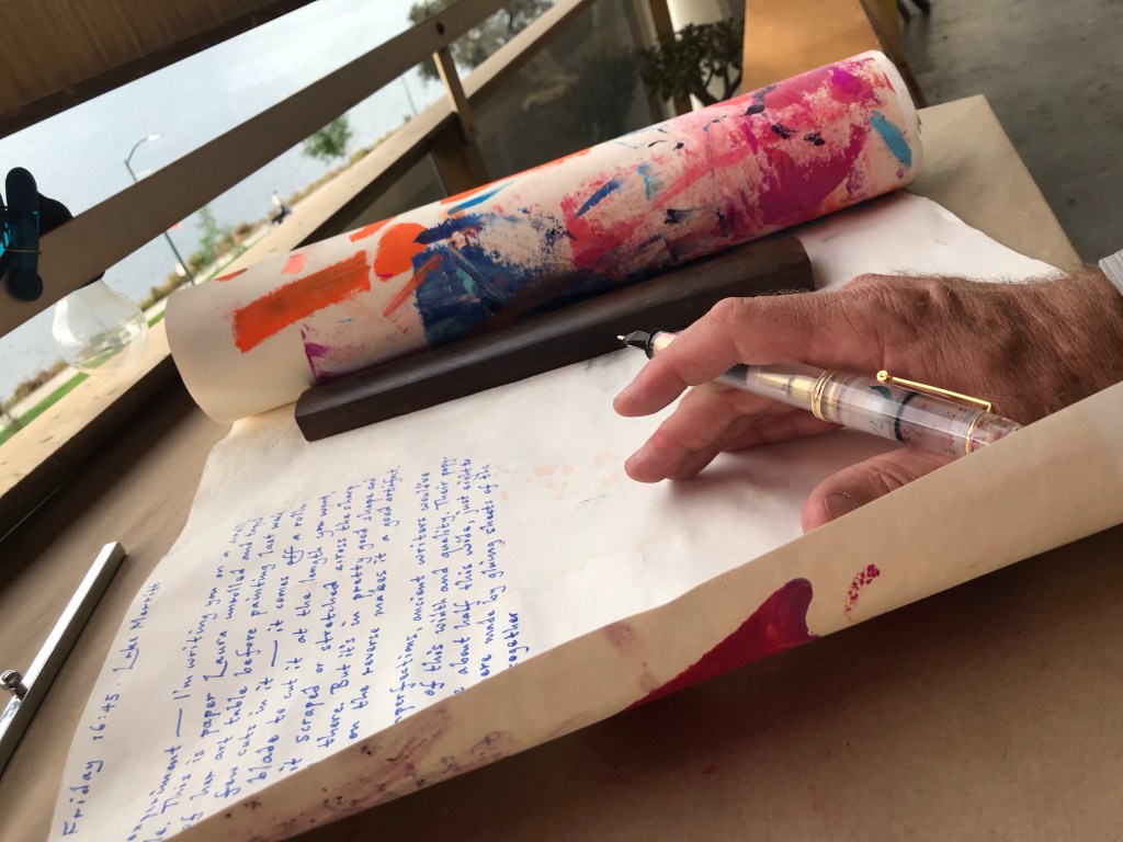 I’m writing ancient style, on a scroll. Of course, modern paper is much smoother than papyrus! And the Pelikan königsblau ink is just a century old recipe for fountain pens, not what scribes used to copy out, say, the 22-foot-long scroll holding Plato’s Symposium!